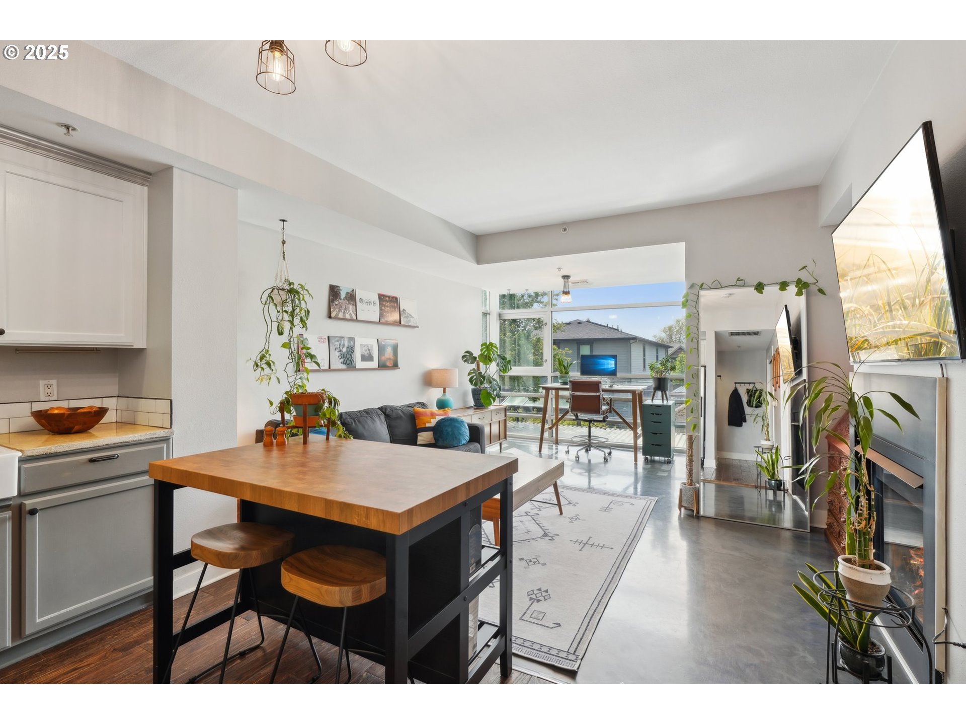 Live Stylishly in the Heart of Belmont!Tucked in one of Portland’s most walkable and eclectic neighborhoods, this quiet and contemporary one-bedroom condo blends urban sophistication with everyday comfort. Dramatic floor-to-ceiling windows (with UV protection and motorized electric blinds) flood the space with natural light, highlighting chic wood and polished concrete floors. Cozy up beside the sleek double-sided fireplace or entertain from your beautifully remodeled kitchen, complete with a farmhouse sink, concrete counters, gas stove, and gleaming stainless steel appliances. The bathroom is equally impressive—tastefully updated with classic hex and subway tile and a modern walk-in shower. Enjoy the convenience of in-unit laundry, your own private balcony/patio, central AC, and a personal 9x6 storage unit in the secure basement. The mounted 55” TV is included, too! This gated, secured building offers covered, designated parking, and sits just moments from Mt. Tabor Park and the best of Belmont’s vibrant scene—local cafés, eateries, shops, and quick access to Division and Hawthorne. Whether you're downsizing, investing, or craving low-maintenance city living, this one-level gem checks all the boxes. Mortgage savings may be available for buyers of this listing.