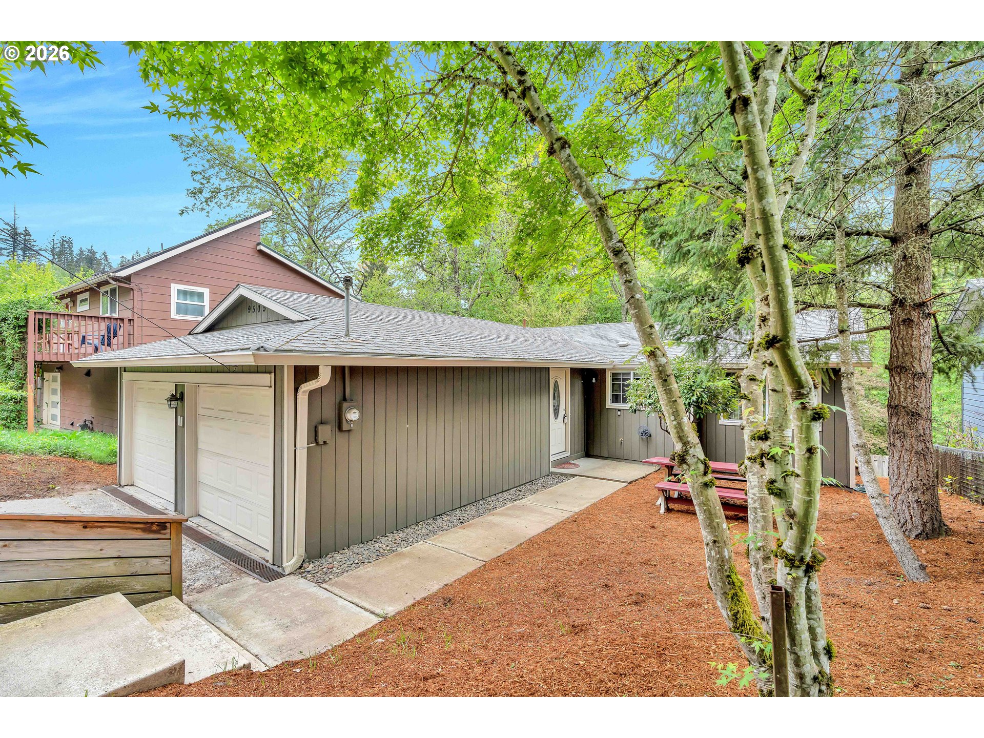 Tucked away at the end of SW 30th, this custom 2018-build gem offers your own private slice of SW Portland, with a mid-mod nod at the approach. Modern yet warm, move-in ready, and all on one level, this home is ready for its next stewards. Enter into the spacious great room, with vaulted beamed ceilings, statement stone-like fireplace, and rich engineered hardwoods throughout. Daylight streams through the distinctive, geometric windows, creating a vibe of relaxing in the privacy of your own contemporary lodge. Curl up by the fireplace with a book, host guests for brunch or game day, and squeeze everyone onto the couch for movie nights. Leet your inner chef shine in the updated kitchen. Quartz counters, ample storage, stainless steel appliances and a large peninsula w/ seating space - we love to see it, especially when paired with the sizable adjacent dining area. The bedrooms feature high ceilings, plush carpet, and generous closets w/ built-in organizers. Both the dual-vanity bathroom and the dedicated laundry room are just down the hall, making this layout smart without sacrificing space or flow. Out back, a fully fenced yard with a fire pit and crushed gravel seating area is just waiting for summer hangs, garden dreams, and all the fun you can throw at it. Extra credit for the bio swale that offers built-in drainage solutions! Newish construction means modern and energy-efficient systems (energy score 9!), impressive soundproofing, and peace of mind, so you can just move in and start enjoying. AC already installed - this gal’s summer-ready. Private street. Vaulted ceilings. Open, bright spaces. One level. This one checks the boxes you didn't even know you had. Come settle in. [Home Energy Score = 9. HES Report at https://rpt.greenbuildingregistry.com/hes/OR10171529]