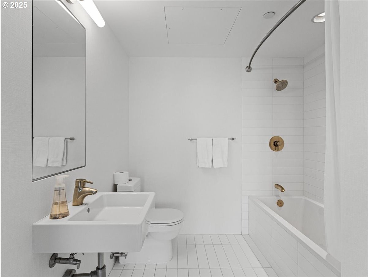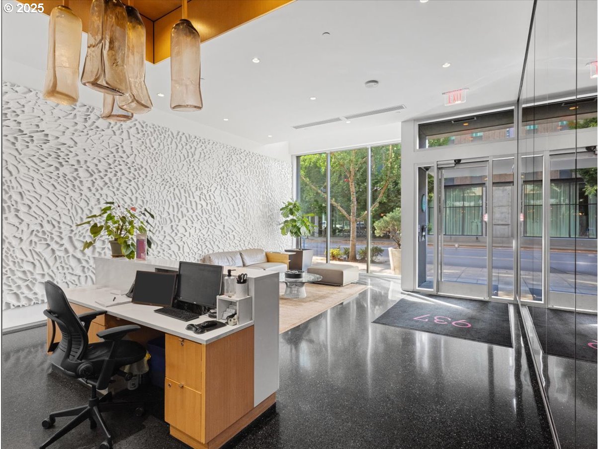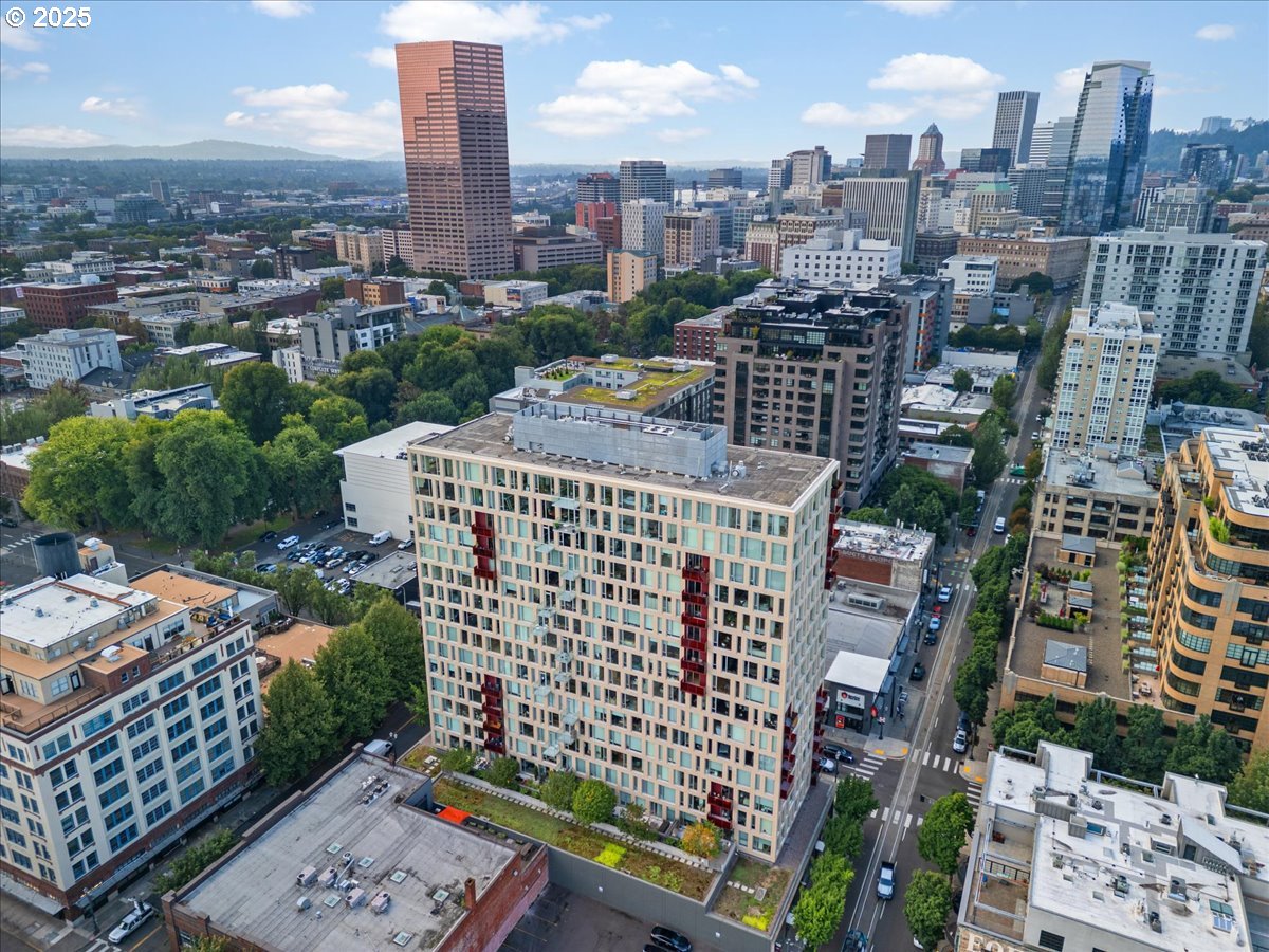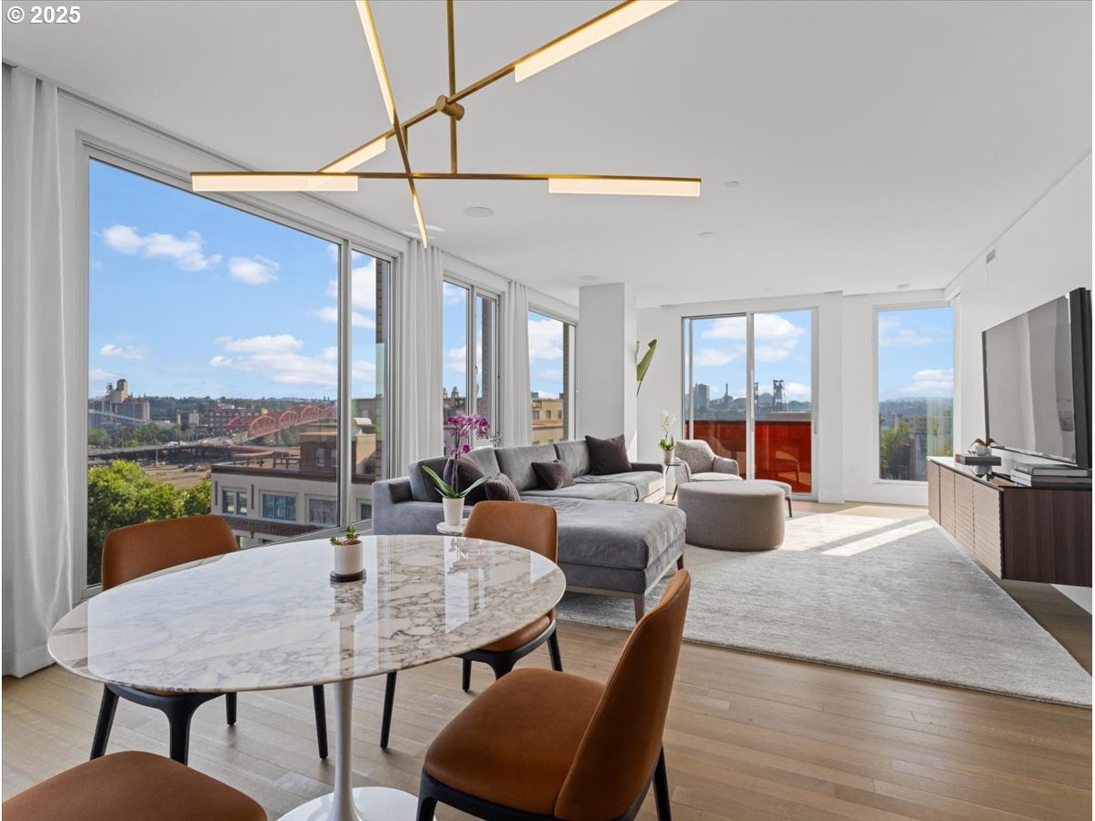 Stunning Corner Condo with Panoramic Views. Perched on the 10th floor, this luxury modern corner unit showcases sweeping east and north views of Portland’s bridges, mountains, and sparkling city lights through dramatic floor-to-ceiling windows. Flooded with natural light, the open layout highlights a gourmet kitchen with premium Dacor, Liebherr, and Dosch appliances, quartz island, and rich hardwood floors.The flexible great room design creates effortless flow between living and dining spaces perfect for entertaining or relaxing. The primary suite features breathtaking sunrise views, while the second bedroom doubles as an ideal home office or guest room.Enjoy the convenience of in-unit laundry, deeded parking and storage, plus unbeatable walk and bike scores. A rare blend of style, function, and location in the heart of the Portland Pearl District.