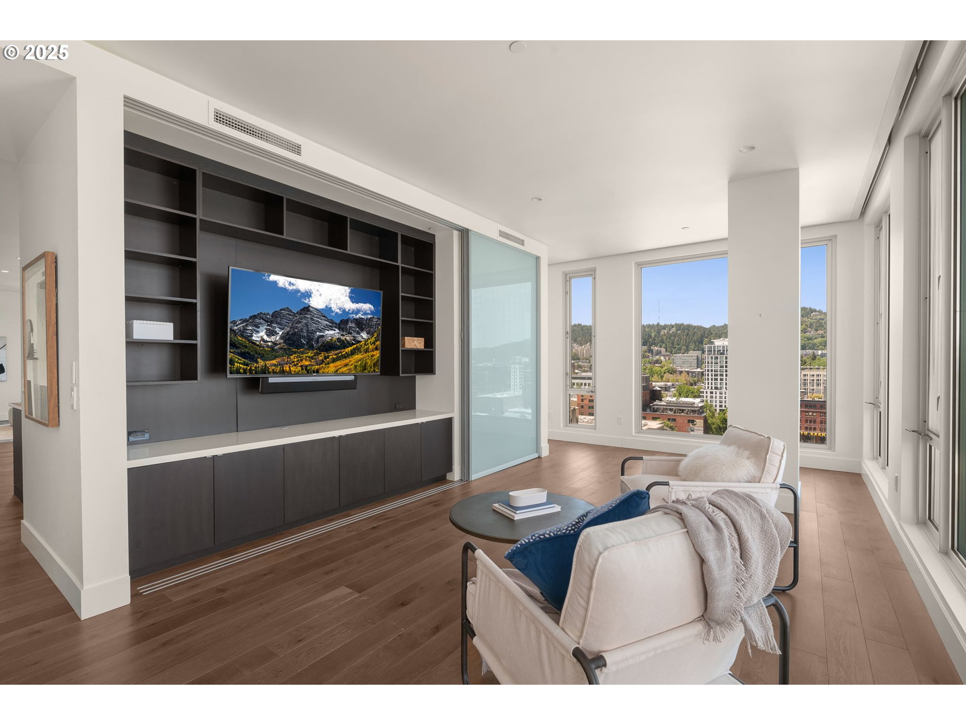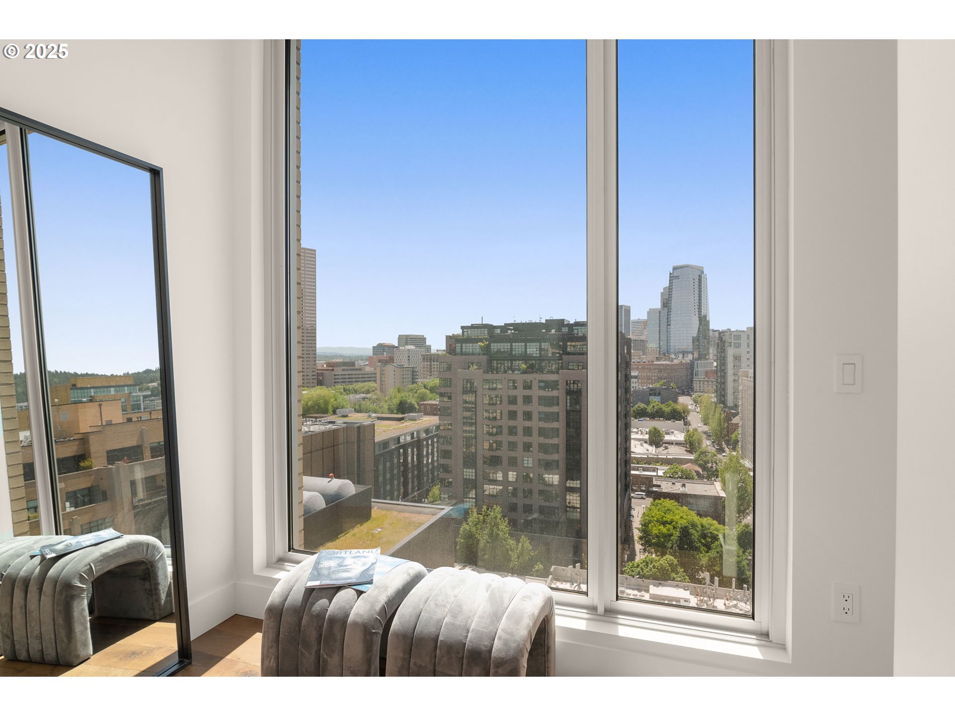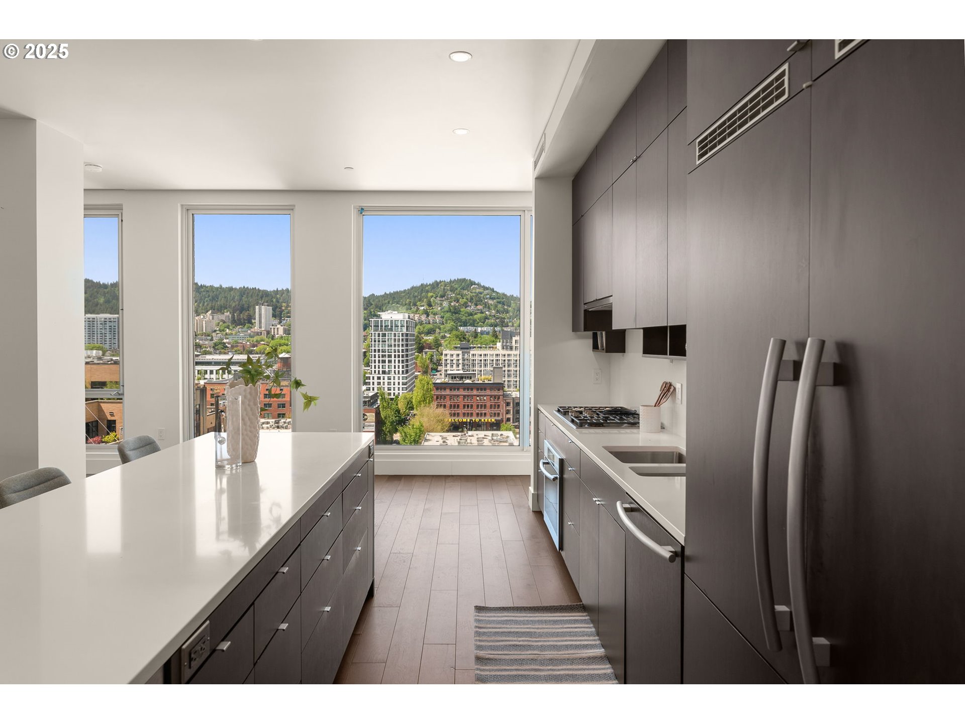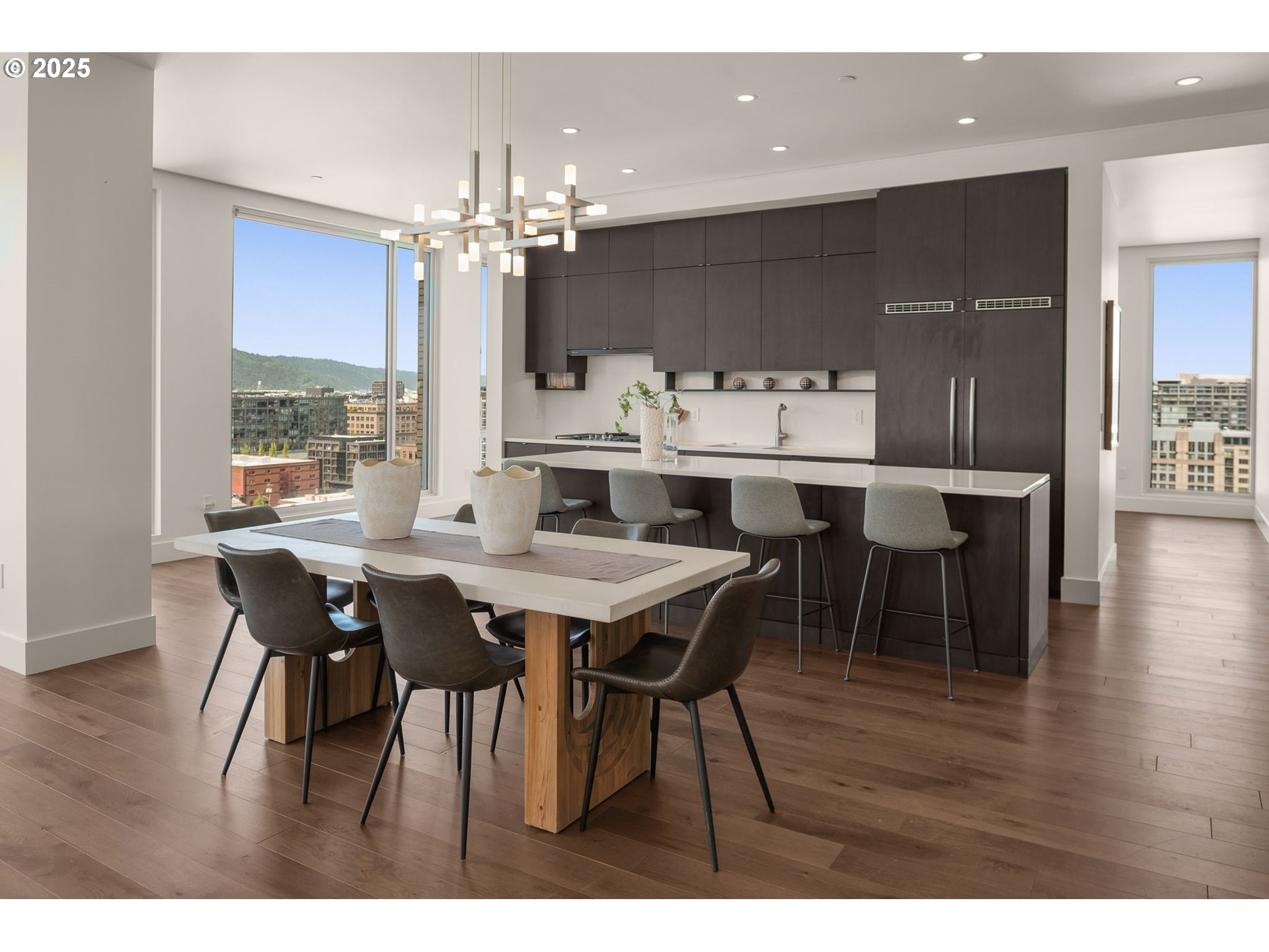 Spectacular Penthouse at the LEED Platinum & Award Winning 937 Condominiums. Unmatched views of the city, bridges, hills & mountain. Dramatic floor-to-ceiling windows in every room. Influenced by the clean modernism of Mies van der Rohe, the 937 building sets the standard for modern, sustainable design. Thoughtful and luxurious curated finishes including Caesarstone surfaces, wide-plank hardwood floors, custom built-ins with abundant storage, designer chandeliers, upgraded fixtures, extensive recessed lighting, and automated blinds. A spacious covered balcony—complete with gas, electric, and water hookups—extends the living space for seamless indoor-outdoor entertaining. An expertly designed layout offers excellent flow and sweeping, light-filled living spaces. The expansive primary suite with spa style bath and guest bedroom with Murphy bed are thoughtfully positioned ensuring privacy at opposite ends. Distinctive bonus areas—including a versatile office or media room, a generous laundry room with storage and a walk-in pantry—enhance both functionality and refined living. Two deeded parking spots and one storage unit are included. Concierge service.