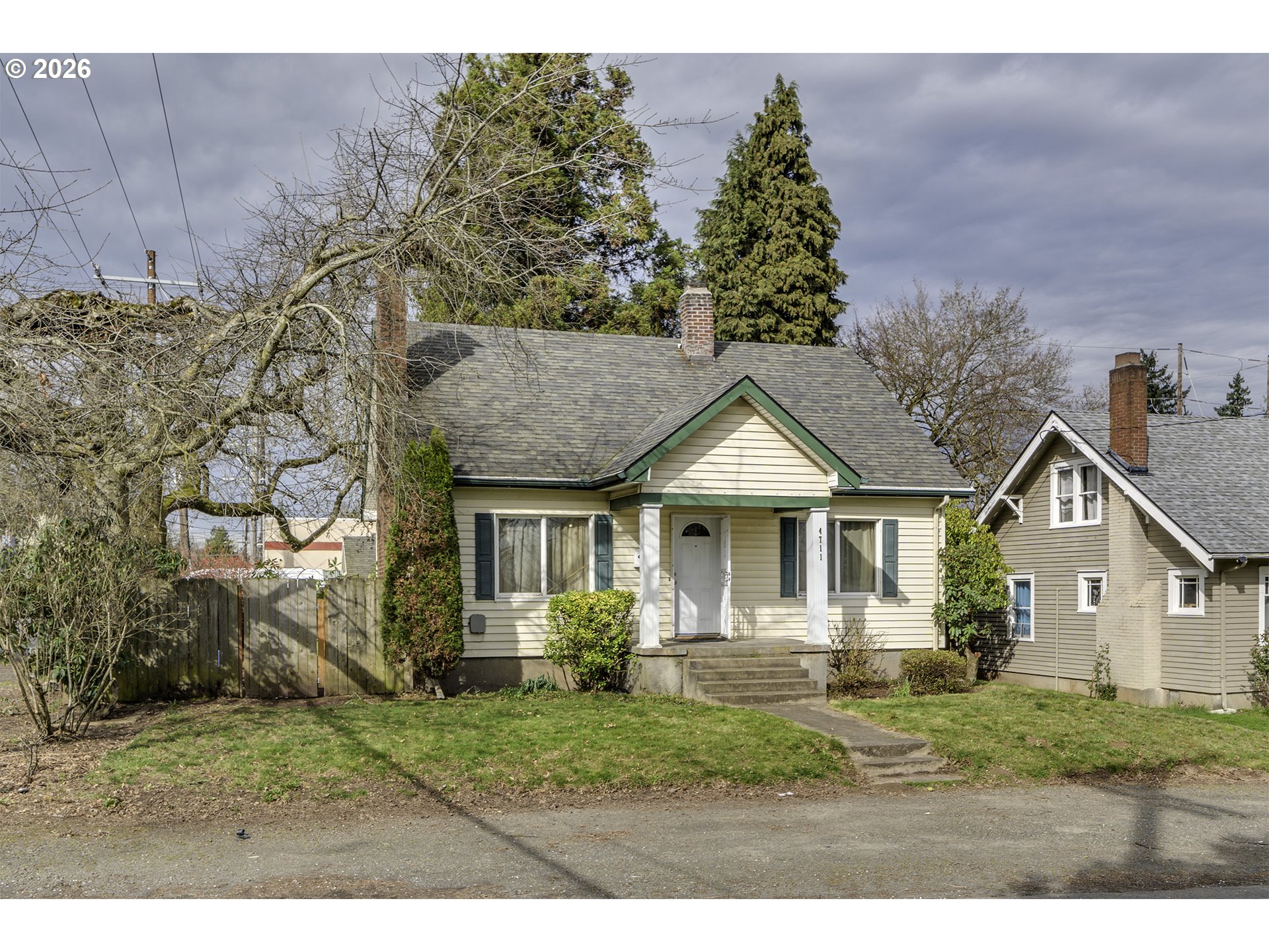 Welcome to this spacious cottage-style home tucked among the majestic trees of Maywood Park. Nearly surrounded by windows, the interior is bright, open, and full of charm. The generous living room features newly refinished oak hardwood floors, coved ceilings, and a tile-faced wood-burning fireplace framed by large windows for a warm, inviting feel. The formal dining room, complete with a built-in corner cabinet, sits perfectly between the living room and kitchen for easy flow during gatherings. The V-shaped kitchen includes updated cabinetry, granite countertops, a distinctive tile backsplash, stainless steel appliances, and durable engineered flooring. Upstairs are two bedrooms (one non-conforming) with a large adjoining closet. The 981-square-foot unfinished basement offers incredible potential, with TALL ceilings and a private entrance, an ideal opportunity to create additional finished living space. The south-facing backyard is fully fenced and accessible through a dual side gate, with nearly a 133 foot deep lot. It provides plenty of room for play, entertaining, gardening, or relaxing. Conveniently located near shopping, entertainment, and local favorites like The Grotto, Rocky Butte, and Senns Dairy Park, this home is the perfect canvas to make your own.
