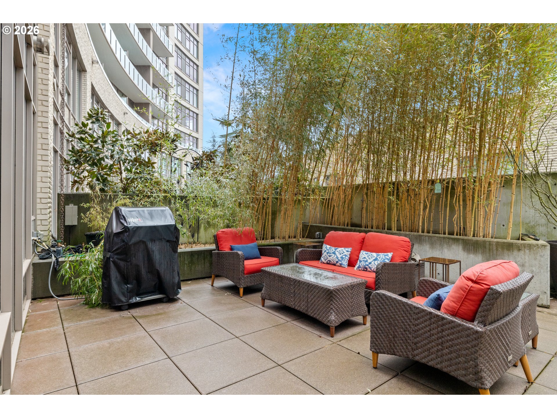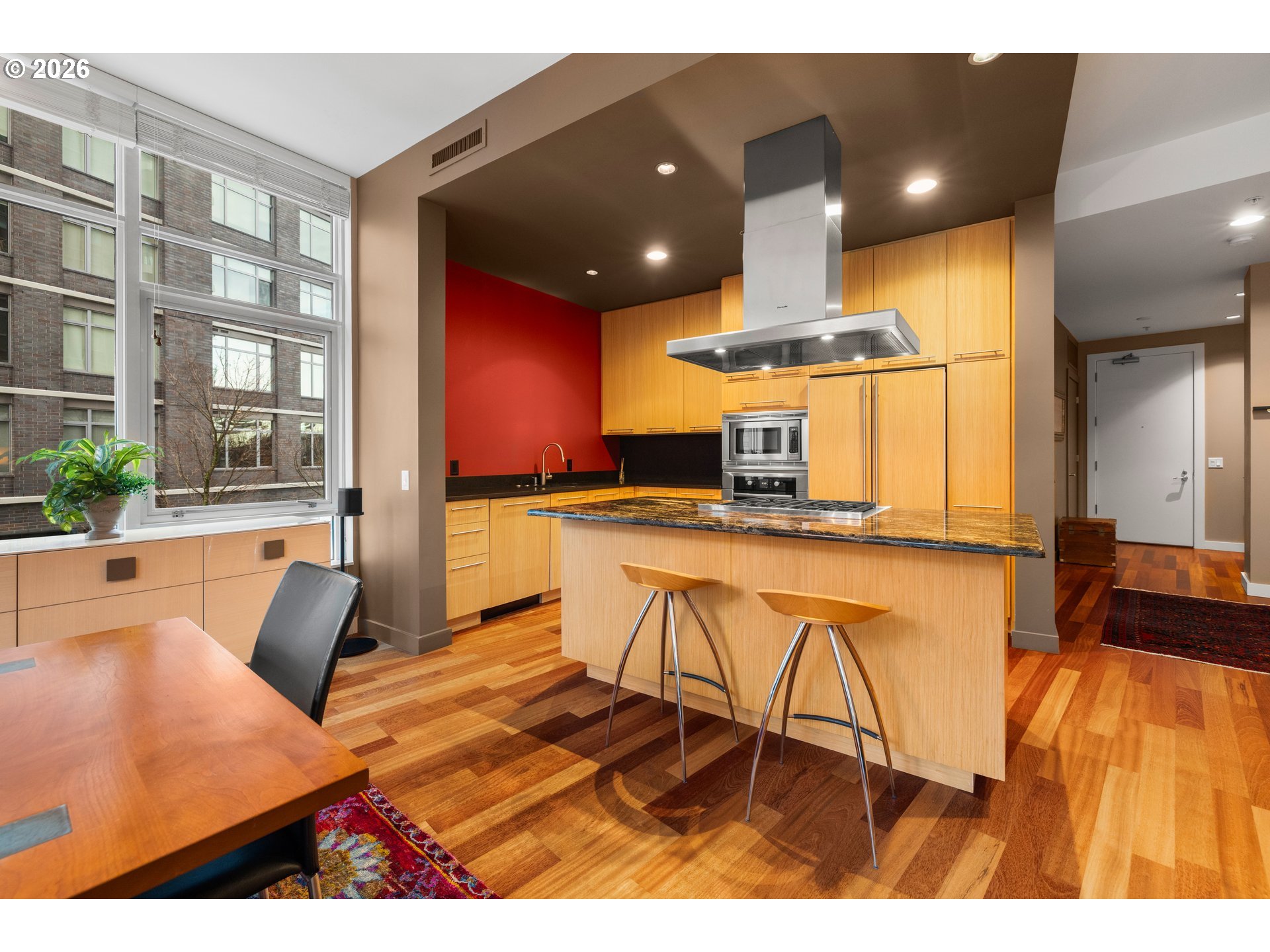 Luxury living in the heart of Northwest Portland. This furnished, contemporary two-story condo features 3 bedrooms and 3 full baths, filled with natural light from dramatic floor-to-ceiling windows. The spacious living area offers a cozy gas fireplace and opens to a 370 sq ft private patio, perfect for relaxing or entertaining. The gourmet kitchen includes top of the line appliances, granite countertops, and a large walk-in pantry. A main level bedroom (or office) features a built-in Murphy bed. Upstairs, the primary suite offers an ensuite bath and generous closet space. Across the hall, is the second bedroom upstairs with closet and floor to ceiling windows. Each closet contains closet organizers. Just down the hall, is the storage/laundry room, featuring a 400 bottle wine fridge. Addition highlights include a deeded storage unit, two tandem deed parking spaces, (shared EV charging station available in parking garage as well). Across the hall from the unit, is the gym and community room. The condo is conveniently located near shopping, dining, and all the Northwest Portland has to offer!