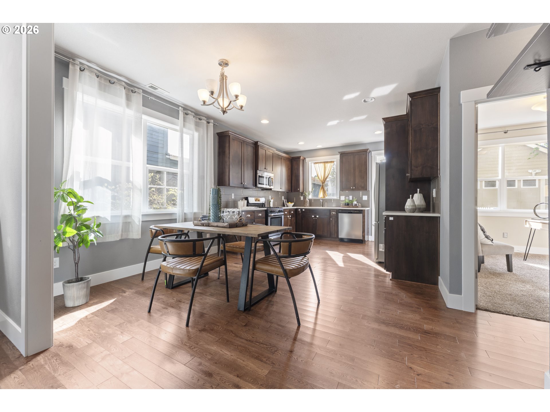 (503) 893-8874Built in 2014, this well-designed two-story home in the heart of Portsmouth offers the perfect blend of modern comfort and functionality. With nearly 1,900 square feet, the flexible floor plan includes 3 bedrooms plus a main-level den or optional 4th bedroom, along with 3 full bathrooms—ideal for guests, multi-generational living, or work-from-home needs. The main level features an open-concept layout with hardwood floors, a spacious kitchen, and a dedicated dining area that flows seamlessly into the living room, complete with a gas fireplace and custom built-ins. Large windows fill the home with natural light, while the east-facing covered front porch provides a welcoming space to enjoy your morning coffee. Thoughtful upgrades include a tankless hot water heater and high-efficiency furnace, offering comfort and energy savings year-round. Outside, you’ll find a fully fenced yard, plenty of off-street parking, and a detached garage—an increasingly rare find for newer construction in the area. All of this in a convenient North Portland location, just moments from parks, local shops, and neighborhood favorites.