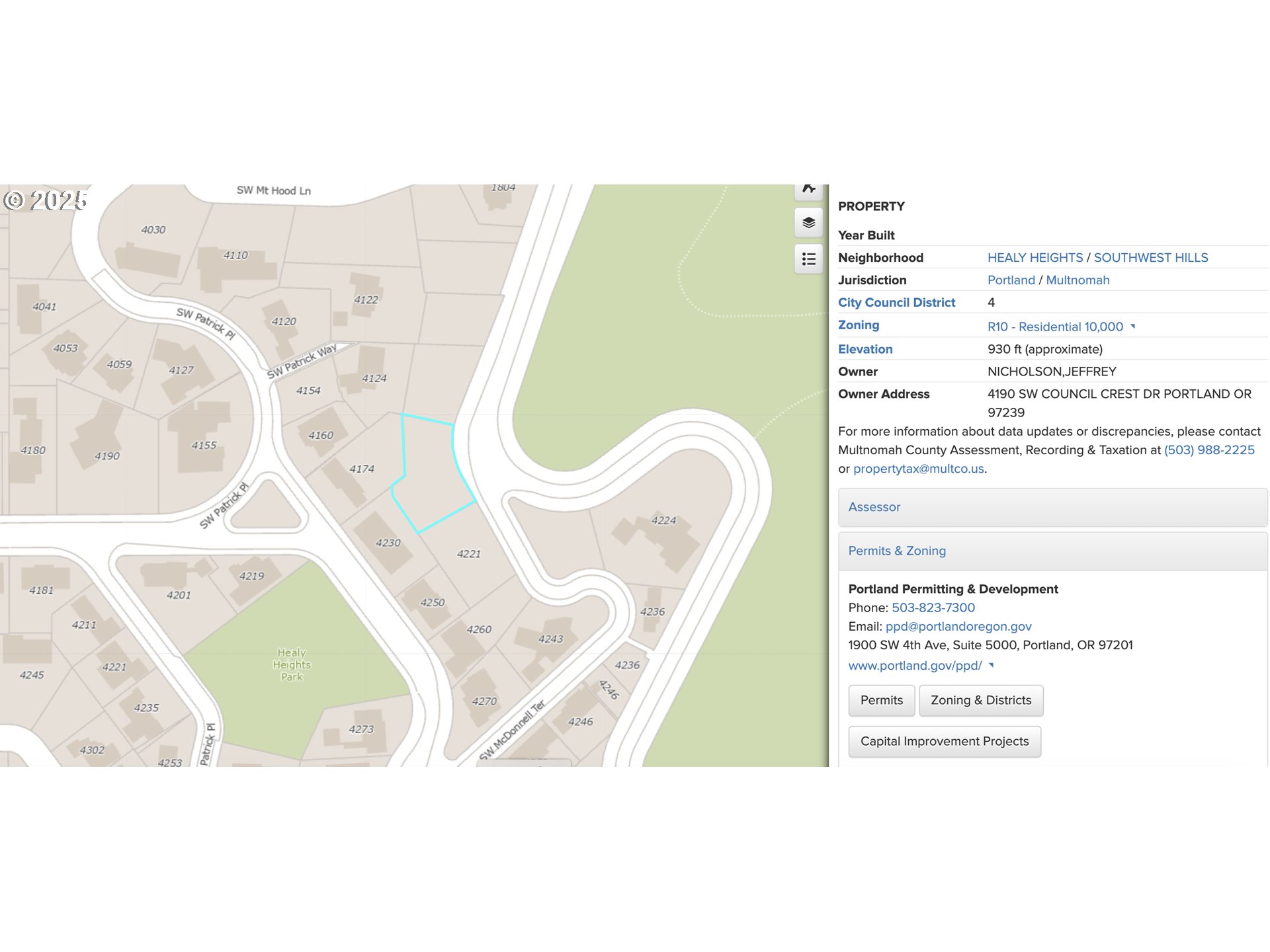 Discover a rare opportunity to build your dream home in the prestigious Healy Heights neighborhood, nestled in the SW Hills of Portland and just moments from OHSU and downtown. This 0.29-acre sloped lot features a level area midway up, ideally situated to take in breathtaking views of Mount Hood and the Portland city skyline. Building lower along McDonald Terrace provides a seasonal filtered city view. You’ll enjoy convenient access to nearby green spaces like Healy Heights Park and Council Crest Park, both just a short distance away. The area is well-connected, making it easy to reach nearby amenities, transit, and nature trails. The lot is zoned R10 and includes constrained site and scenic resource overlays, with an elevation of approximately 930 feet. According to the seller, there is an existing sewer easement in Council Crest, which could significantly reduce hookup costs. Utilities are nearby, making future development more accessible. There is a lot of potential with this lot, as it’s surrounded by high-end homes valued between $1M and $3M, adding to its long-term appeal and investment opportunity. The seller previously explored the possibility of building a tri-plex or four-plex, and was informed that, due to Portland’s Residential Infill Project, this could potentially be allowed—creating even more possibilities for this exceptional piece of land. Buyer to perform their own due diligence regarding development potential, zoning regulations, overlays, and utility access. Priced to sell! The seller is motivated due to health-related circumstances—don’t miss this opportunity to build in one of Portland’s most desirable hillside communities!