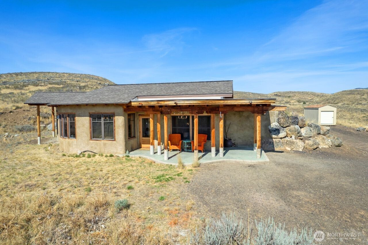 (503) 893-8874Organic 2BD, 1BA artisan-built home on 20 sun-filled acres with panoramic views of Pearrygin Lake, the Rendezvous Basin, and the Cascade and Chelan Sawtooth ranges. This 1,516 SF retreat features curved plaster walls, hand-hewn log beams, radiant concrete floors, and wrap-around windows that bring the outdoors in. The open layout includes a custom wood kitchen, utility room, and guest space, plus a detached storage shed. Tucked into wildflower meadows at the end of a quiet road, this low-maintenance home offers full sun, vivid sunsets, native landscaping, and timeless connection to nature.