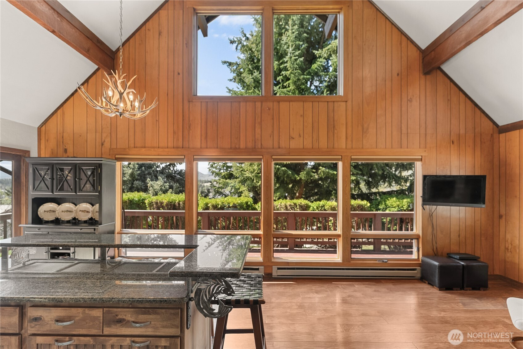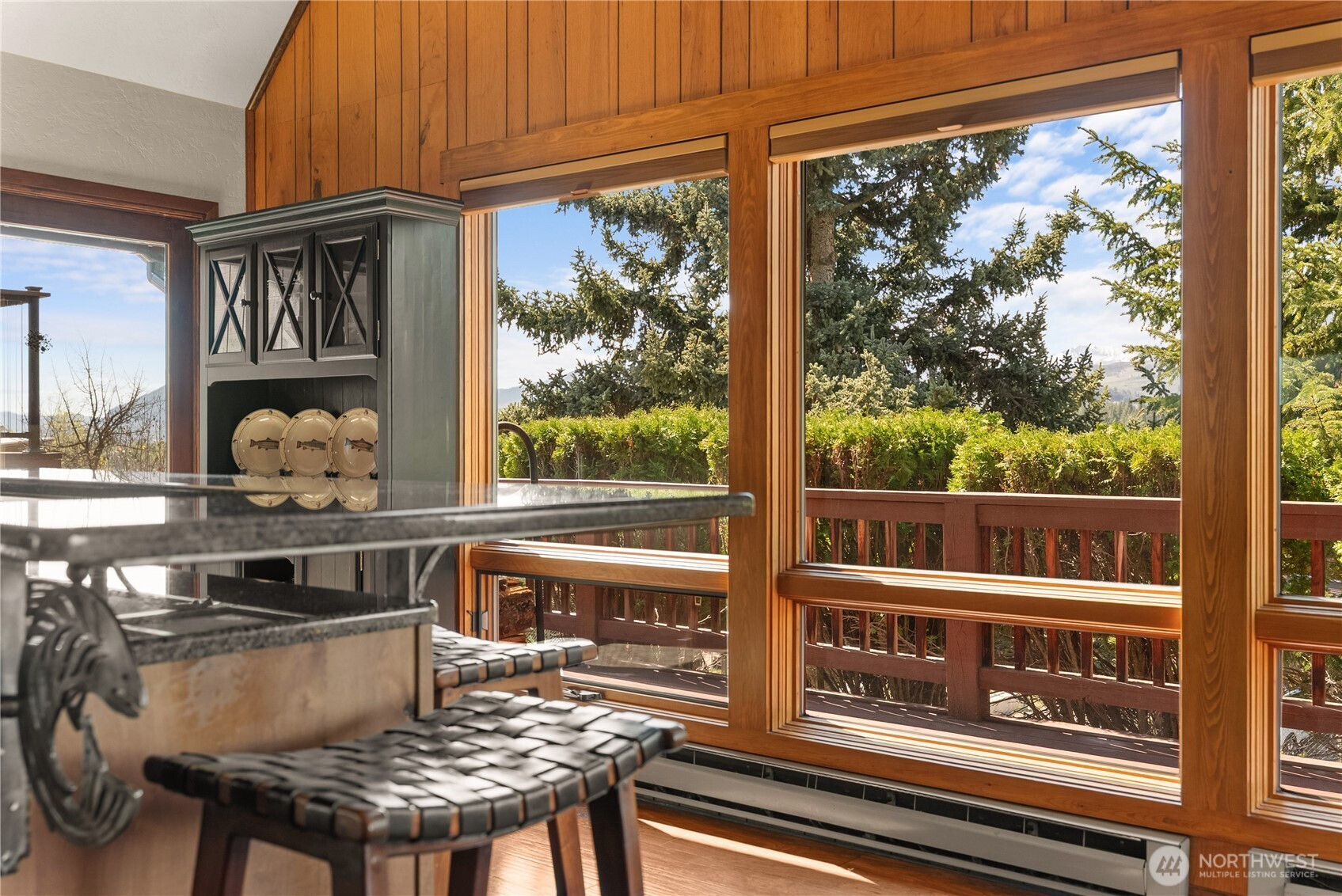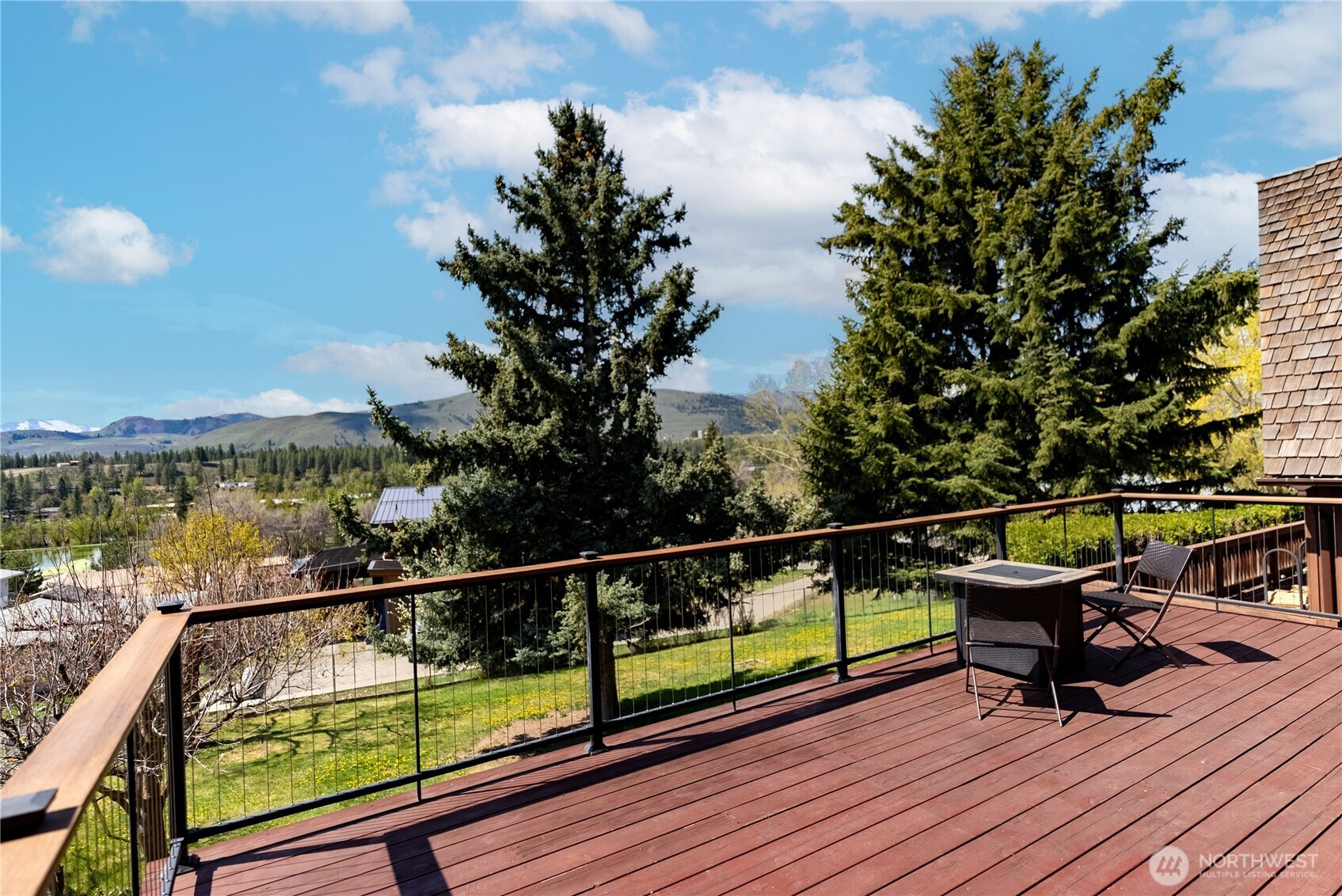 Spectacular views from this immaculately maintained in town Winthrop home on a divisible lot. Ideal for full time or part time living, this two bedroom home with bonus loft, family room and two car garage is filled with quality upgrades & custom features. The living area showcases a dramatic wall of windows and a brick fireplace with wood burning insert accented with ironwork by a local metal artist. Hunter Douglas insulated shades, thoughtful lighting fixtures, custom wood railings, wrapped columns and detailed molding add warmth throughout. The remodeled kitchen features alder cabinets, granite countertops, floating bar with custom metal accents and new appliances. Most original windows have been replaced with Sierra Pacific windows and a locking glass sliding door. Enjoy multiple decks for entertaining, including a spacious 12’X 24’ cedar deck with stainless cable railings and hardwired lighting. A separate 355 sq. ft heated pine paneled pool room with a fridge and walk in storage area provides extra space. Upgrades include a premium Canadian cedar shake roof with fire resistant coating, new garage doors, and metal garage roof, blown in cellulose insulation (2025), new hot water heater and upgraded irrigation system (2024). Two mature pine trees provide shade and privacy. Established apple tree, raspberries, strawberries, and rhubarb in garden. Don’t need the space? R1 zoning allows for a practical future lot division. Thoughtfully upgraded and lovingly maintained.