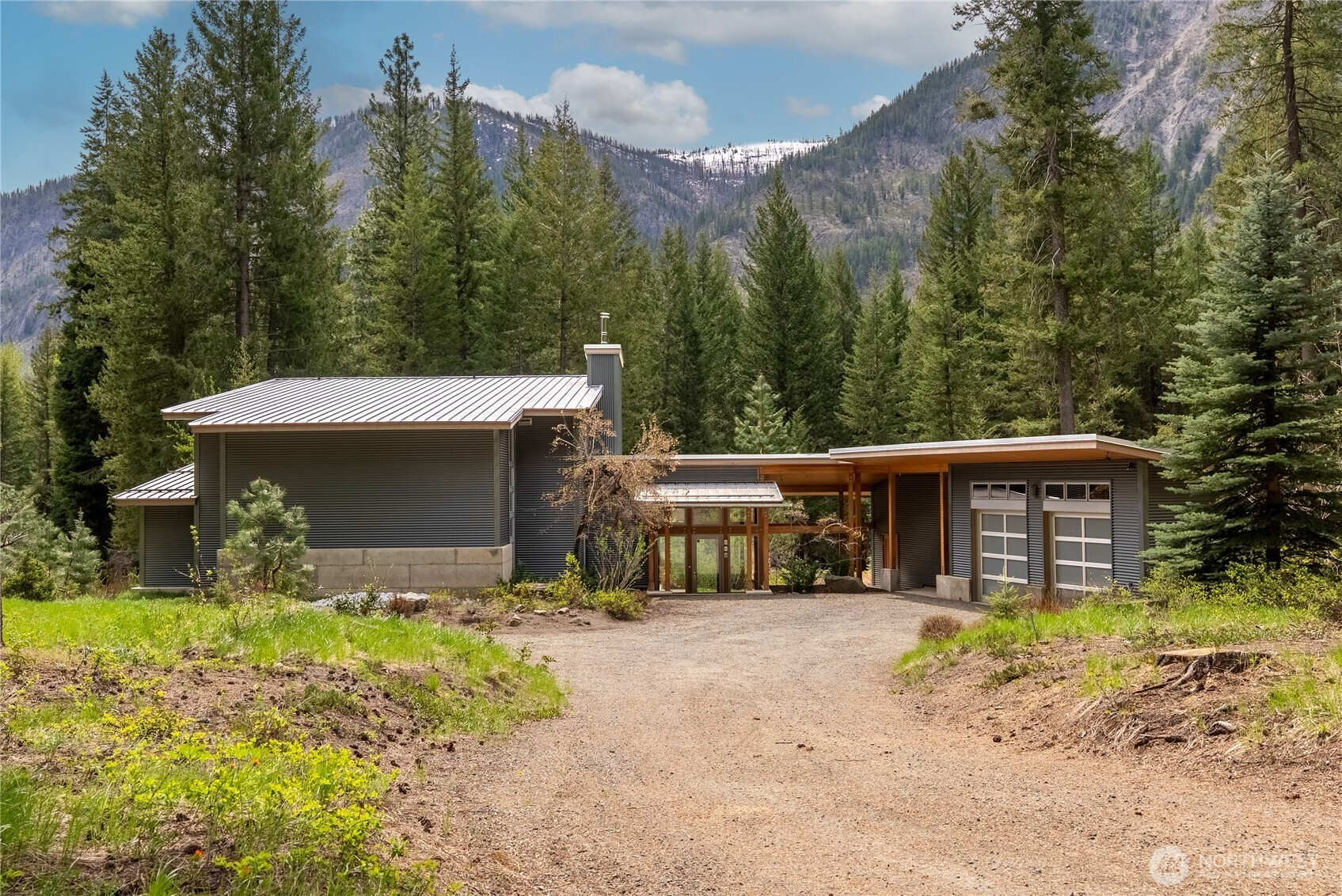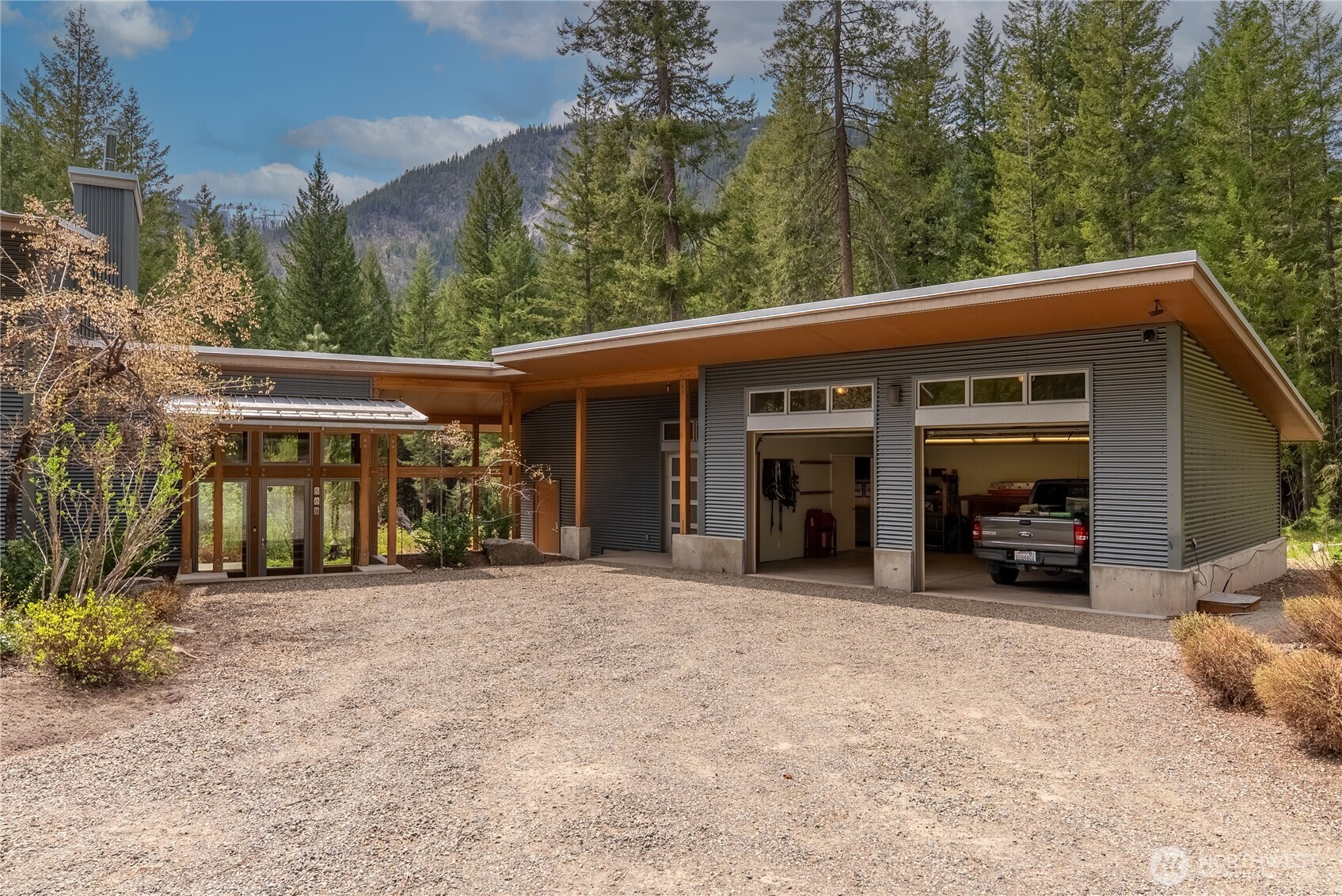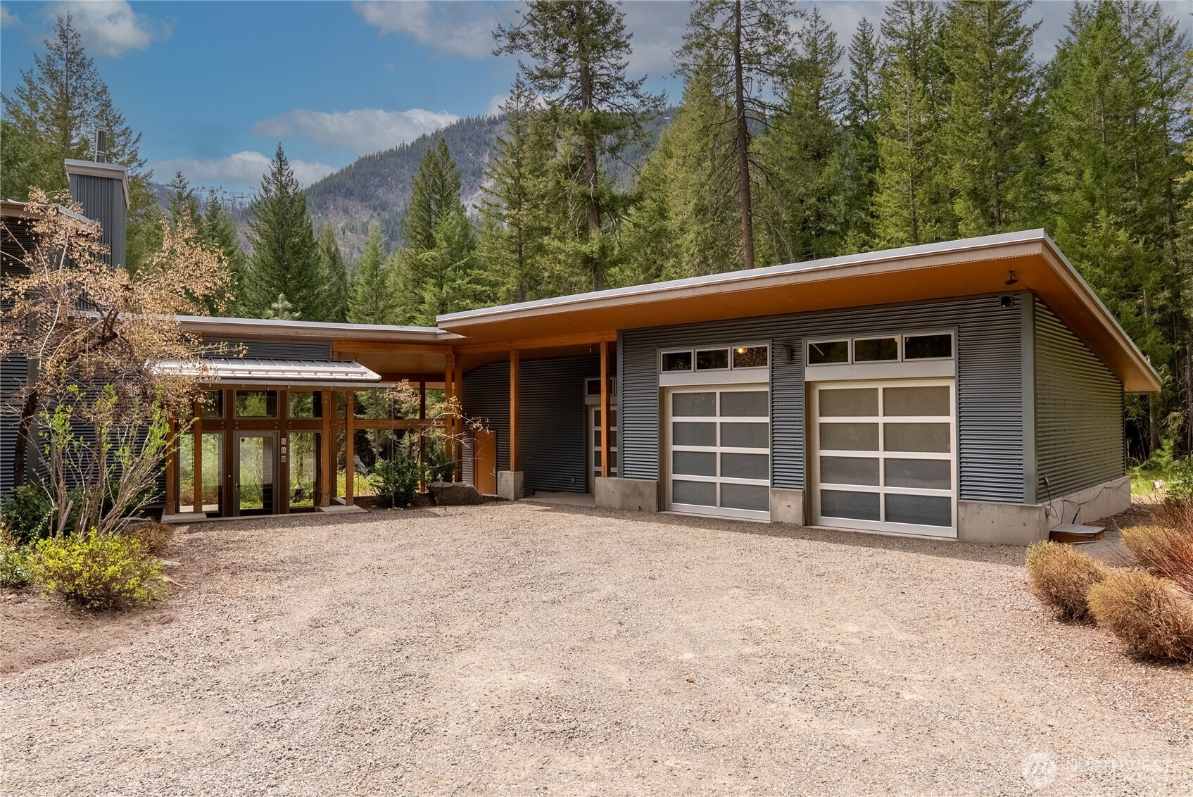 Exceptional contemporary home just minutes from the Mazama junction checks all the boxes! Designed and built as a full-time residence or the perfect recreational getaway, this 3-bedroom, 2-bath home was completely renovated in 2010. It features a large 2-car garage, heated shop with roll-up door, and generous storage for bikes, skis and more. The light-filled interior, with its tamarack pillars and beams includes a double-height library with sliding barn door and upper story overlook, bright open kitchen with adjoining dining and sitting spaces, first floor guest room and bath, wine closet, atrium entry with radiant floor heat, and expansive outdoor terrace. A warm wood staircase leads to the primary bedroom suite with open sitting area, full bath, generous closets, laundry, third bedroom or office, and private deck with views of Driveway Butte and starry skies at night. The low-maintenance landscaping, automated irrigation, covered walkways and robust metal cladding means fewer chores and more time to enjoy the upper Methow Valley's best climbing pitches, nearby hikes, extensive ski and bike trails, and summertime swimming holes! Relax in privacy or throw a party on the outdoor terrace with its sunny outlook, bubbling water feature, separate sitting and dining areas, and a garden of culinary herbs and plants carefully selected for the Methow Valley climate. If you are inspired by a creative spirit, and looking for convenience and ease, don't miss this architectural delight.