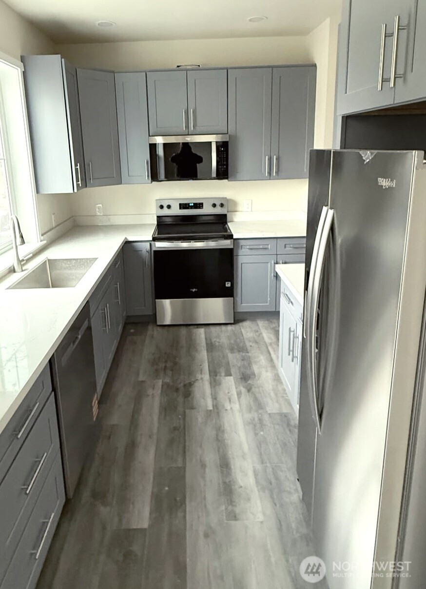 Newly built and move-in ready! This 3-level corner-lot home features 3 bedrooms, 2.5 baths, and open dining and living areas perfect for seamless entertaining. The kitchen boasts quartz countertops, stainless steel appliances, and ample cabinet space. LVP flooring throughout, air conditioning, and an efficient layout add comfort and style. Upstairs includes all bedrooms plus laundry, while the lower level offers a two-car garage with direct access to the main floor. One of two new homes being built side by side, both showcasing high-quality finishes and thoughtful design. Excellent location near town, schools, and parks — the perfect blend of modern living and small-town charm.