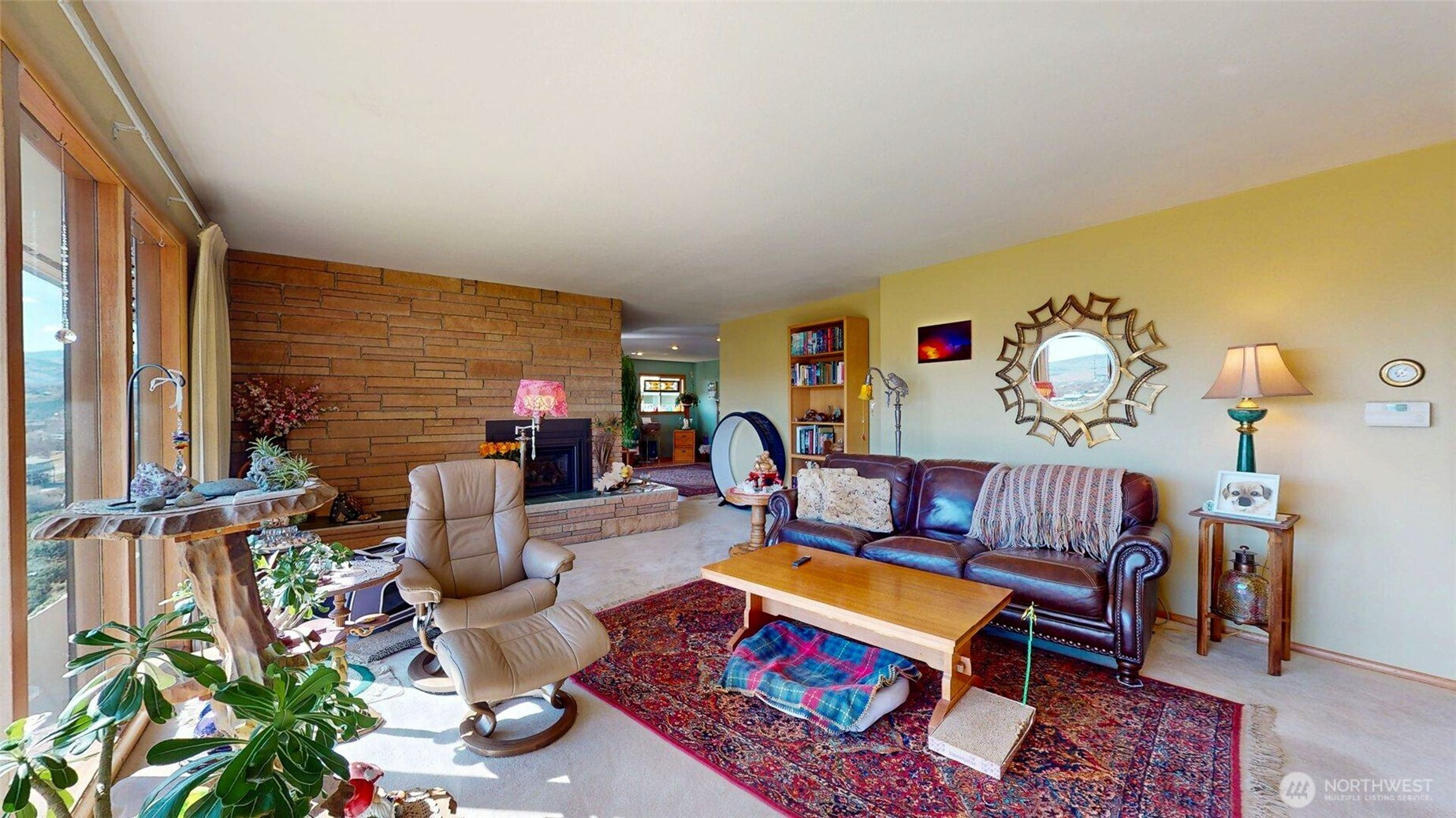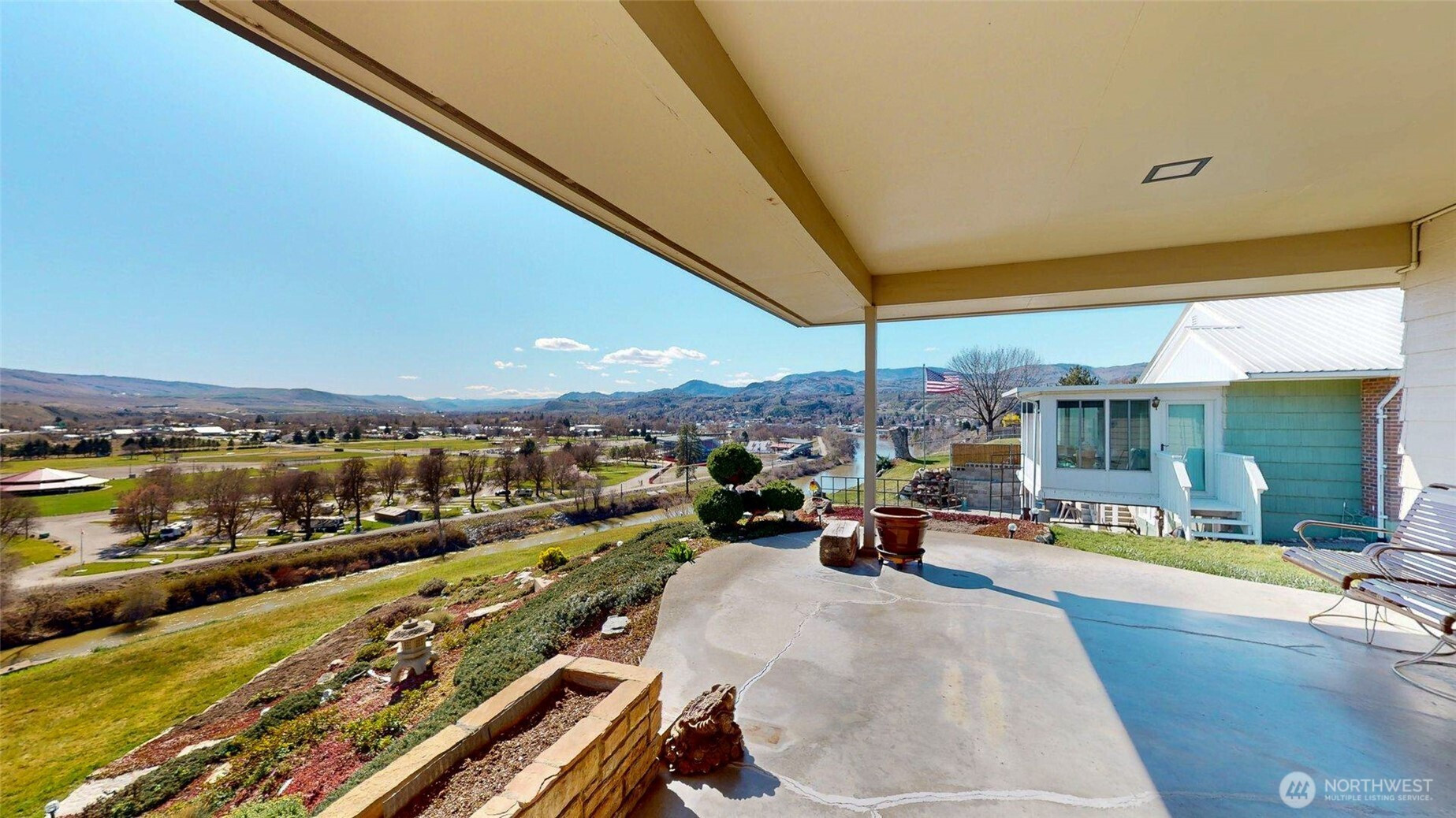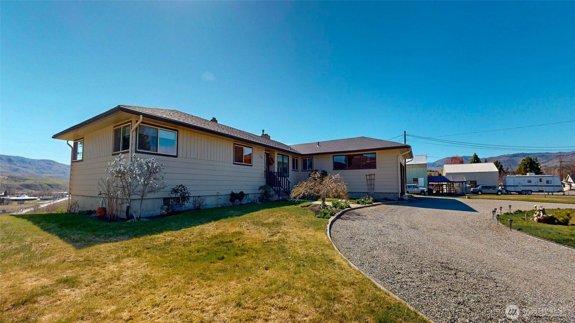Freshly reintroduced with updated pricing, this elevated hillside property captures sweeping territorial, river, and Stampede Grounds views while offering a rare combination of space, setting, and usability just minutes from Omak's City Center.Featuring nearly 2,000 sq ft of main-level living, the home showcases distinctive mid-century character with expansive windows, natural light, and a gas fireplace with stone surround anchoring the main living area. The kitchen offers a functional layout with breakfast nook with a chef style gas range, while the main level includes multiple bedrooms, a full bath, and convenient access to laundry and additional half bath.The daylight basement adds flexibility with a finished living area or additional bedroom, fireplace, and additional space already plumbed for a future bathroom—providing opportunity for expansion, storage, or multi-use living.Set on approximately 1.39 acres across two parcels with irrigation, the property features a well-maintained yard, roundabout driveway, and ample outdoor space to enjoy the elevated setting. The combination of views, usable land, and in-town proximity creates a unique opportunity seldom found in this location.