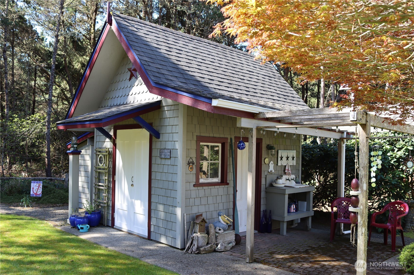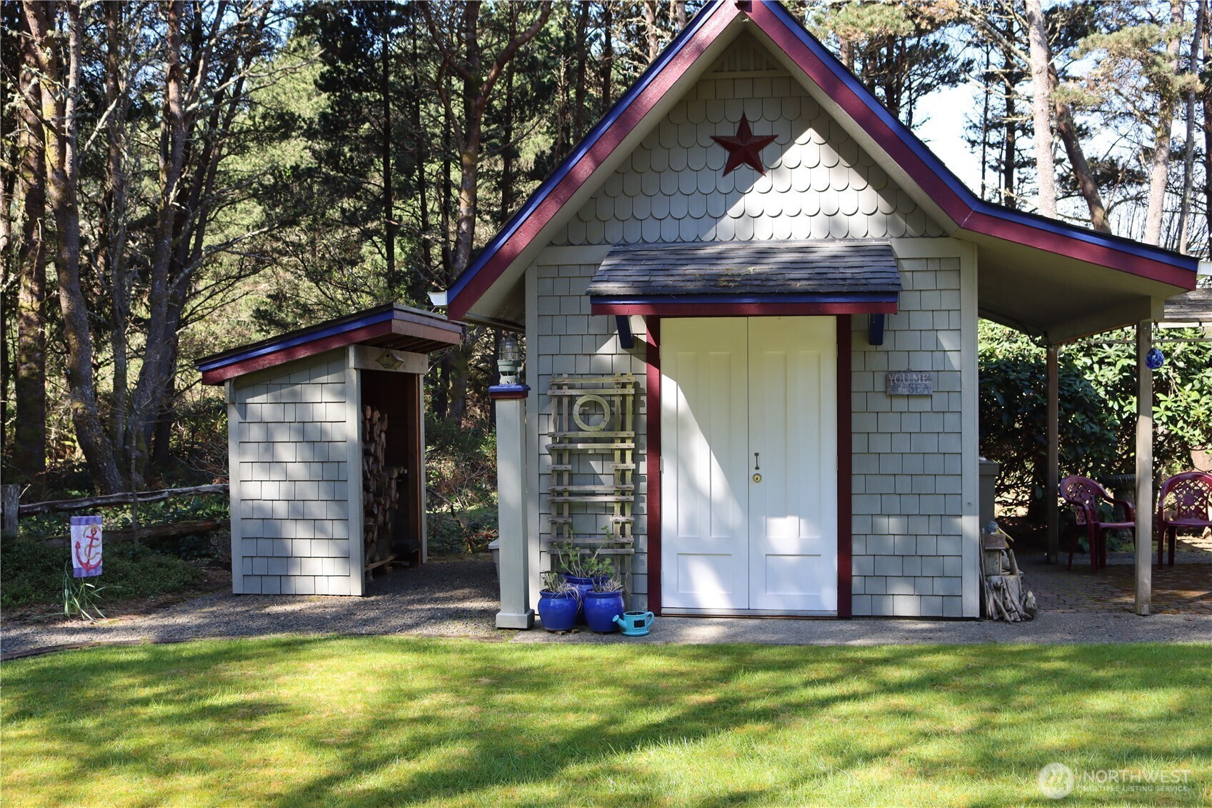Pristine perfect is the only way to describe this west side beach house in Klipsan Beach! One owner:built and maintained with pride of ownership. He has paid immaculate attention to every detail from the knotty pine doors and wanes coating with oak banister to the hardwood floors, and handmade cabinetry/vanities. The yard is meticulously groomed and well kept,every bush and plant lovingly watered with an underground sprinkler system. Enjoy fireside chats around the fire pit, or take a short walk to the beach for a fireworks! Tides West provides Loomis Lake deeded access with a community park.The covered back porch off the kitchen gives privacy for watching over 20 acres of wooded wildlife area. This home has an open kitchen and dining room floor plan with a large pantry. The primary suite is upstairs with an open loft for the office/den or daybed area. The second bedroom downstairs is next to a full bathroom in the hall, with a large laundry room for cleaning up after clam digging or fun at the beach. The living room has a propane stove for ambiance in the warmth of this knotty pine gathering room with a lovely high ceiling. There is an additional 12X12 finished building outback along with 2 single car garages one with an attached 8X10 storage units. This property is truly magestic, please don't miss out on on this once in a lifetime home.