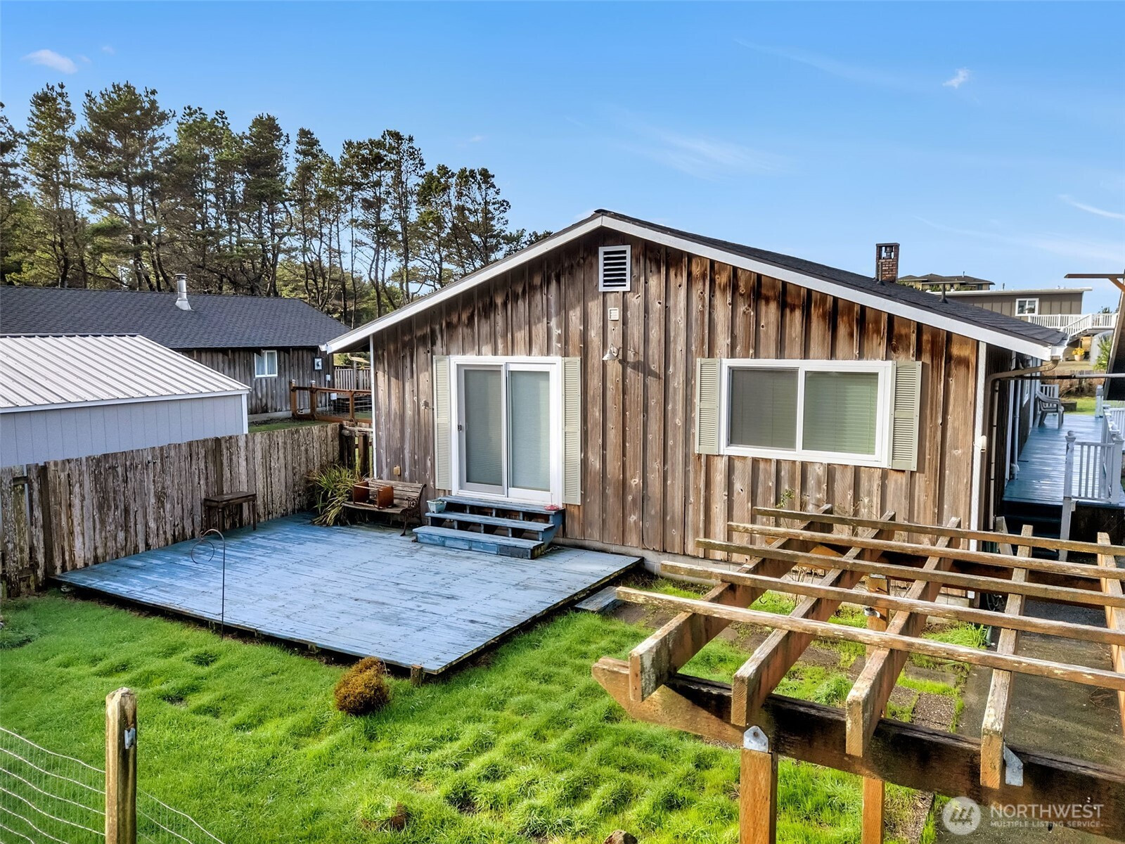 This single-level home offers comfortable coastal living with private beach access exclusive to homes on the street, giving a quieter route for walks, shell hunting, or sunset views away from public areas. Inside, the layout includes a living room, dining area, kitchen, and bonus family room for added flexibility. A detached garage provides storage or workspace options, while the fenced yard and deck offer usable outdoor space. Move-in ready with room for updates, this property is ideal as a primary residence or getaway, featuring durable flooring, a low-maintenance exterior, and a simple floor plan suited to everyday living. The home’s design supports easy use of space, with defined rooms that allow separation between living, and dining.