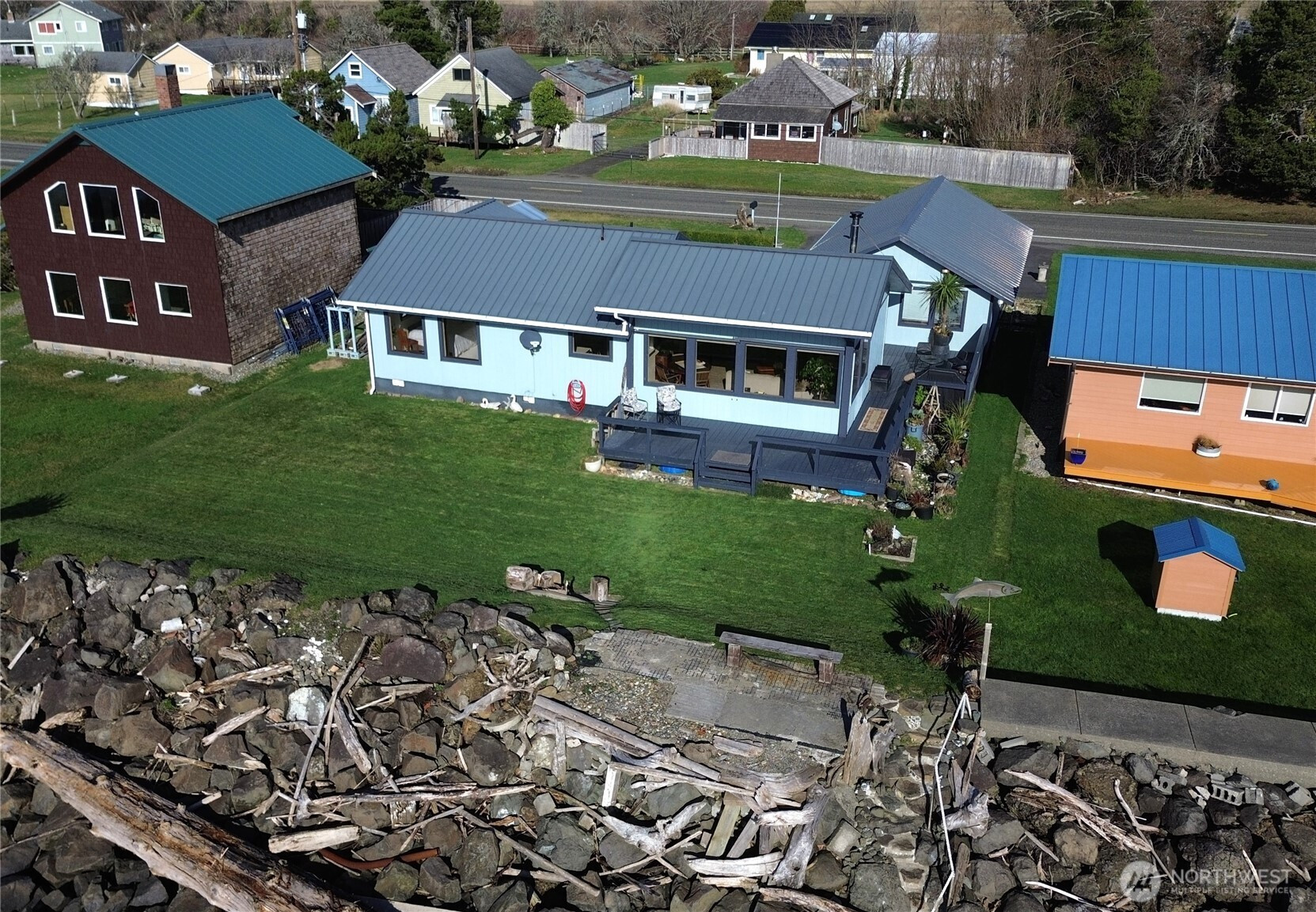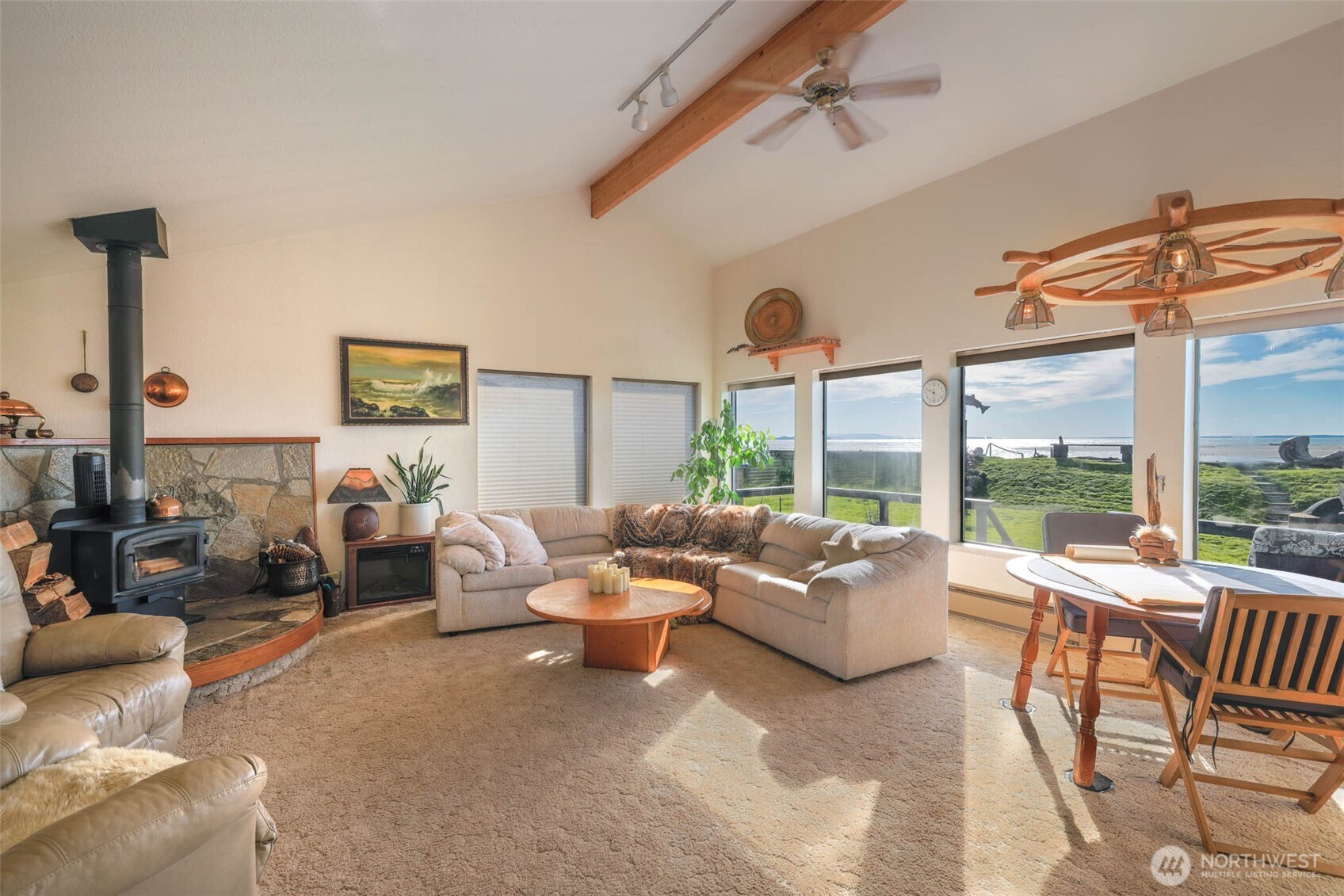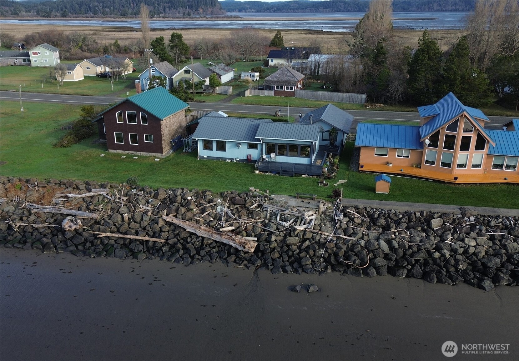 Waterfront living in Tokeland doesn’t get much better than this. This well-maintained home sits on Willapa Bay with spectacular, unobstructed views stretching across the water to the ocean beyond. The living room, kitchen/dining area, and primary bedroom all enjoy water views, bringing the bay into everyday living.Inside, you’ll find vaulted ceilings, stone entry and fireplace surround with a cozy woodstove. The primary bath features a new soaker tub, perfect for unwinding after a day on the coast. Step outside to the wraparound deck to take in unforgettable sunsets and fresh bay air. The property includes two bedrooms plus a detached guest room in the garage with its own kitchenette and 3/4 bath—ideal for visitors or extra flexibility. A two-car garage, outdoor built in firepit, stairs to the beach and garden space complete this special waterfront retreat.
