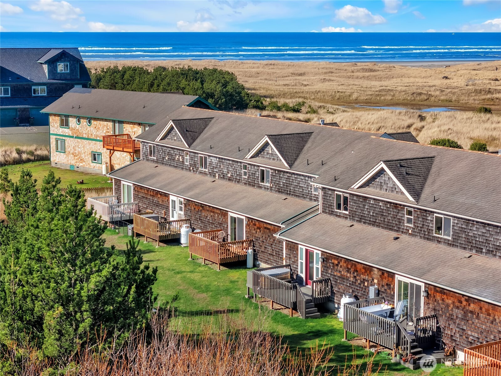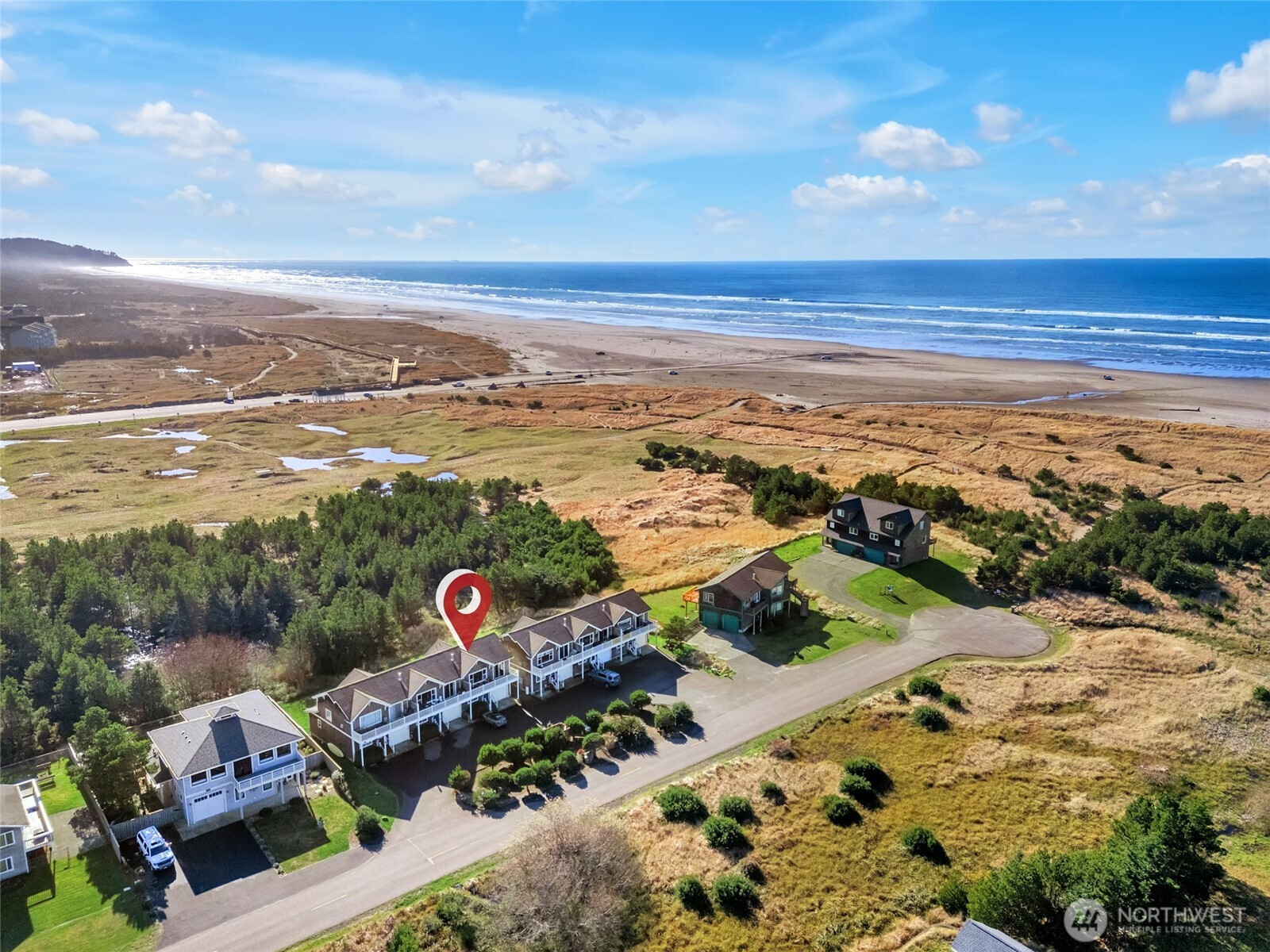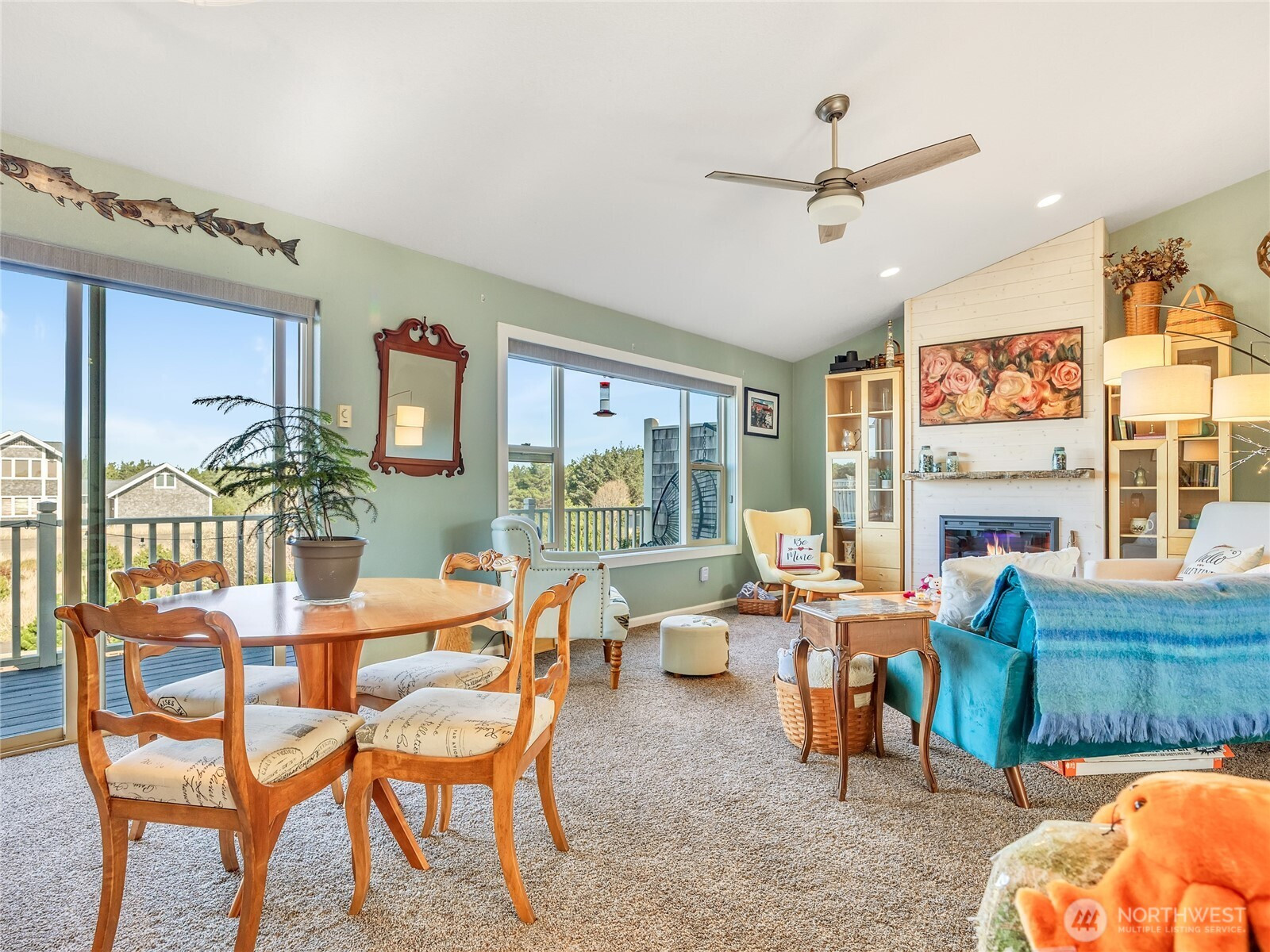 Coastal living awaits in this beautifully updated 2-story condo in Long Beach, WA, with sweeping Pacific Ocean views in an intimate 6-unit complex. This rare end-unit style home lives like a townhouse, offering a smart, comfortable layout with 2 bedrooms and 1 bath on the main entry level. The upgraded downstairs bath features a newly tiled shower and luxurious heated radiant flooring for added comfort after beach walks. Upstairs, an inviting open-concept living, dining, and kitchen space is designed to maximize light and views. Enjoy the warmth and charm of a new electric fireplace with shiplap surround, creating a stylish focal point for relaxing or entertaining. The kitchen has been refreshed with upgraded cabinetry, offering ample storage and a clean, modern look, along with easy flow to the dining area. A convenient half bath on this level adds practicality for guests. With only six units in the building, you’ll appreciate the peaceful, private feel of this small community. A private garage provides secure parking and extra storage for beach gear, bikes, and more. Whether you’re looking for a full-time residence, weekend getaway, or investment property, this ocean-view condo offers the perfect blend of comfort, style, and coastal charm in the heart of Long Beach.