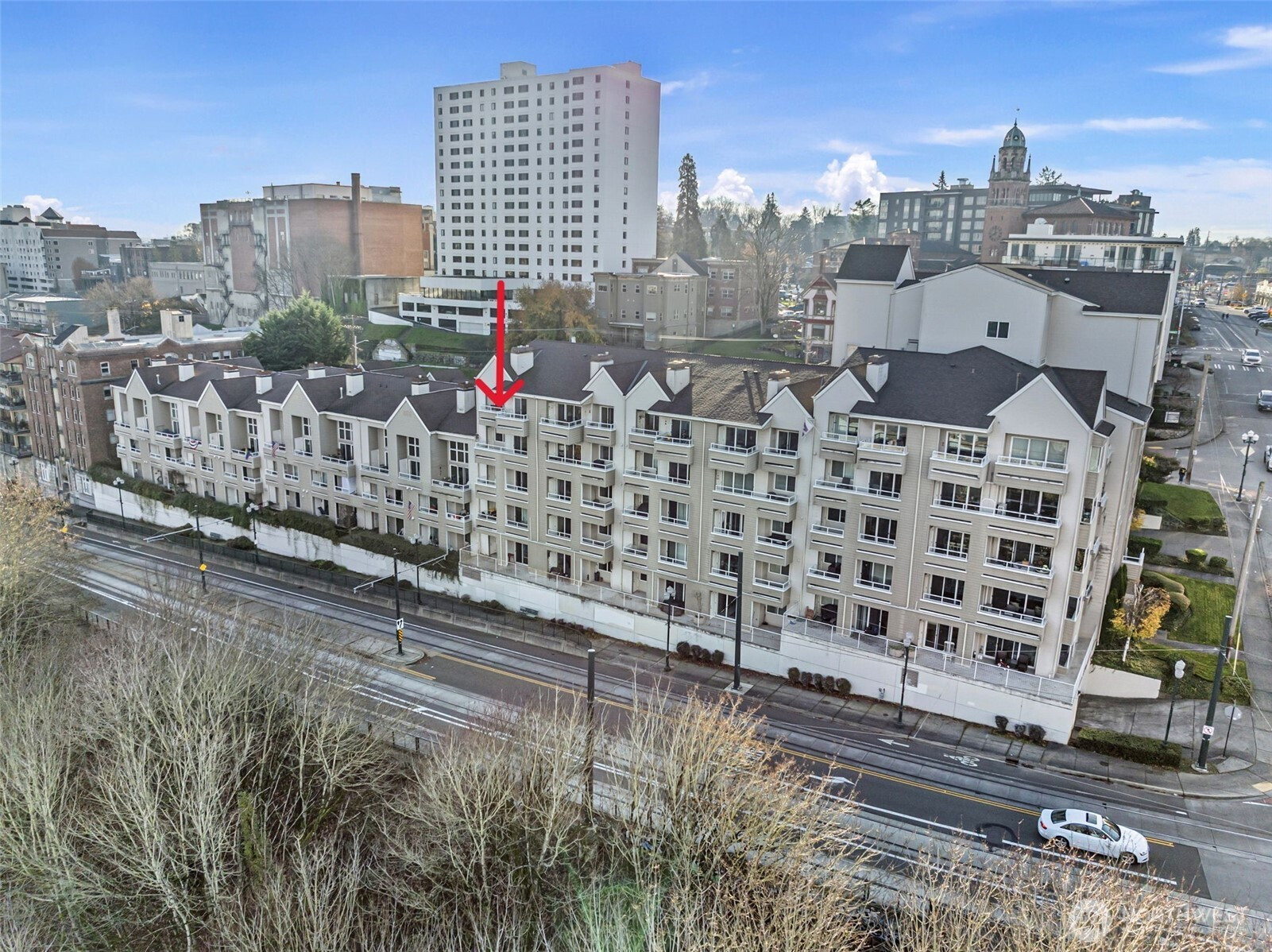 VIEWS VIEWS VIEWS from this top floor, end corner unit!! Big views of Mt. Rainier, the Cascades, Commencement Bay, and the Port of Tacoma. Light and bright in every room with TWO private balconies. Quiet and updated with beautiful flooring and fresh carpeting. Large primary bedroom with two generous closets and en suite bath. Second front bedroom with additional large closet space. Close proximity to the new light rail line, shopping, restaurants, and grocery in the Stadium District, Wright Park, and the downtown. Private parking in the underground garage with additional storage unit.