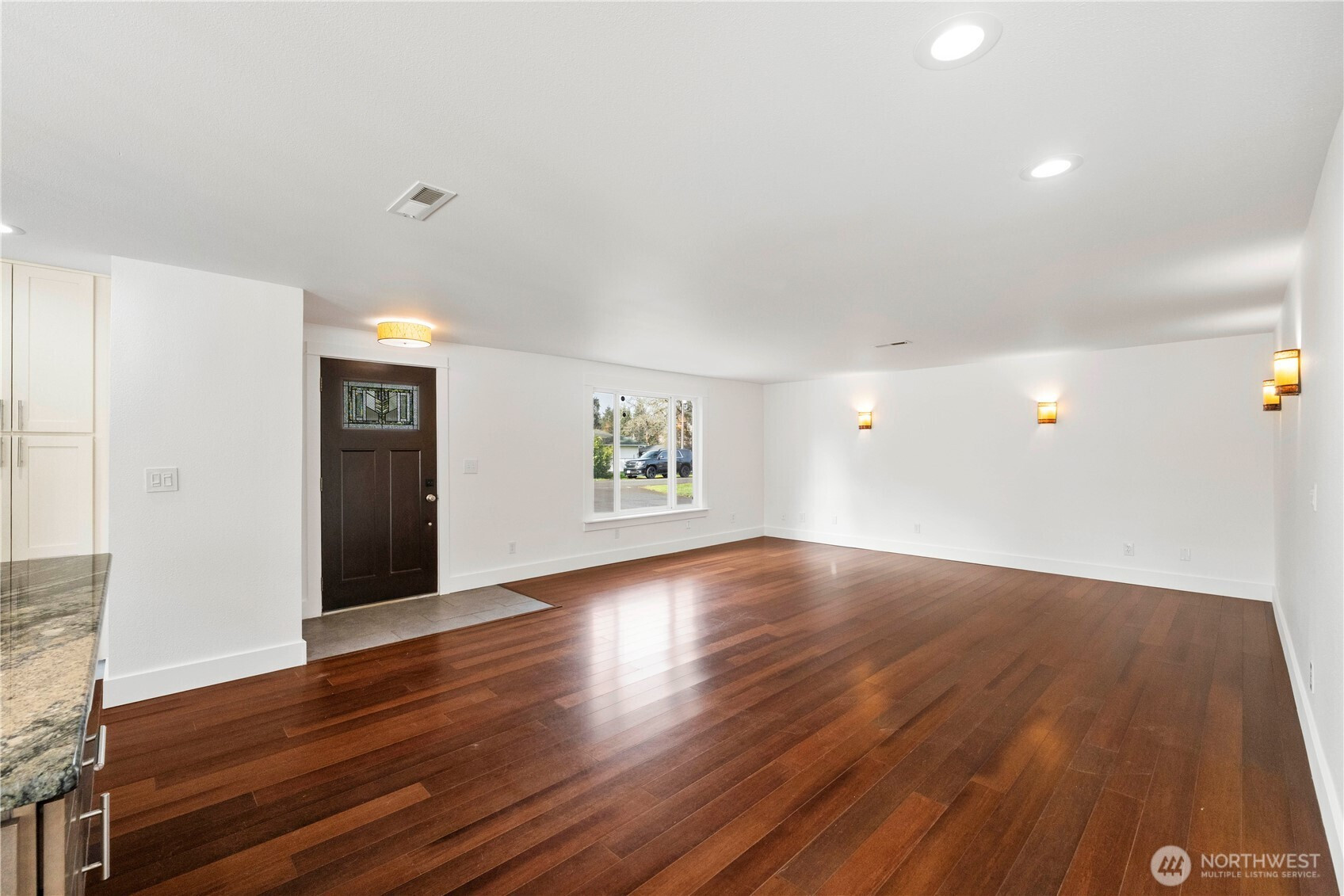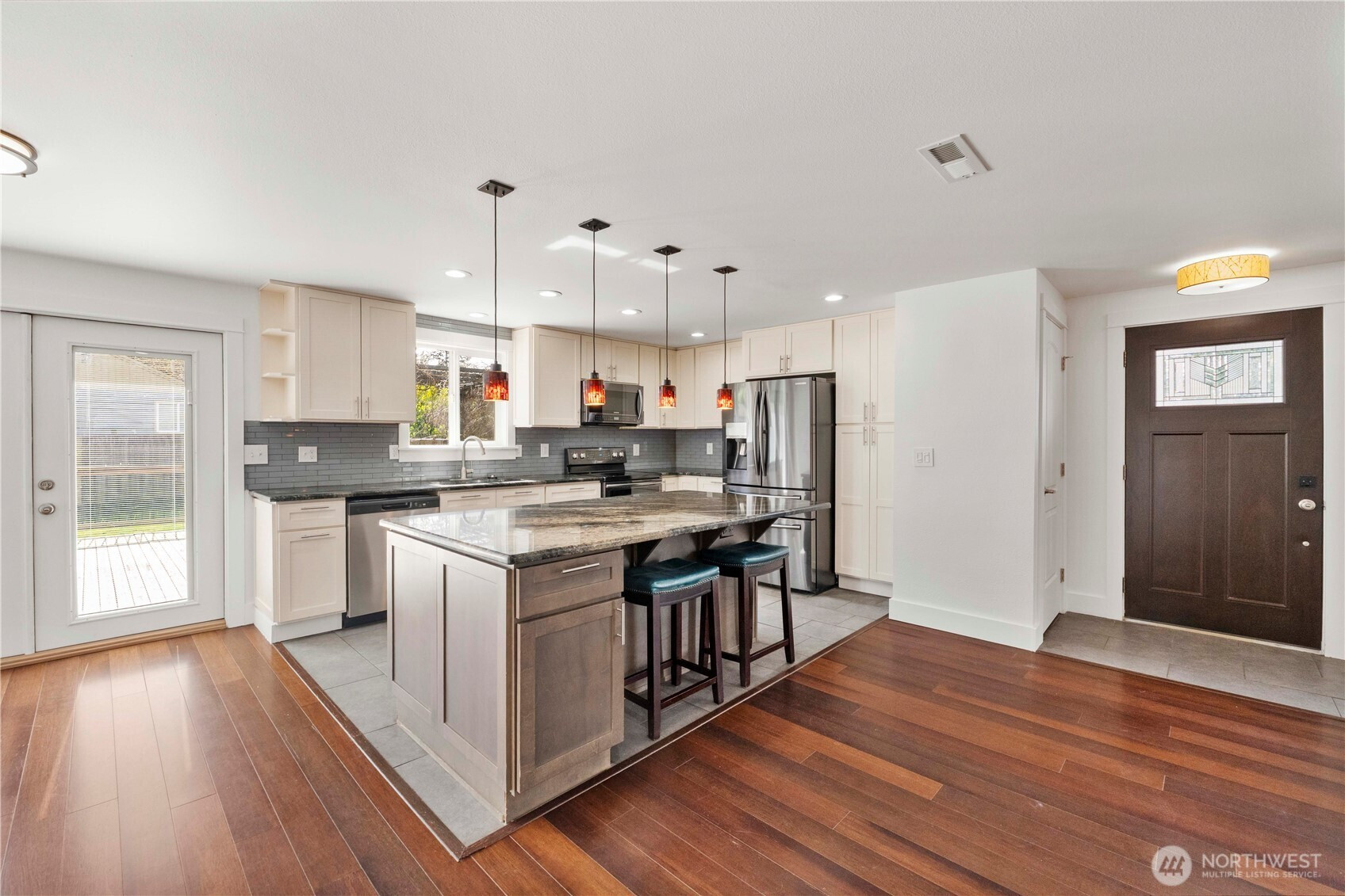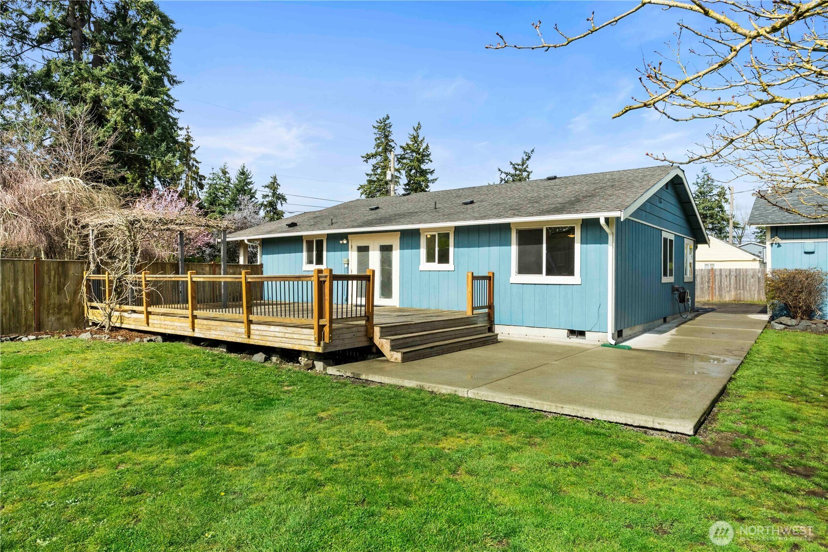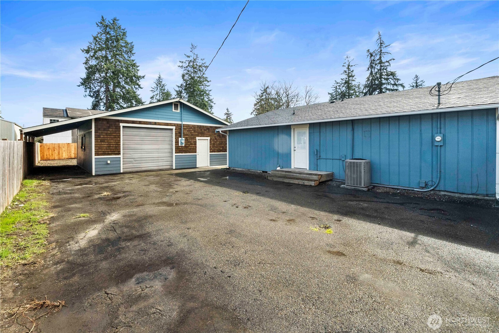 Hard-to-find beautifully remodeled rambler with a shop! Inviting covered front porch welcomes you into the spacious family room with bamboo flooring and open layout. Stunning kitchen boasts an island with bar seating, gorgeous granite slab countertops with bullnose edges, tile backsplash, stainless steel appliances including a double oven, and custom Founder's Choice soft close cabinets with ambient lighting underneath and convenient inside cabinet slide out drawers. The dining area offers French doors that lead to a large deck. Perfect for indoor-outdoor entertaining! Outside you will also find a fully fenced backyard featuring two drive-through gates, a finished and insulated 30x30 shop with sewer and water hookups, its own commercial meter and 200-amp service, plus an attached 8x30 carport offering ample space for an RV and all your toys! Enjoy year-round comfort and lower utility bills with the Heat pump with A/C. Don’t miss this incredible opportunity, this home truly has something everyone will love!