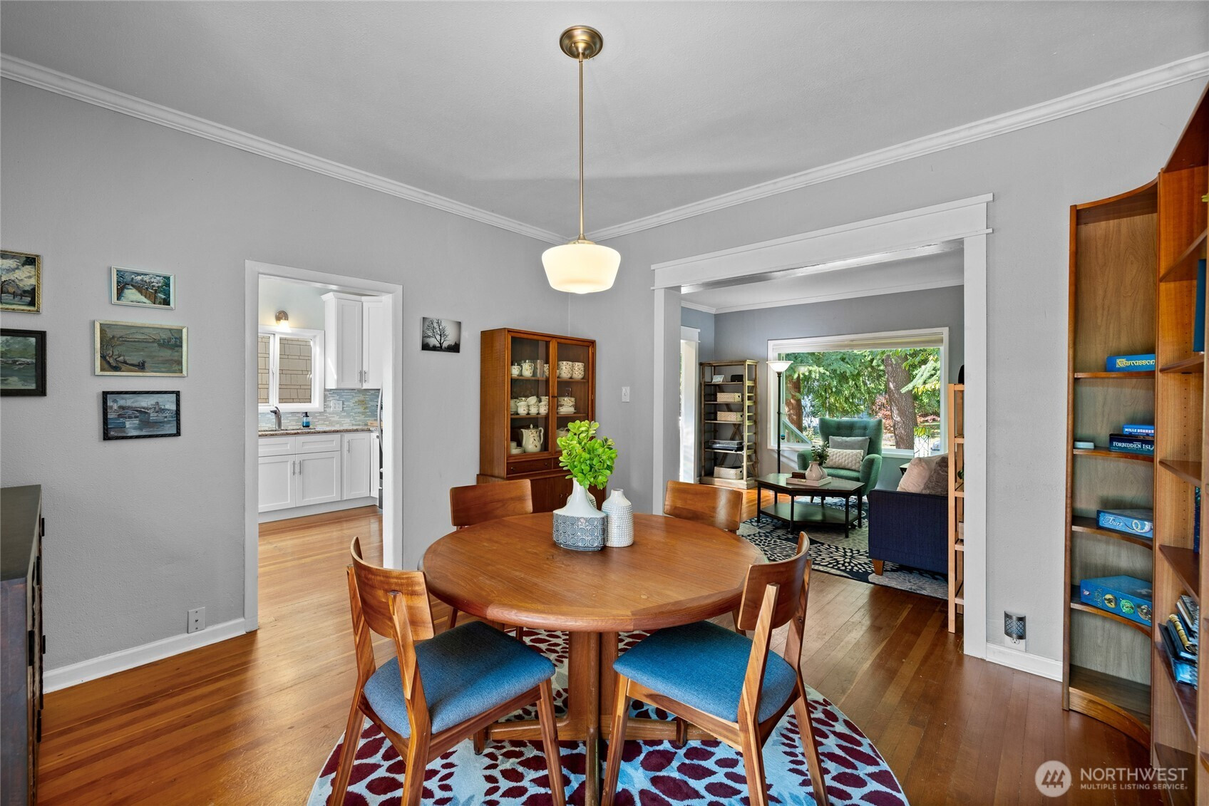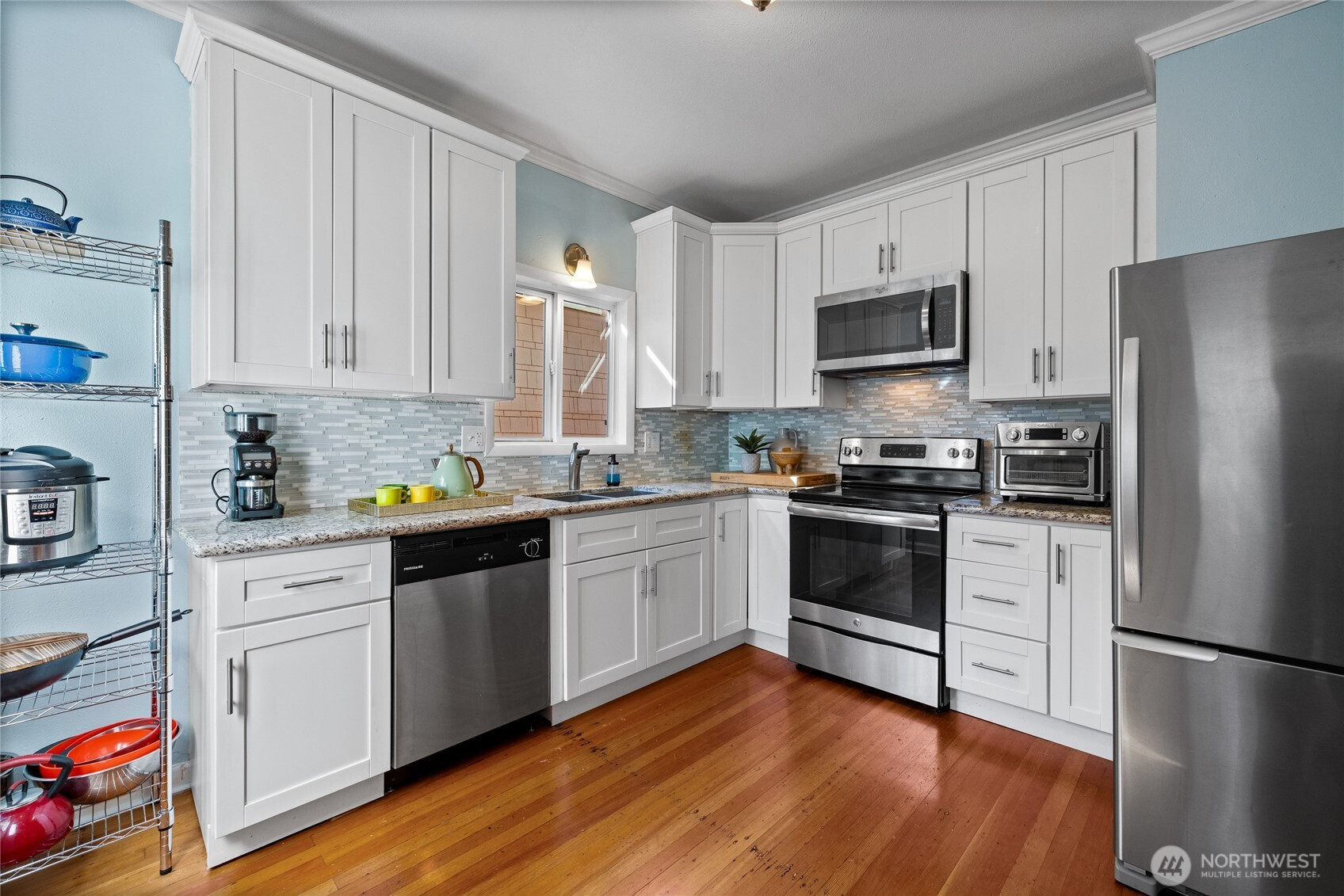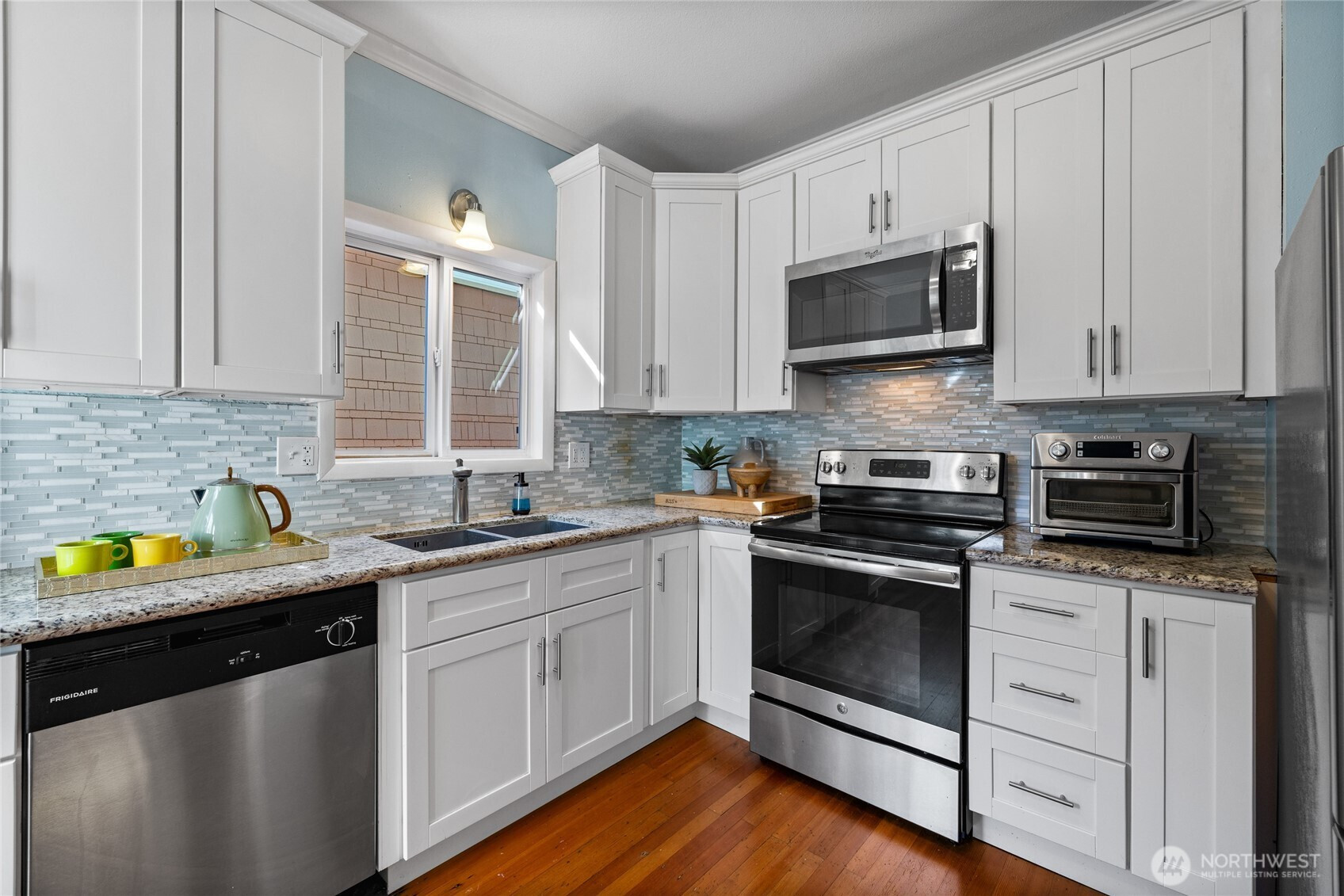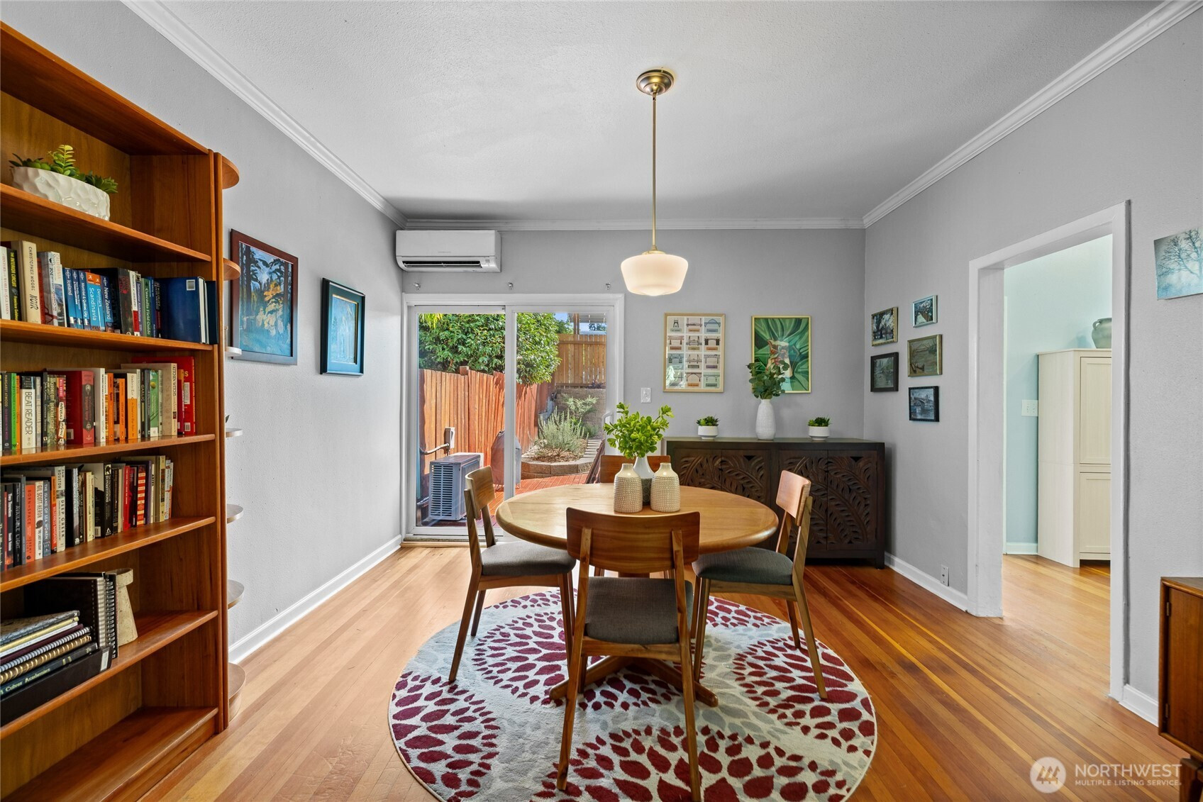 Welcome to this charming Craftsman in North Tacoma’s UPS neighborhood! This 2-bedroom, 1 ½-bath home blends classic character with smart updates. Fir floors, trim, and molding create warmth, while the spacious living and dining rooms open to a freshly painted deck. The kitchen offers granite counters, tile backsplash, & stainless-steel appliances. A ductless split-system heat pump provides year-round comfort. Upstairs are two bedrooms and a remodeled ¾ bath. Outside, enjoy a newly landscaped yard, raised covered carport, and storage shed, new exterior paint, newer roof & gutters. With Quantum Fiber 1GB internet, working from home is convenient. Close to UPS, parks, restaurants, and shopping, this home offers historic charm & modern comfort.
