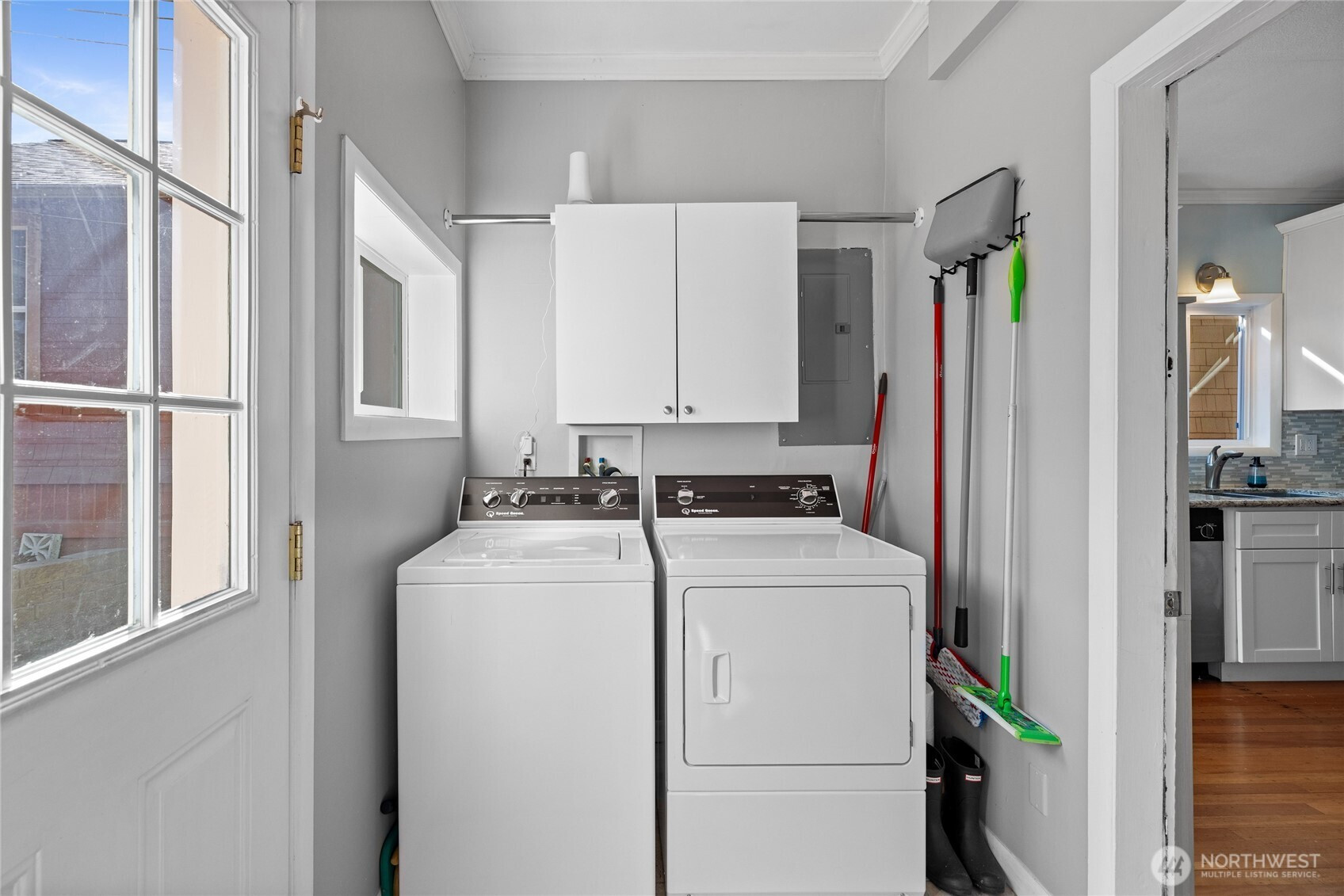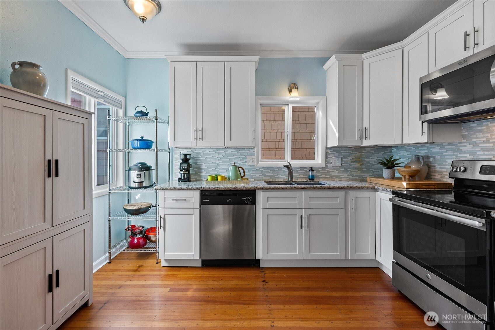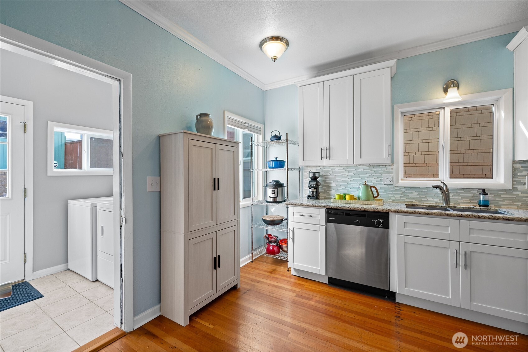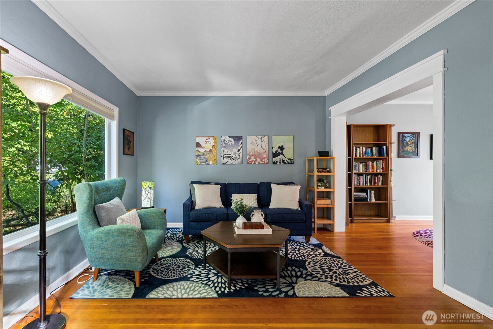 Welcome to this charming Craftsman in North Tacoma’s UPS neighborhood! This 2-bedroom, 1 ½-bath home blends classic character with smart updates. Fir floors, trim, and molding create warmth, while the spacious living and dining rooms open to a freshly painted deck. The kitchen offers granite counters, tile backsplash, & stainless-steel appliances. A ductless split-system heat pump provides year-round comfort. Upstairs are two bedrooms and a remodeled ¾ bath. Outside, enjoy a newly landscaped yard, raised covered carport, and storage shed, new exterior paint, newer roof & gutters. With Quantum Fiber 1GB internet, working from home is convenient. Close to UPS, parks, restaurants, and shopping, this home offers historic charm & modern comfort.