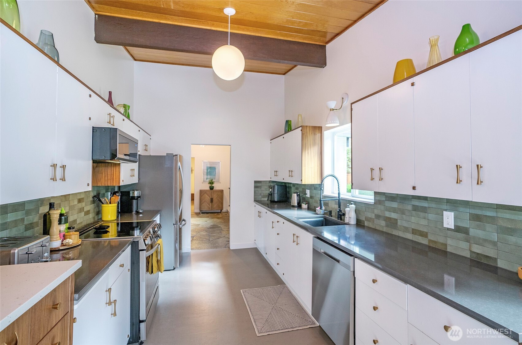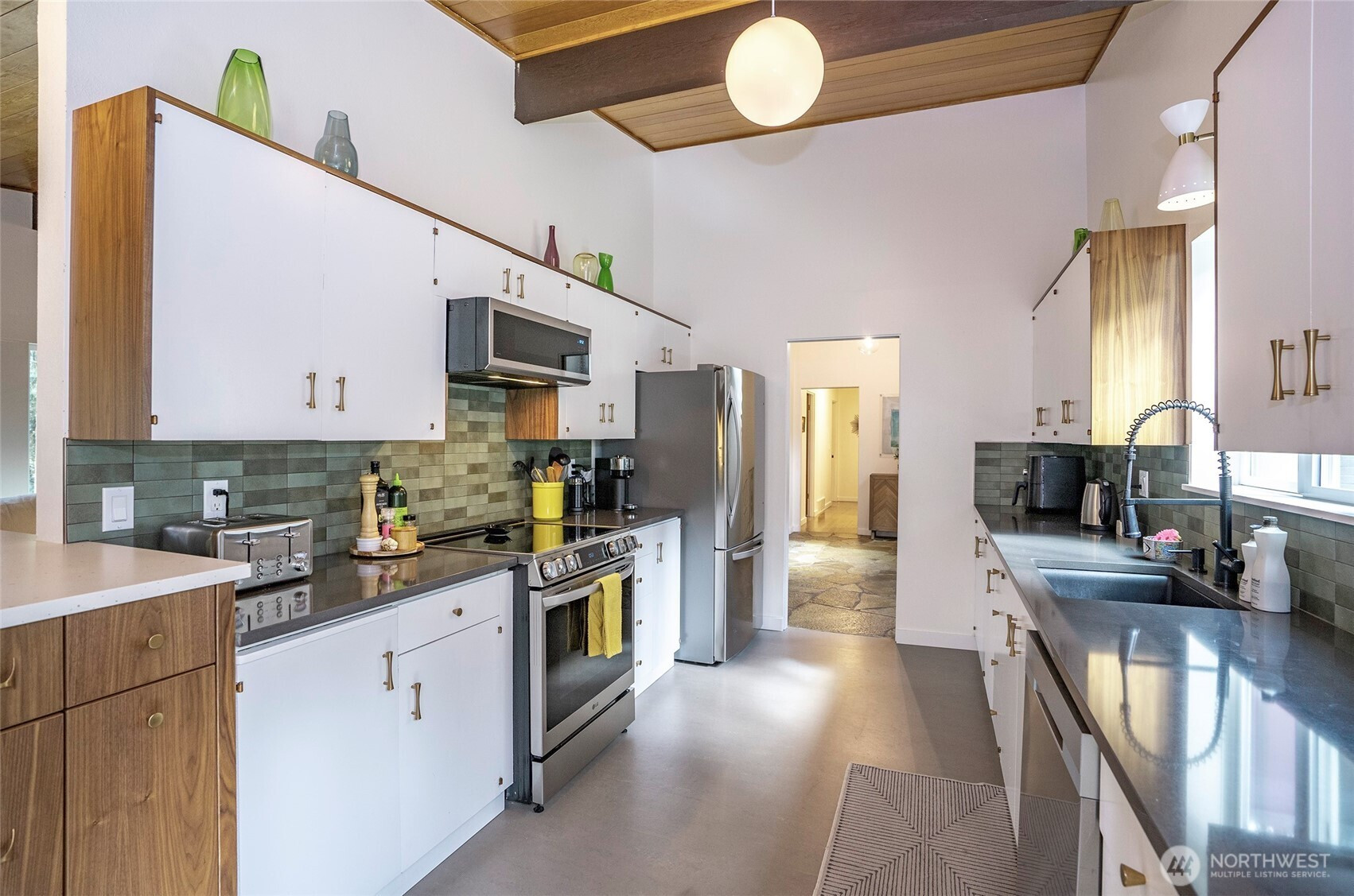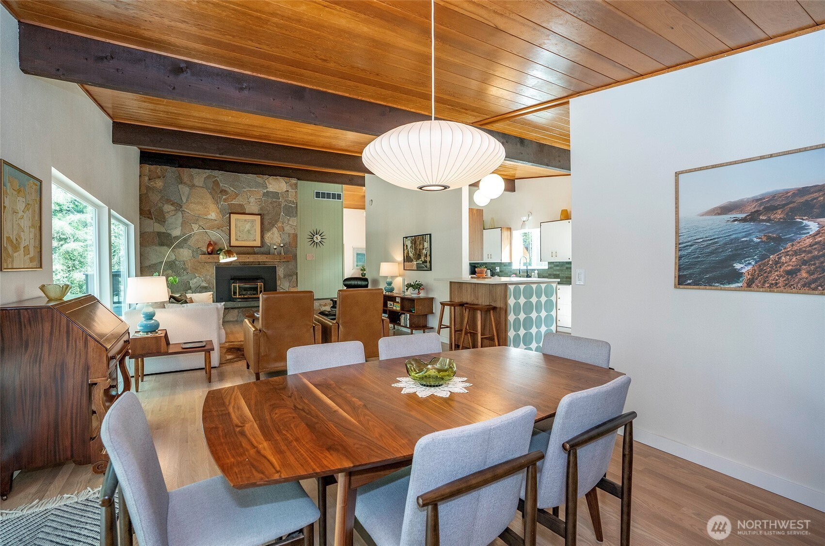 Expansive and thoughtfully curated midcentury ranch, originally built in 1962, blending timeless character with modern updates. A level entry opens to a stone foyer and a striking great room with vaulted beamed ceilings and a dramatic slate fireplace. Brand new double paned windows fill the home with natural light, highlighting new hardwood floors and a design approach that honors midcentury modern style with clean lines and a desirable aesthetic. The updated kitchen features quartz countertops, stainless appliances, and refined finishes that complement the home’s architectural roots. Four spacious bedrooms retain original millwork, built-in closets, and endless charm. Bathrooms have been refreshed with a cohesive, modern touch. Outdoor living shines with west facing elevated decks ideal for relaxed entertaining, surrounded by extensive landscaping & fencing improvements that enhance privacy and curb appeal. The daylight lower level offers a large rec room with fireplace and generous flex space, perfect for a creative studio, home office, or future ADU. Complete with carport, RV and boat parking, and set on a quiet cul-de-sac corner lot in a secluded Lakewood neighborhood, just minutes from water recreation, beautiful parks, public & private golf options, excellent schools, and close to JBLM. This is a home you need to experience in person to fully appreciate its space, light, and design.