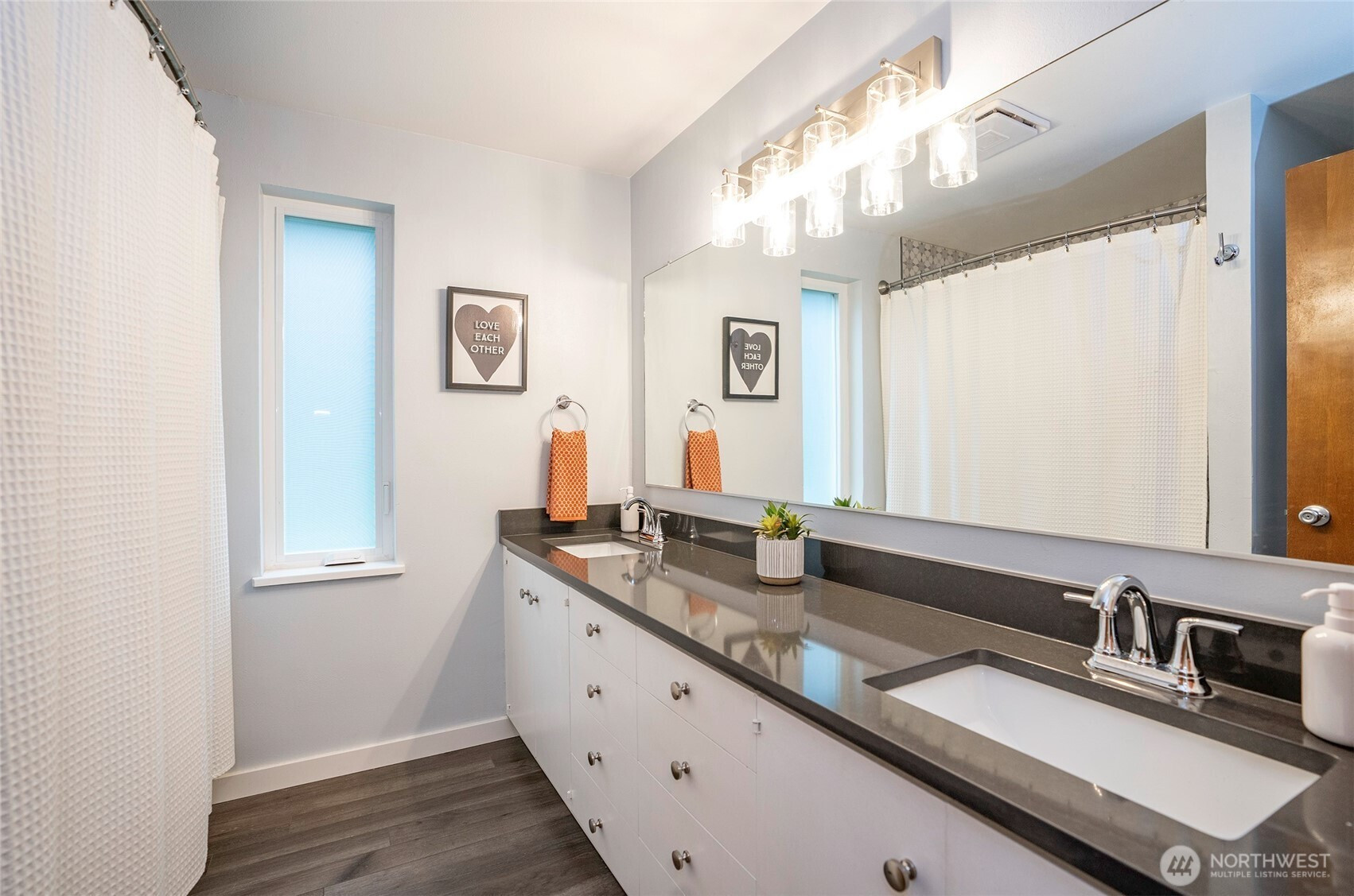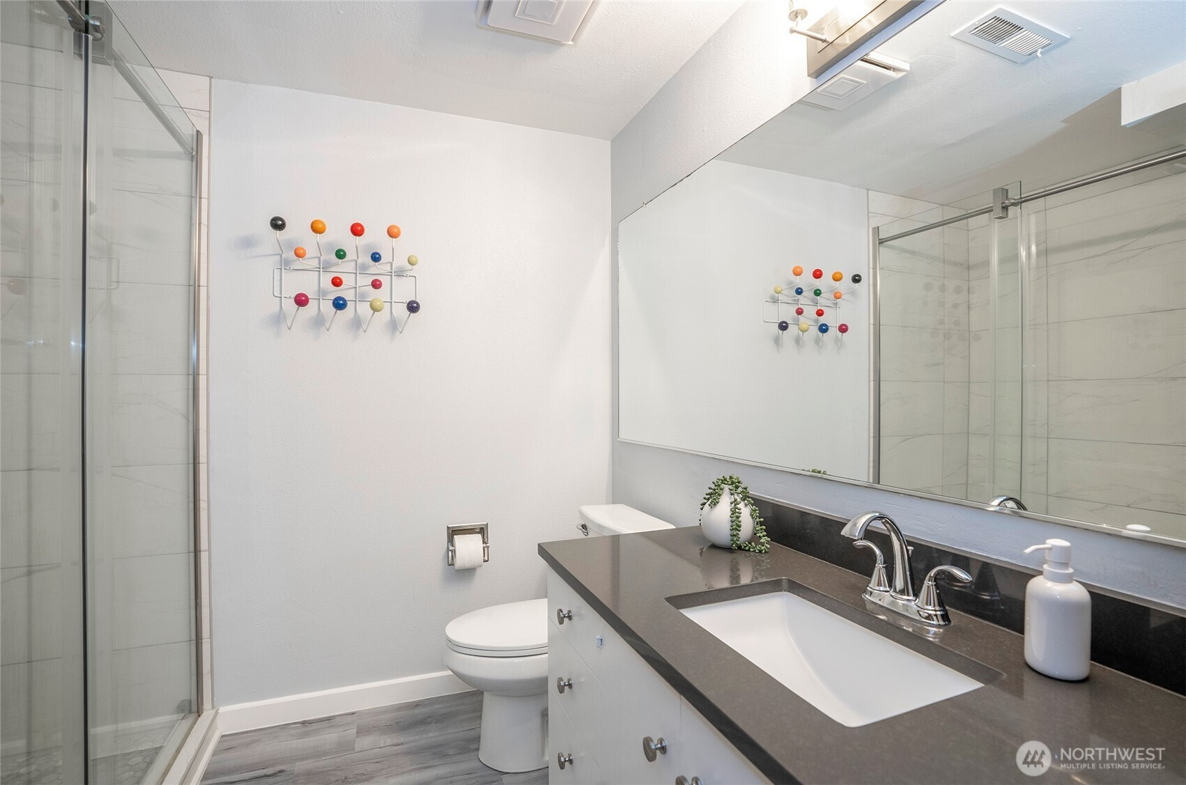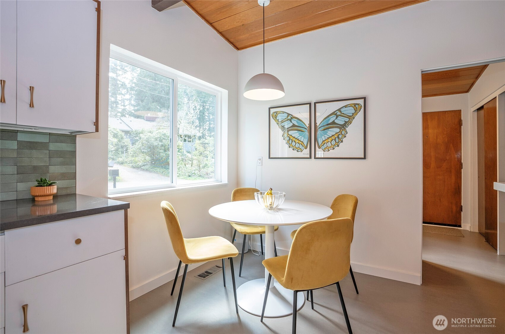Expansive and thoughtfully curated midcentury ranch, originally built in 1962, blending timeless character with modern updates. A level entry opens to a stone foyer and a striking great room with vaulted beamed ceilings and a dramatic slate fireplace. Brand new double paned windows fill the home with natural light, highlighting new hardwood floors and a design approach that honors midcentury modern style with clean lines and a desirable aesthetic. The updated kitchen features quartz countertops, stainless appliances, and refined finishes that complement the home’s architectural roots. Four spacious bedrooms retain original millwork, built-in closets, and endless charm. Bathrooms have been refreshed with a cohesive, modern touch. Outdoor living shines with west facing elevated decks ideal for relaxed entertaining, surrounded by extensive landscaping & fencing improvements that enhance privacy and curb appeal. The daylight lower level offers a large rec room with fireplace and generous flex space, perfect for a creative studio, home office, or future ADU. Complete with carport, RV and boat parking, and set on a quiet cul-de-sac corner lot in a secluded Lakewood neighborhood, just minutes from water recreation, beautiful parks, public & private golf options, excellent schools, and close to JBLM. This is a home you need to experience in person to fully appreciate its space, light, and design.