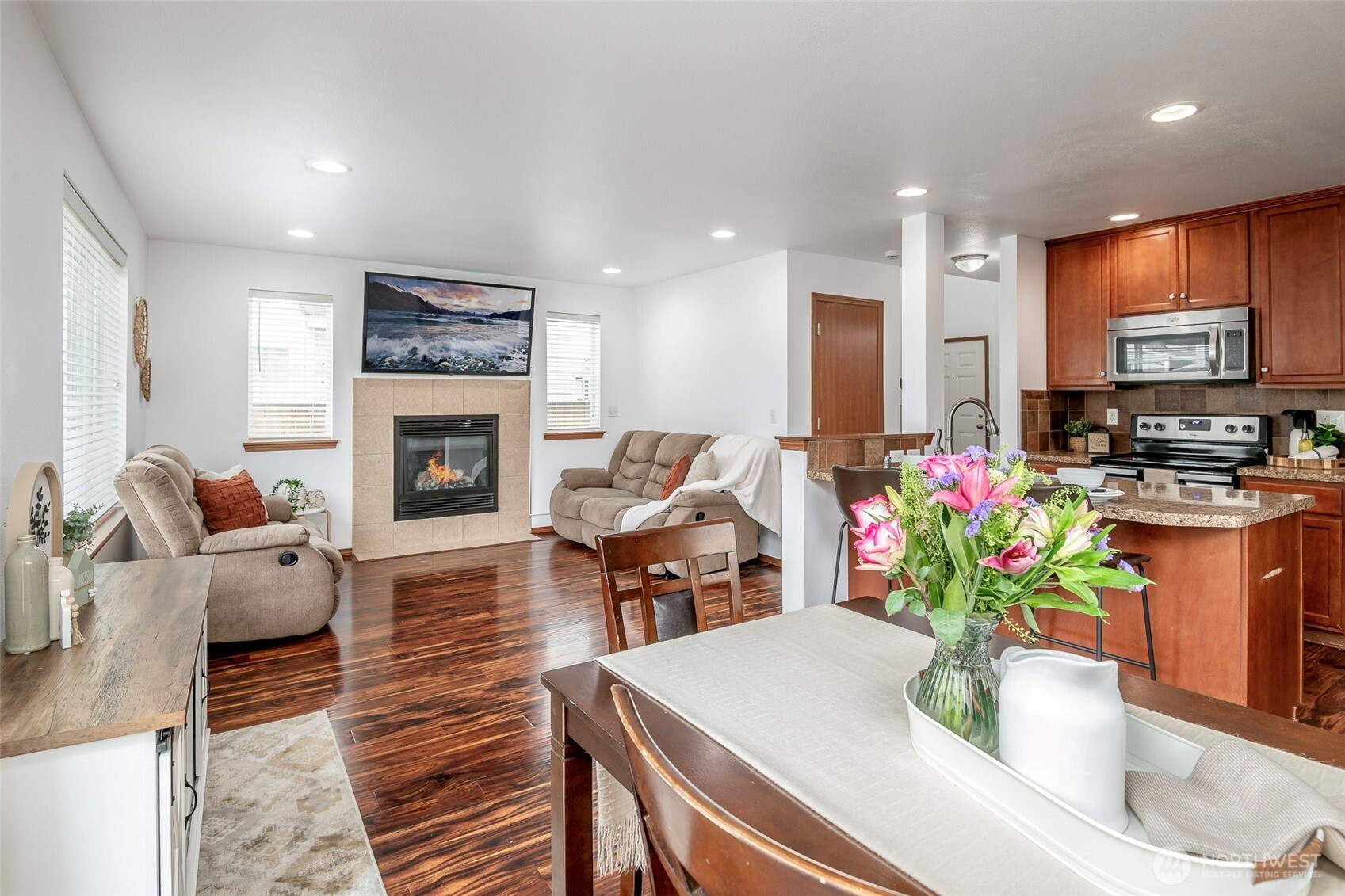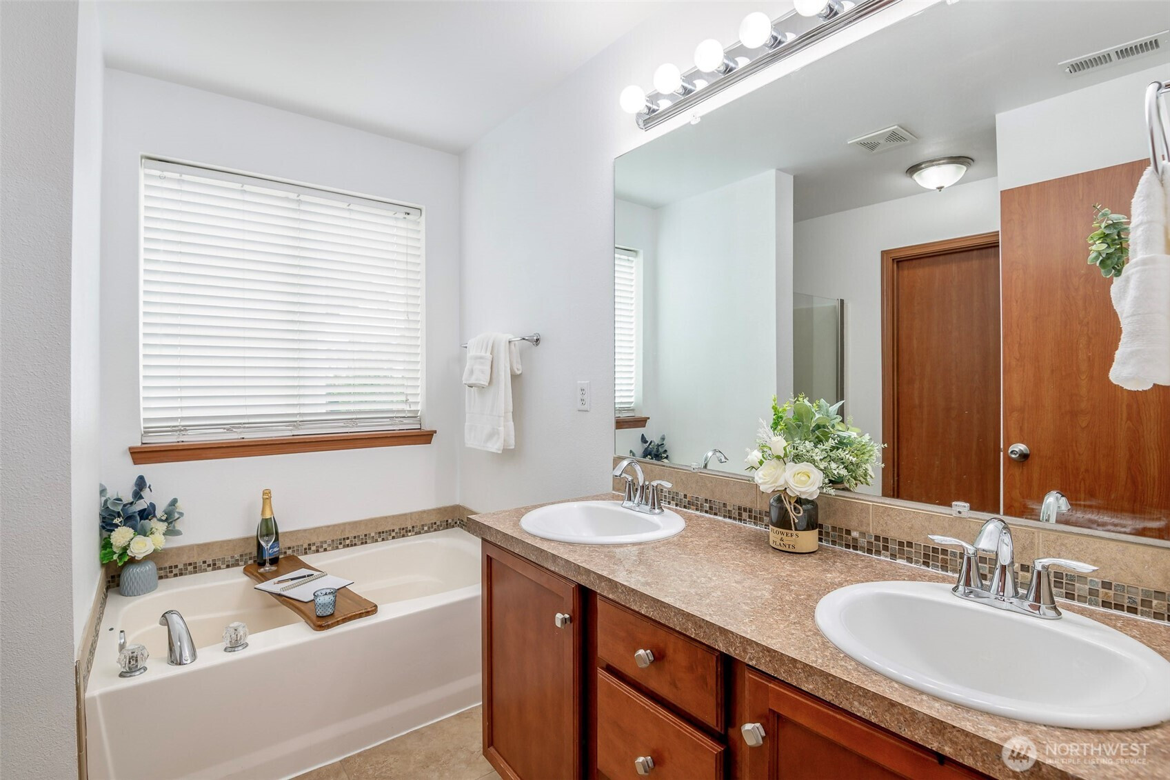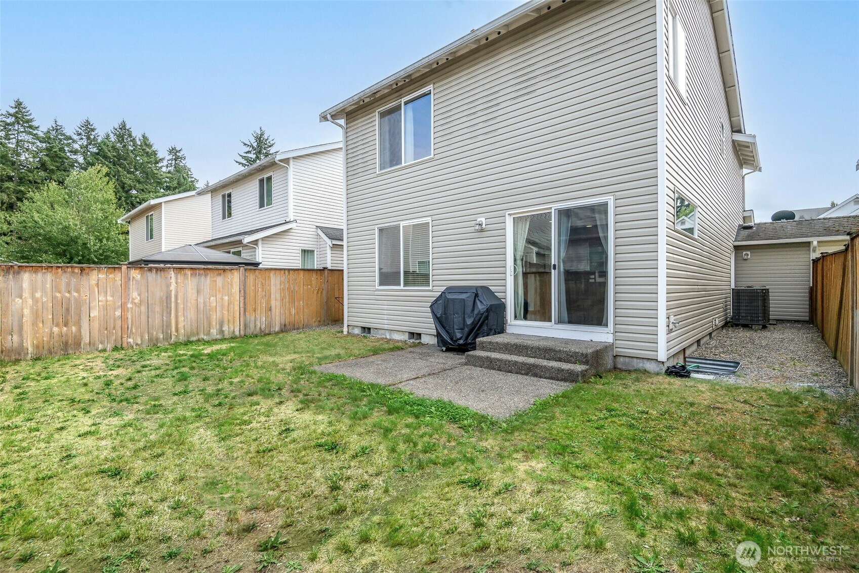 Welcome home! Step into the bright entry with vaulted ceilings leading to an open great room with beautiful laminate flooring and a cozy gas fireplace. Fresh interior paint throughout creates a move-in ready feel. Spacious open concept kitchen perfect for entertaining. Upstairs you’ll find a versatile loft/bonus space, two bedrooms, guest bath, and a luxurious primary suite with a 5-piece bath featuring a soaker tub and massive walk-in closet. Enjoy the fully fenced backyard with patio and garden beds, while central AC keeps you cool all summer. Complete with a 2-car garage offering custom built-ins for a home office or extra storage. Centrally located near shopping, dining, entertainment, and schools!