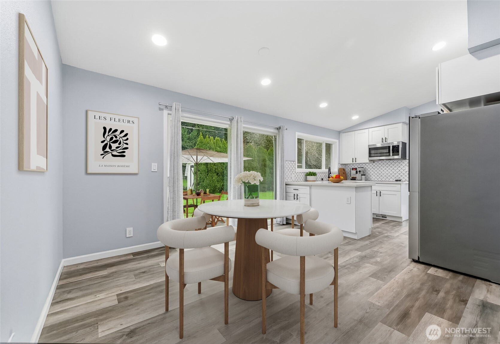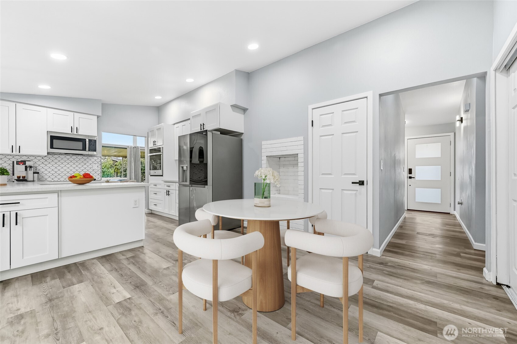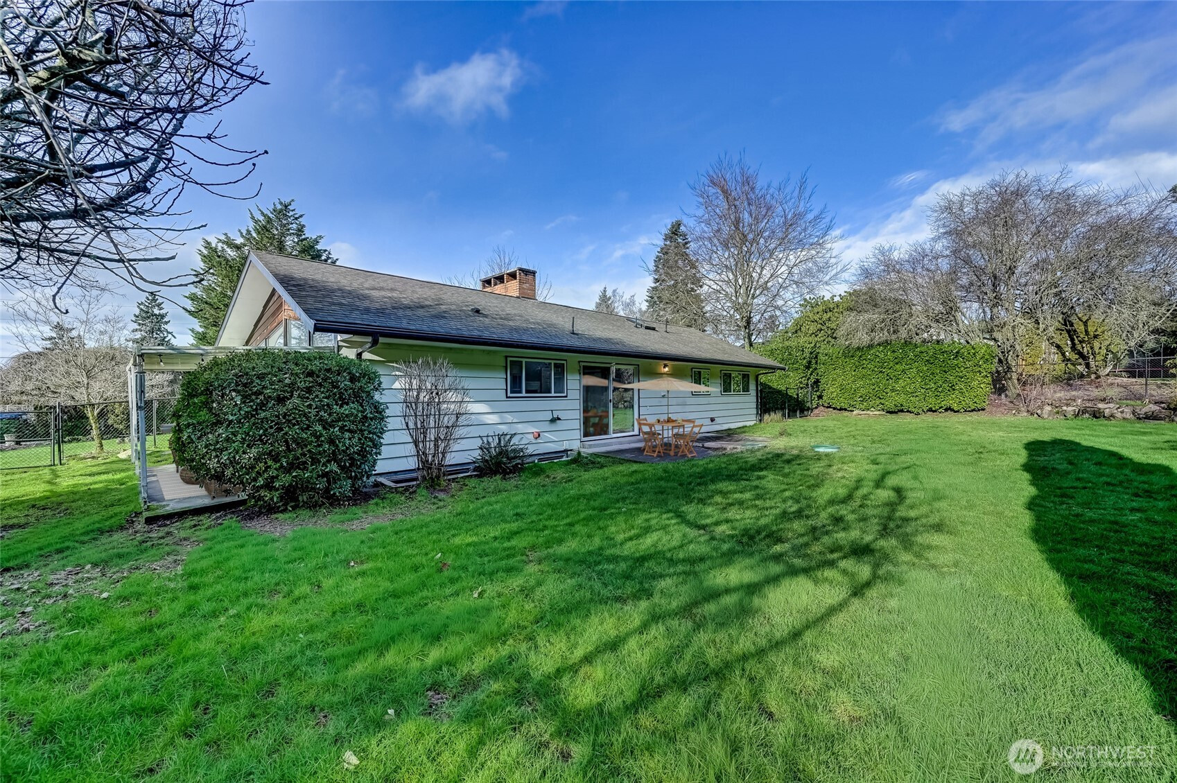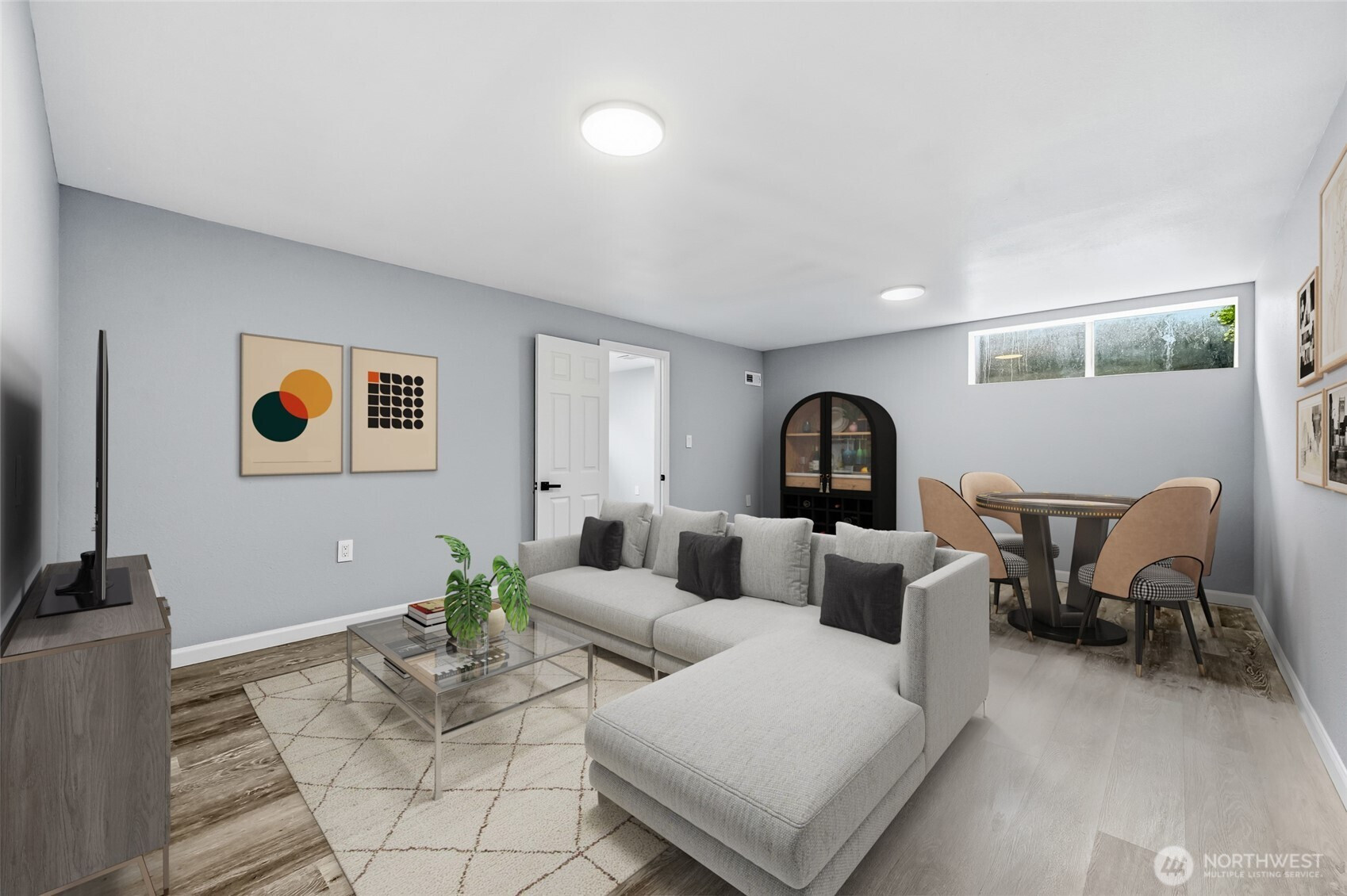 Mid-Century Modern Show Piece! Pristine Home In Quiet Established Neighborhood! Totally remodeled property of 3-4 bedrooms & 2 bathrooms. Polished hard surface floors greet at the front door & continue throughout the home. Great room of windows for living/dining offers plenty of natural light & opens to spacious covered relaxing patio. Expansive sized kitchen has plenty of cabinets, counter space & roomy informal eating nook. Primary ste is airy, good-sized, with attractive bathrm. 2-guest bedrooms share full sized bath. Downstairs basement has a massive family room that can handle your largest of furniture. Additionally there is a bonus or 4th bedrm downstairs. Newer appliances-furnace-water heater, huge level lot, 2-car garage, RV park!