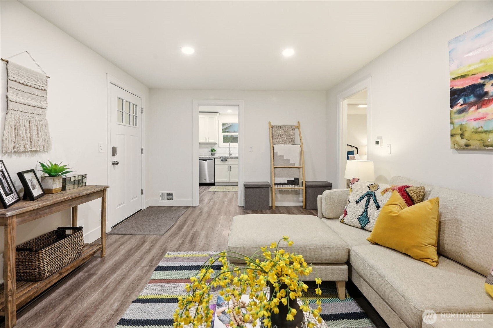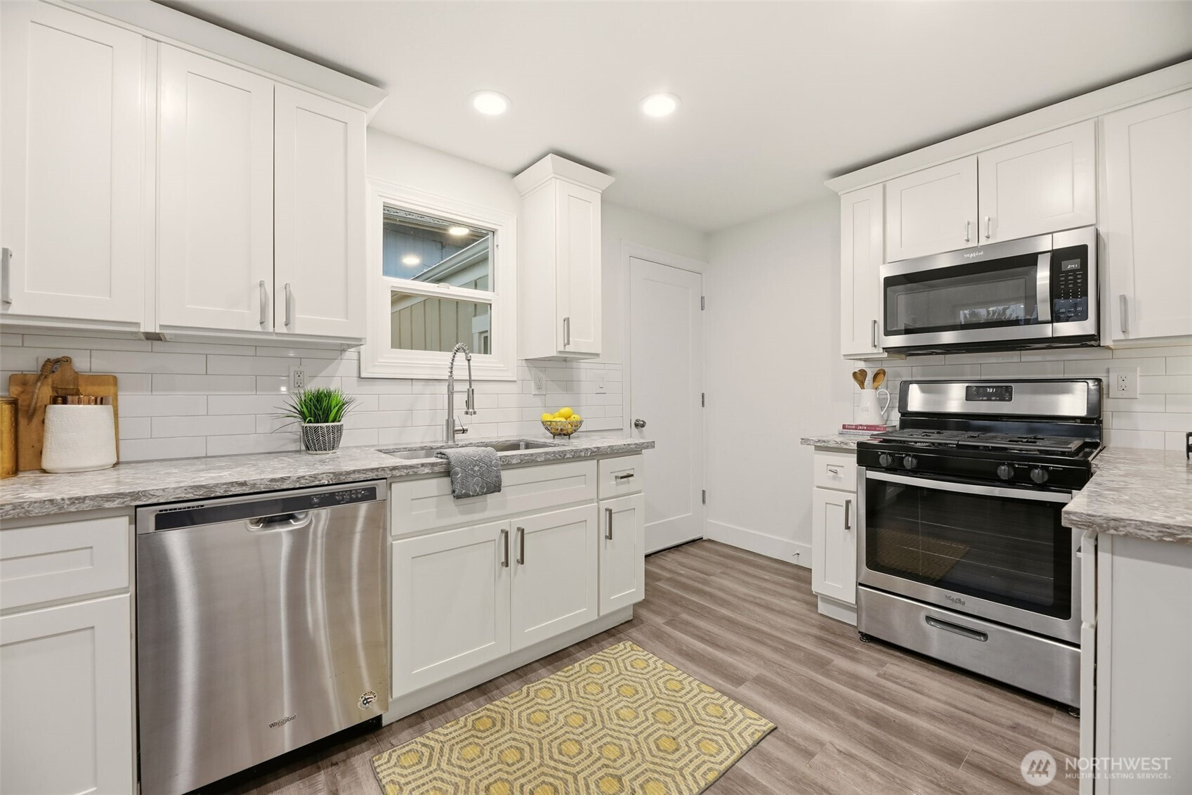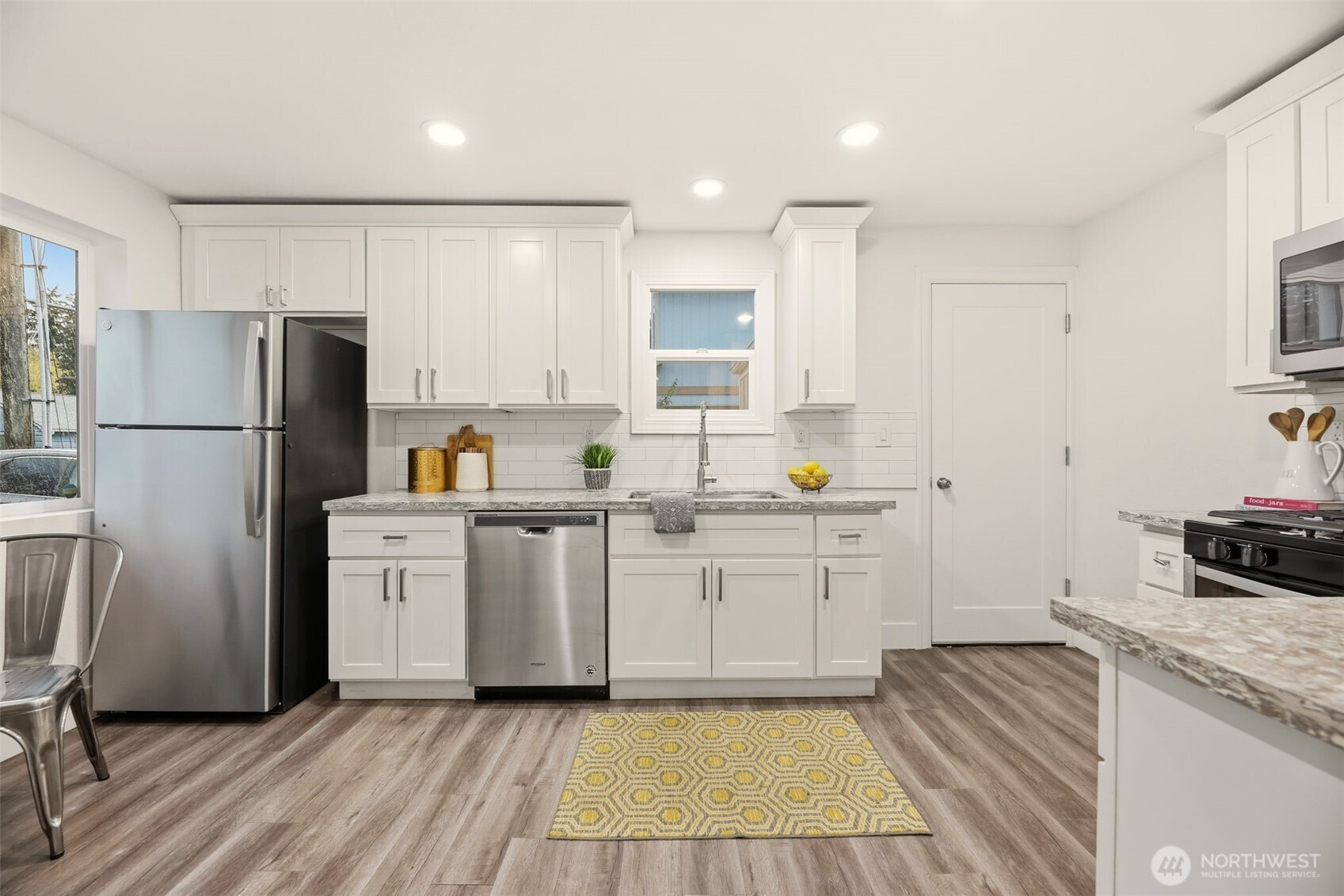 This charming 1 story home is fully remodeled with a kitchen that features quartz counters, SS steel appliances, white shakers, Double pane windows throughout. Interior/exterior is freshly painted with spacious bedrooms.The bathroom have new vanities, quartz counters,& faucets. One car garage with a automatic opener that was recently installed and just added fresh gravel for the driveway. Bring your vision for the 702sf unfinished basement where washer and dryer is located. Take advantage of the leveled backyard for all your outdoor or build a potential DADU! Centrally located around the coveted Parkland area with access to major highway's & JBLM (Military Base).