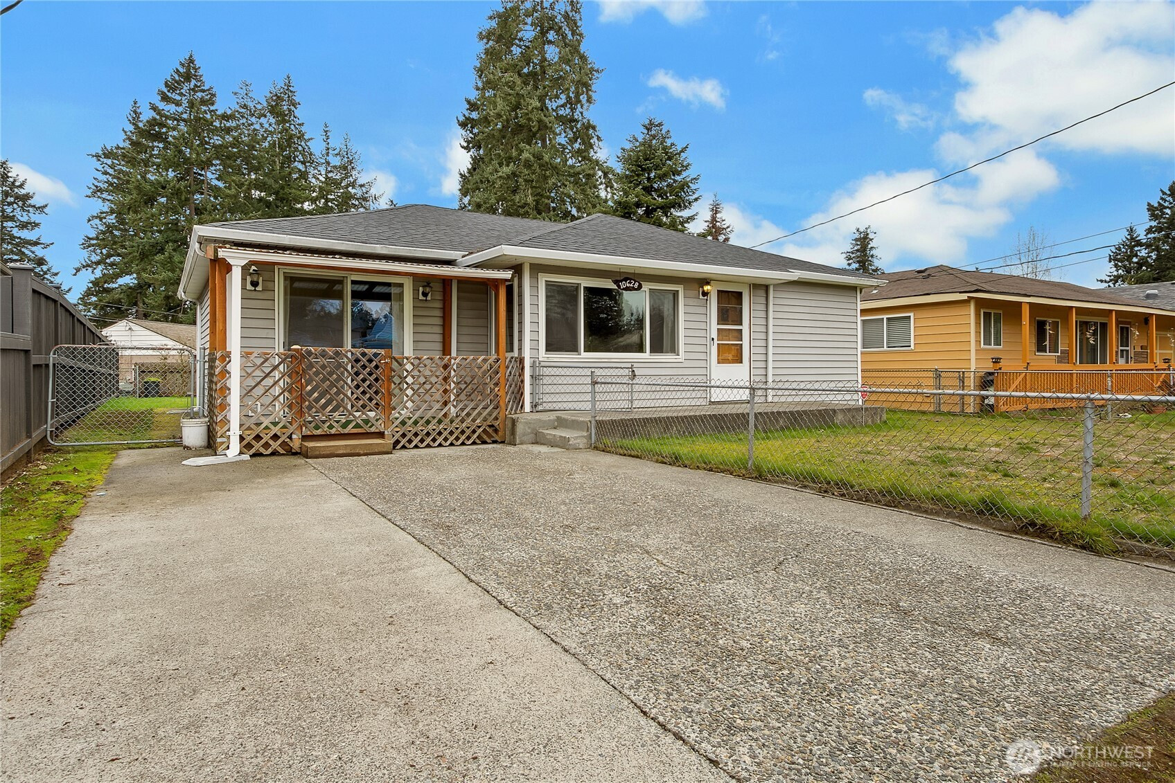 This single-story home is situated on a surprisingly spacious lot with an expansive backyard. Conveniently located near JBLM and I-5 this rambler offers flexibility and outstanding potential. Whether you are searching for your first home, looking to downsize, or adding to your investment portfolio, this property delivers both opportunity and location. The home includes a newer roof (2021), hardwood floors in the bedrooms, newer carpet in the living room (hardwood underneath), and an additional finished room with laminate flooring for added versatility. Triple-pane krypton-filled windows (excluding the slider) provide energy efficiency and comfort. Enjoy the covered front porch. The fully fenced yard offers space to garden, entertain, or play, and the detached shed provides excellent storage or workshop potential. Centrally located and full of possibilities, this is a home you will want to see in person.