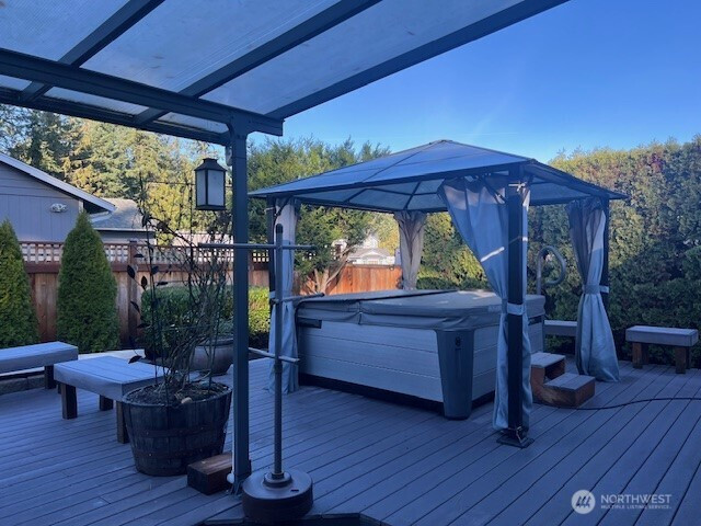 Move-in ready and close to great schools, parks, and shopping! This well-kept 3-bed, 1 3/4 bath rambler sits on a spacious corner lot and features new landscaping, sprinkler system, newer roof, hot water tank, and a brand-new electrical panel. The bright kitchen has one of kind acrylic counter, gas stove, and SS appliances.The kitchen eating area opens to a sunny patio and large backyard with nice deck and covered salt water hot tub, perfect for gatherings. Enjoy skylights, and a pre-wired sound system. The primary suite offers roomy lighted closet system with pull out racks. The laundry area includes washer, dryer, great cabinets. Newly seeded yard with fresh landscaping and clean cement edging completes this move-in ready home!