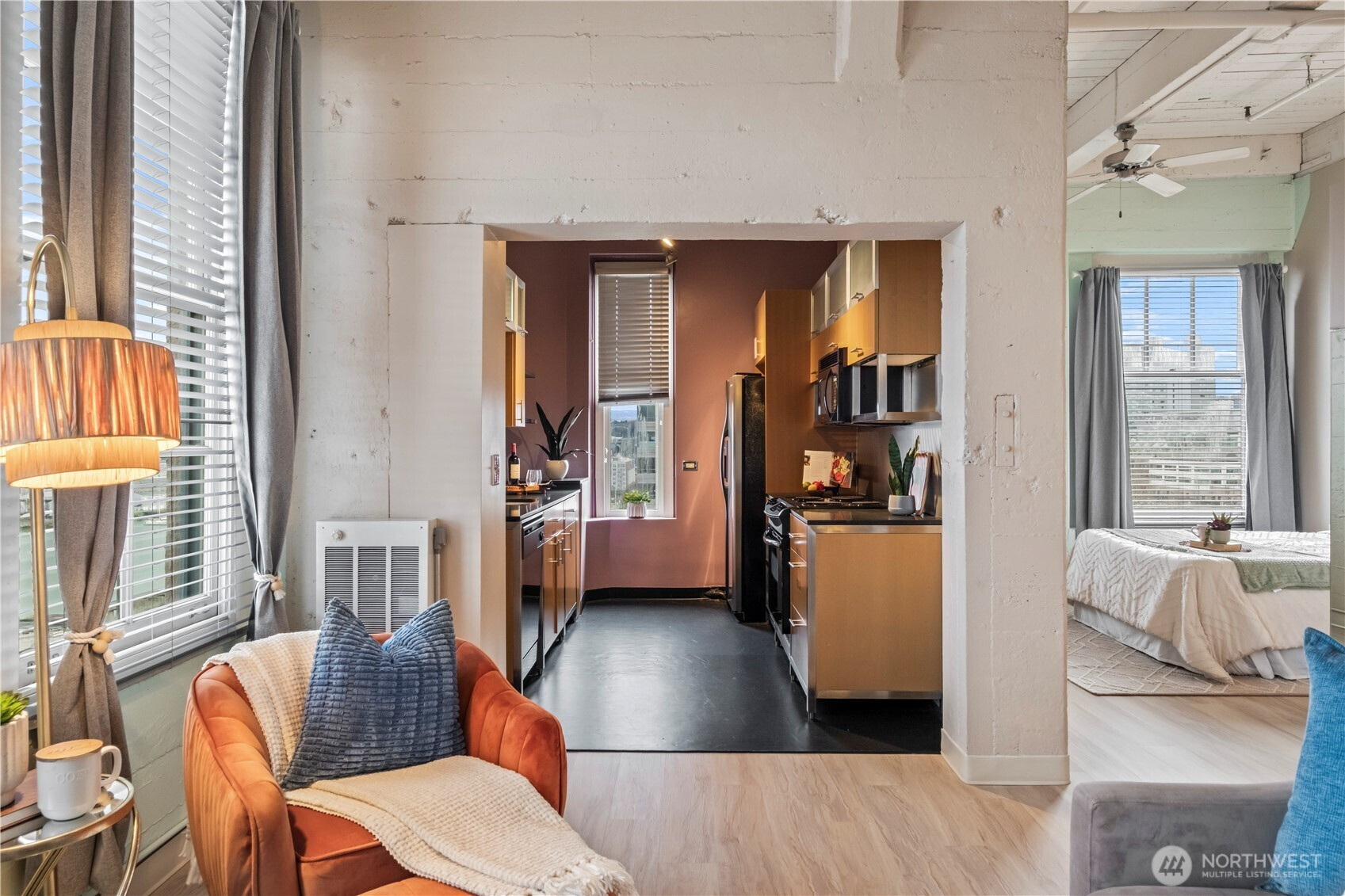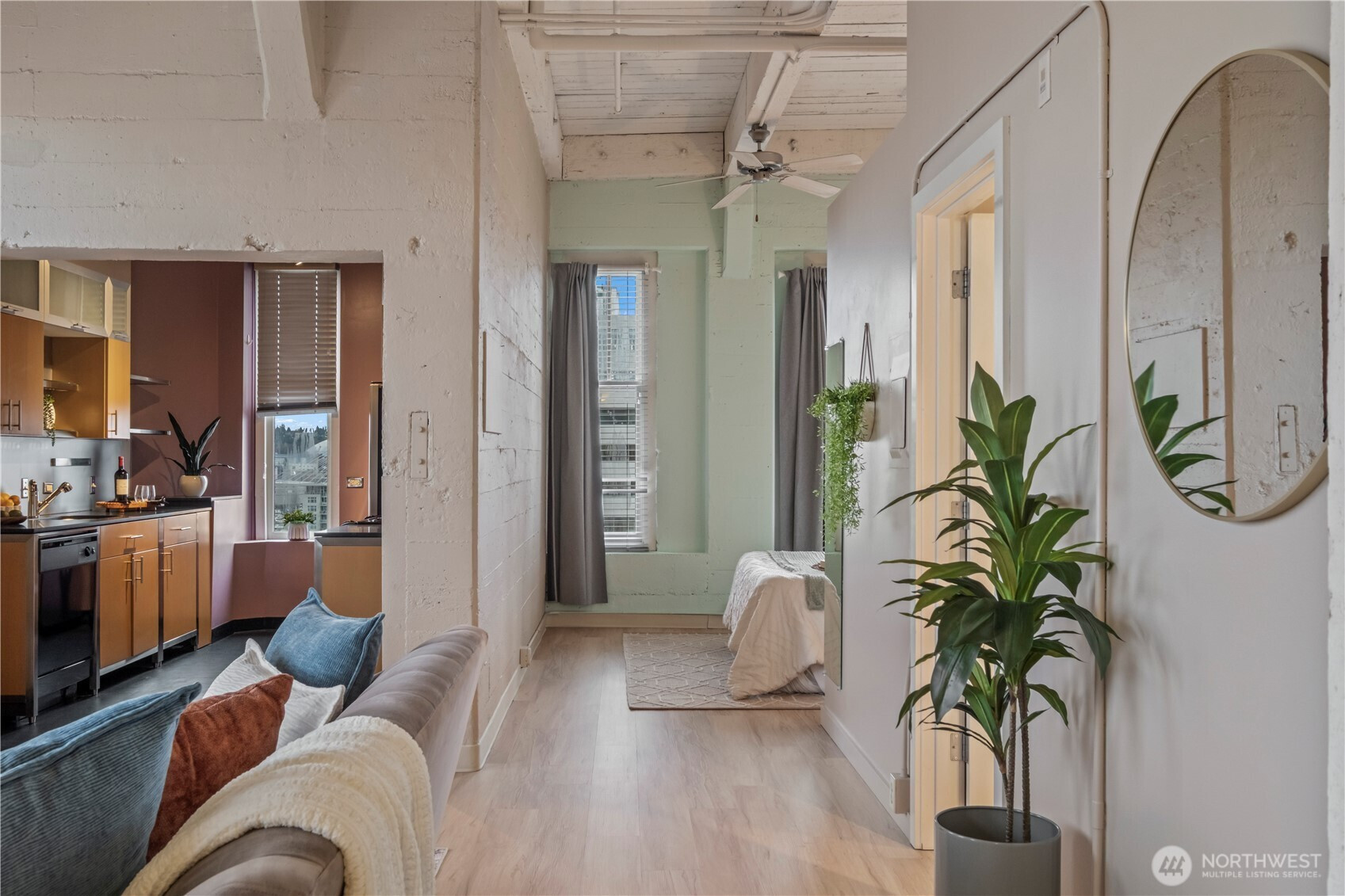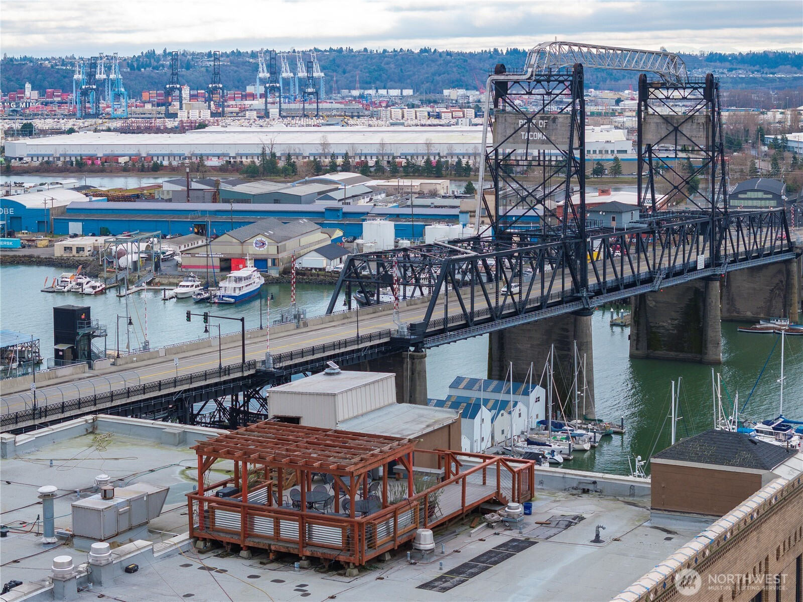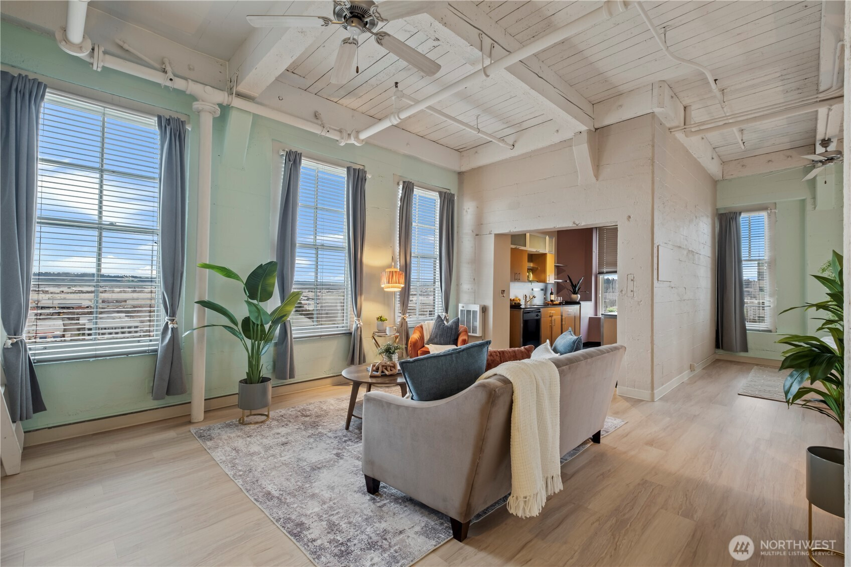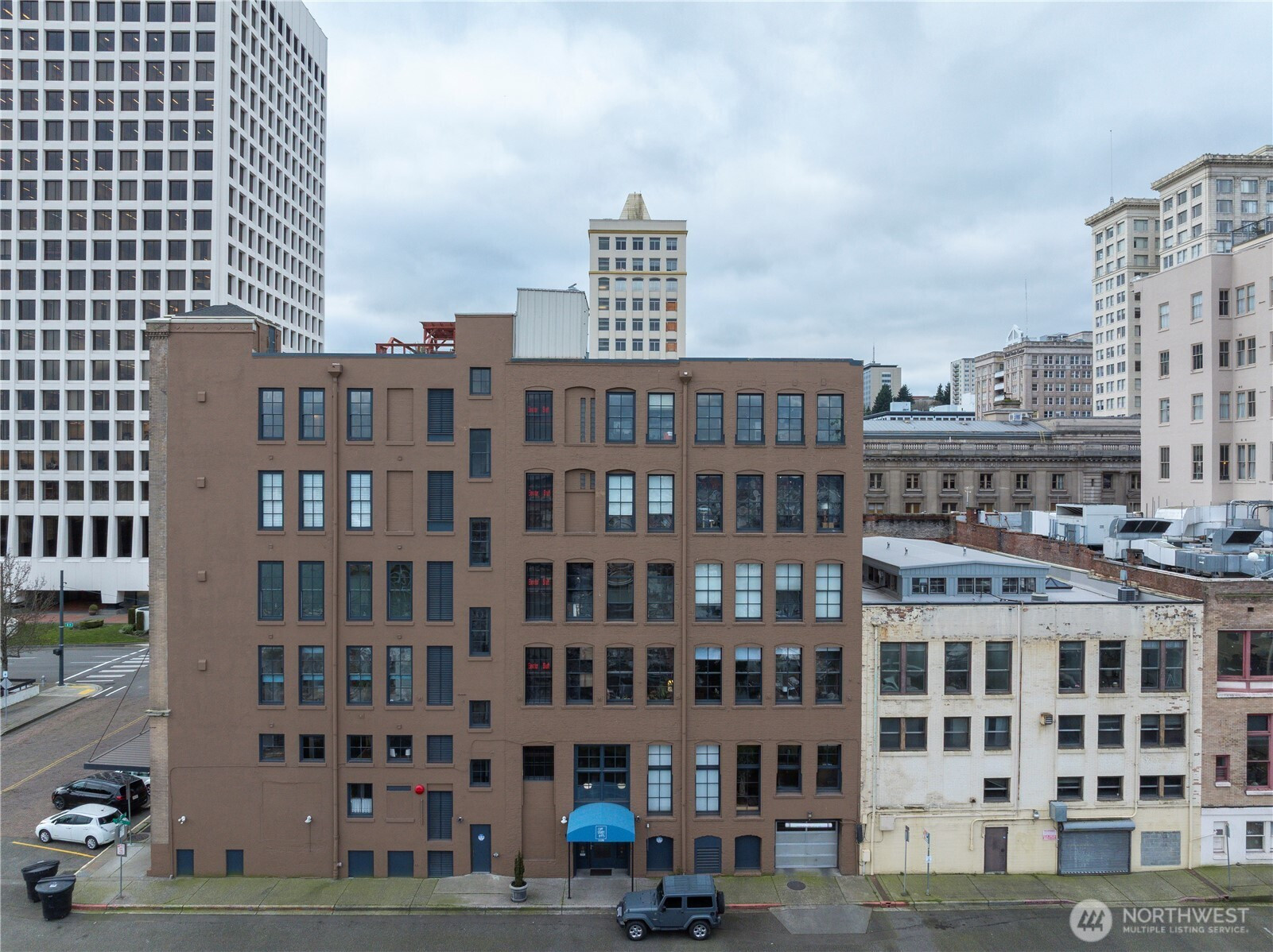 This top-floor penthouse at historic Cliff Street Lofts offers spectacular, unobstructed views of Mount Rainier, the Thea Foss Waterway, and the city skyline. The open-concept layout is among the premier units in the building, featuring a bank of six floor-to-ceiling windows and premium plank flooring that create a bright, refined living environment. The contemporary kitchen includes a distinctive industrial touch with original freight elevator up/down buttons integrated into the design. A spacious bedroom captures mountain views. Building amenities include secure premium owned garage parking near the entrance, a private storage locker, laundry facilities, and a rooftop deck with panoramic views, barbecue area, and garden space. Nearby highlights include the University of Washington Tacoma campus, Museum of Glass, Tacoma Art Museum, the Thea Foss Waterway, Point Ruston, and Point Defiance Park. Transit access includes the Tacoma Link Light Rail. Move-in ready.