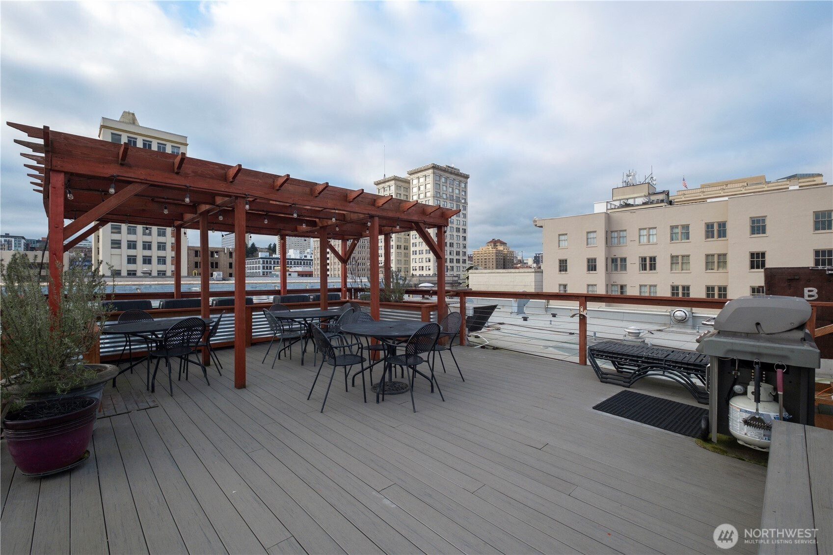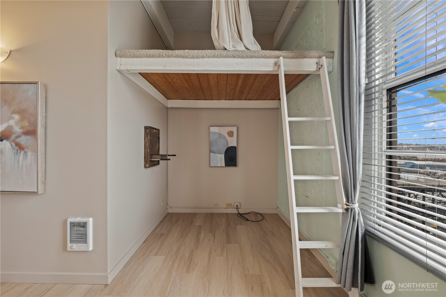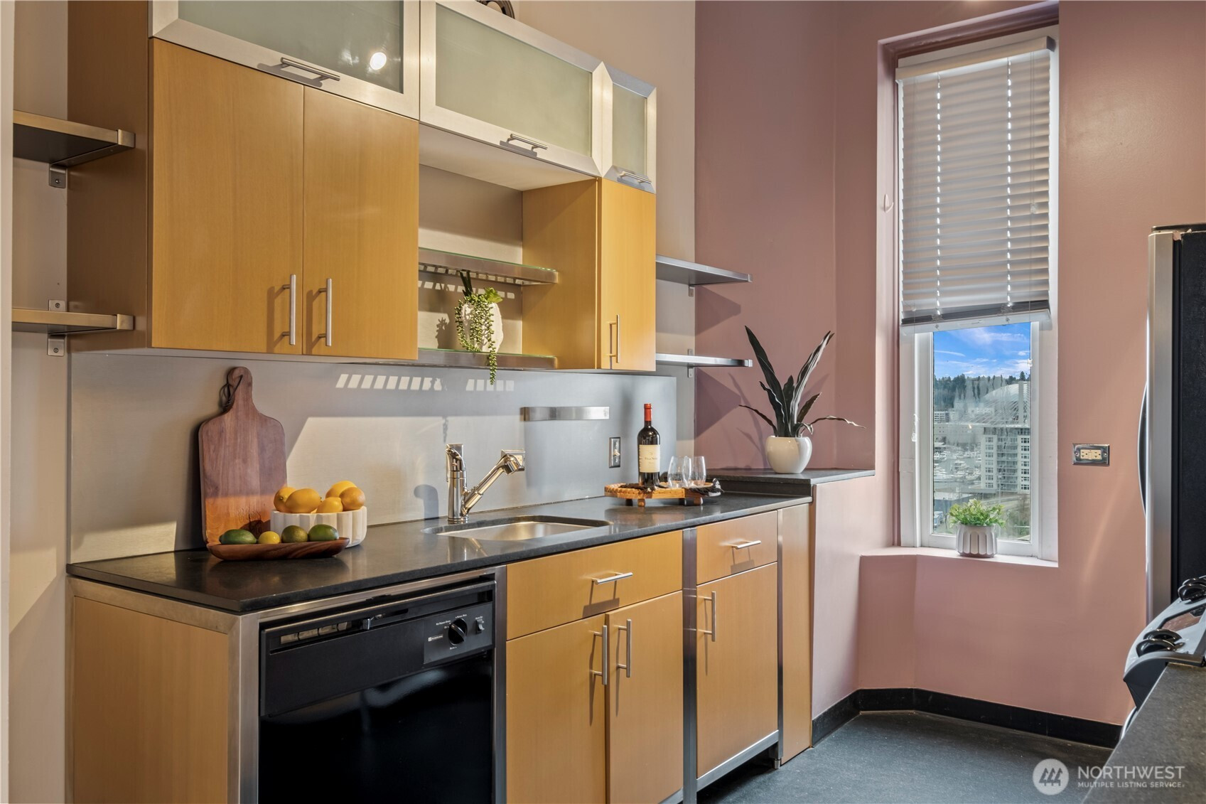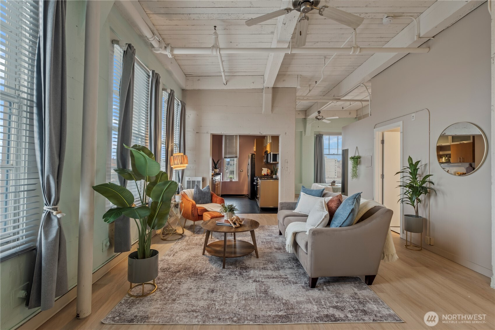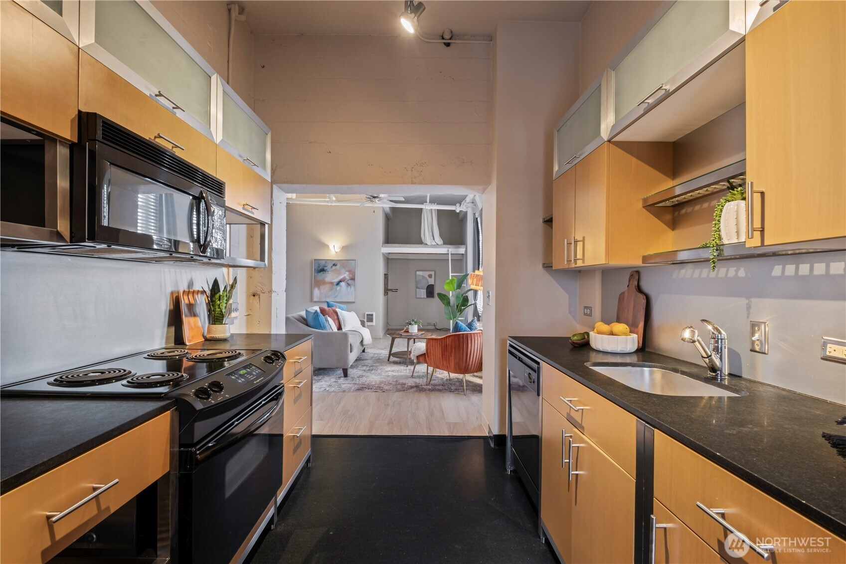 This top-floor penthouse at historic Cliff Street Lofts offers spectacular, unobstructed views of Mount Rainier, the Thea Foss Waterway, and the city skyline. The open-concept layout is among the premier units in the building, featuring a bank of six floor-to-ceiling windows and premium plank flooring that create a bright, refined living environment. The contemporary kitchen includes a distinctive industrial touch with original freight elevator up/down buttons integrated into the design. A spacious bedroom captures mountain views. Building amenities include secure premium owned garage parking near the entrance, a private storage locker, laundry facilities, and a rooftop deck with panoramic views, barbecue area, and garden space. Nearby highlights include the University of Washington Tacoma campus, Museum of Glass, Tacoma Art Museum, the Thea Foss Waterway, Point Ruston, and Point Defiance Park. Transit access includes the Tacoma Link Light Rail. Move-in ready.