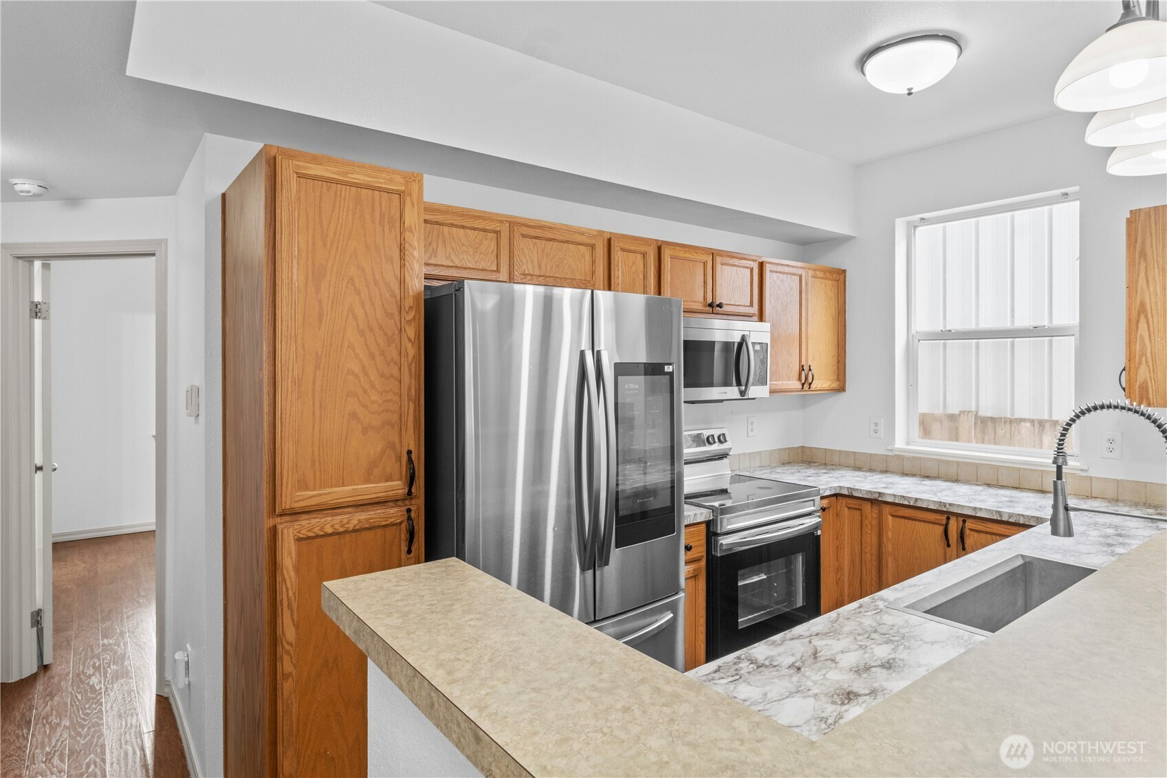 Convenient and easy living in the gated community of Village Commons! This freshly painted 1470 Square feet 2-story Single Family Attached Home features open-concept living and a bright kitchen with newer stainless steel appliances, breakfast bar, and slider leading to your private side yard with new artificial-turf for low-maintenance outdoor enjoyment. Generous size Living/Dining area with a Gas Fireplace. The convenient main-level primary suite offers a walk-in closet, large windows for natural light, and a full bath with double sinks. Updated half bath on main level as well. Upstairs features two additional bedrooms, a full bath with double sinks, laundry/utility room with the Washer/Dryer staying in the home, and an expansive landing ideal for an office-den-flex space, plus ample closet space throughout. 1 Car garage also allows for storage. Recent updates include a new furnace and new hot water tank. Located close to Joint Base Lewis-McChord, Freeways, Shopping, and everyday amenities.