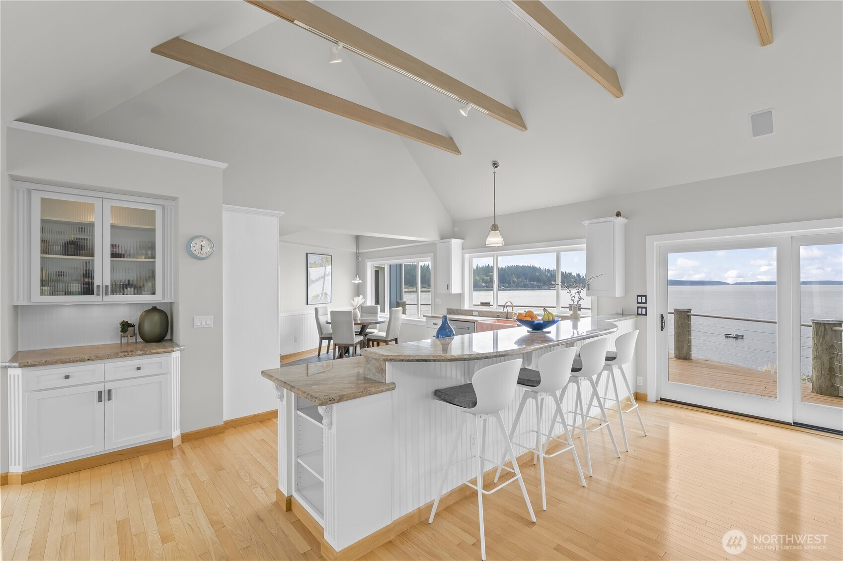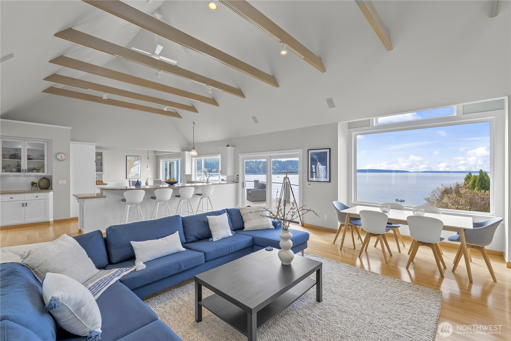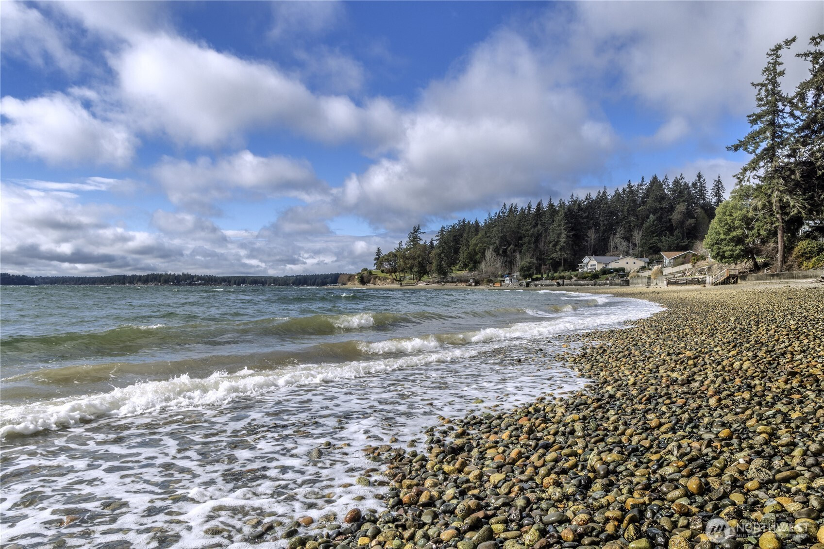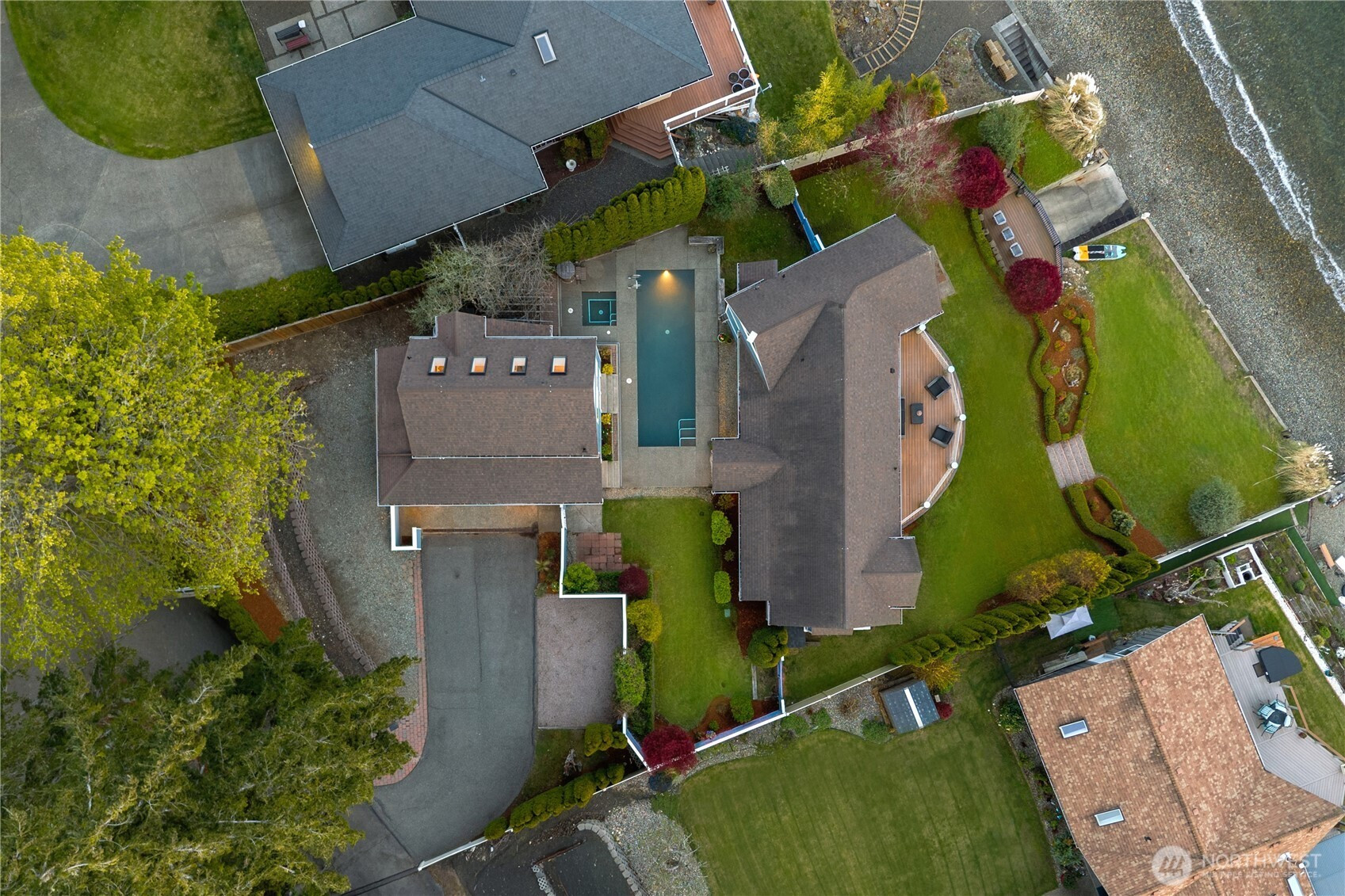 Waterfront retreat at the mouth of Rocky Bay with 90 feet of low-bank shoreline and true southern exposure, offering all-day natural light and expansive Puget Sound views from nearly every room. Soaring ceilings, hardwood floors, and an open-concept kitchen and living area flow seamlessly to multiple view decks, ideal for indoor-outdoor living. Nearly $100K in upgrades, including major systems, interior updates, and improvements to both the main home and detached guest house. Flexible layout with main-floor living, plus additional space for guests, remote work, or entertaining. Multiple view decks extend the living experience outdoors, making the water your everyday backdrop. Set on nearly half an acre with a pool, spa, private beach access, and detached guest quarters, perfect for both everyday living and hosting. Enjoy beach walks, wildlife sightings, and peaceful low-bank waterfront living in the Pacific Northwest. From long, relaxed walks on the beach with family and friends to quiet evenings watching the sunset, eagles overhead, and seals just offshore, don’t miss this rare opportunity to own a private slice of Pacific Northwest paradise.
