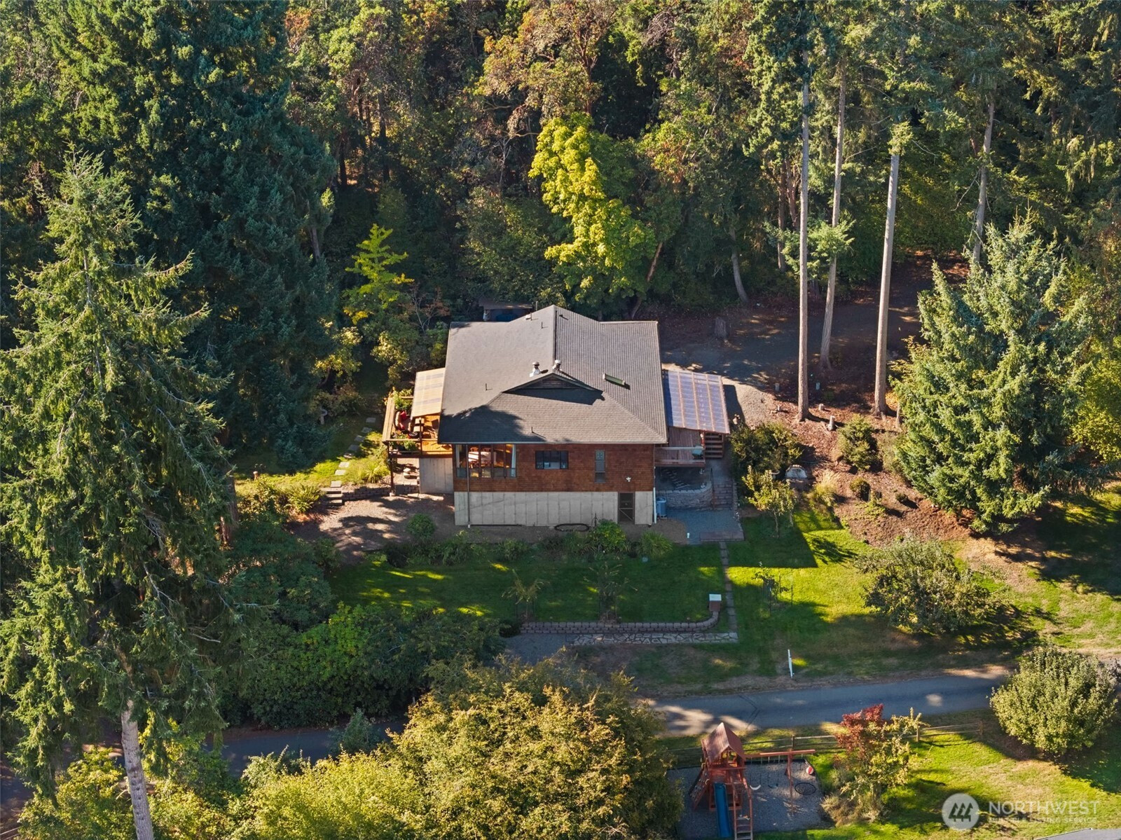 Gorgeous Fox Island home with sweeping views of Mt Rainier, Puget Sound & Chambers Bay Golf Course. This is the first time this Frank Lloyd Wright inspired home has been on the market since building. Entry opens to a gorgeous kitchen/dining area with cedar wood throughout, stainless steel appliances & plenty of storage. Living area opens up to a large deck and perfect area for summer BBQ's with views. Main level features a primary with en-suite, 3 additional bedrooms & full guest bath. Unfinished basement with exterior entrance is plumbed for a bathroom and ready to finish. Large 0.7 acre lot with fruit trees and plenty of parking. Move-in ready with newer 4 bed septic system, electric panel, high-efficiency furnace/heat pump, water heater, and roof. Truly unique home and a must see!