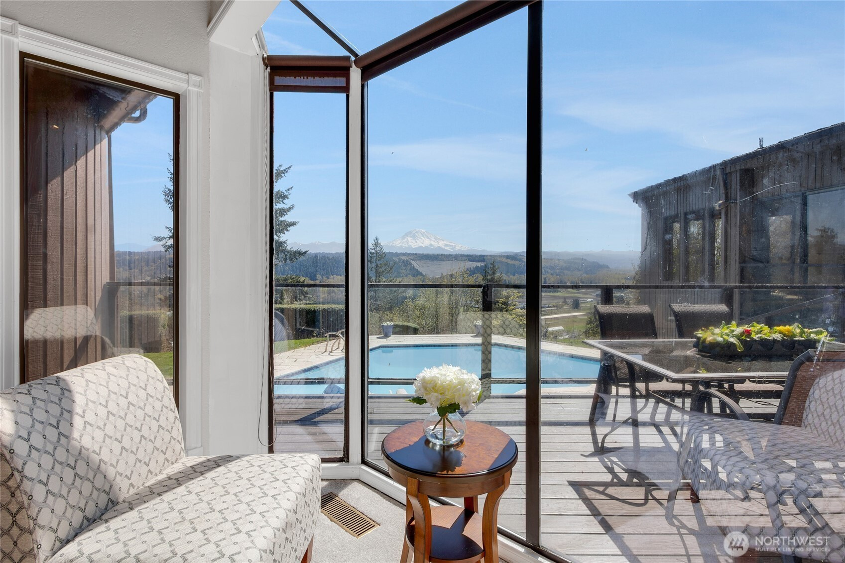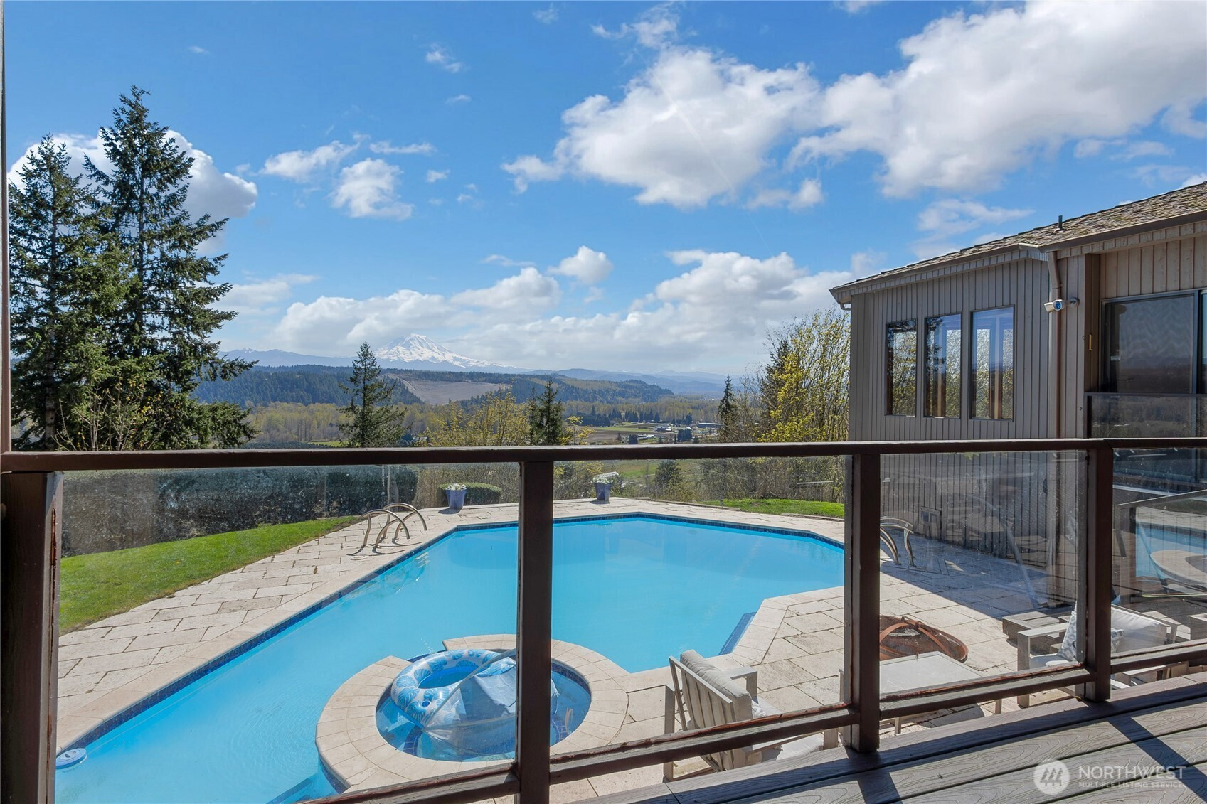 Majestic Mt. Rainier, Cascade Mountain range and Orting Valley views from this architecturally designed custom built home with inground pool/hot tub on over 2 acres. Built with privacy in mind, the house is perched below the street with long, curved driveway on the side of the hill high above the Orting Valley. The architect designed the house to wrap around the secluded back deck, pool/hot tub, garden space showcasing tons of windows, skylights and incredible views from the pool, hot tub, indoor master bedroom jetted tub. Master Suite is very large allowing sitting spaces with expansive views and a solarium like feel to the bathroom and jetted, spa tub. Spectacular views from kitchen, great room and dining space. Enjoy 2 wood burning fireplaces, one with custom rock details. The location of the house is close to every amenity yet has a resort like feel with complete fully fenced privacy. The house is in Unincorporated Pierce County and is not a part of Sunrise Terrace. Sewer is at the street allowing for possible ADU or expansion.