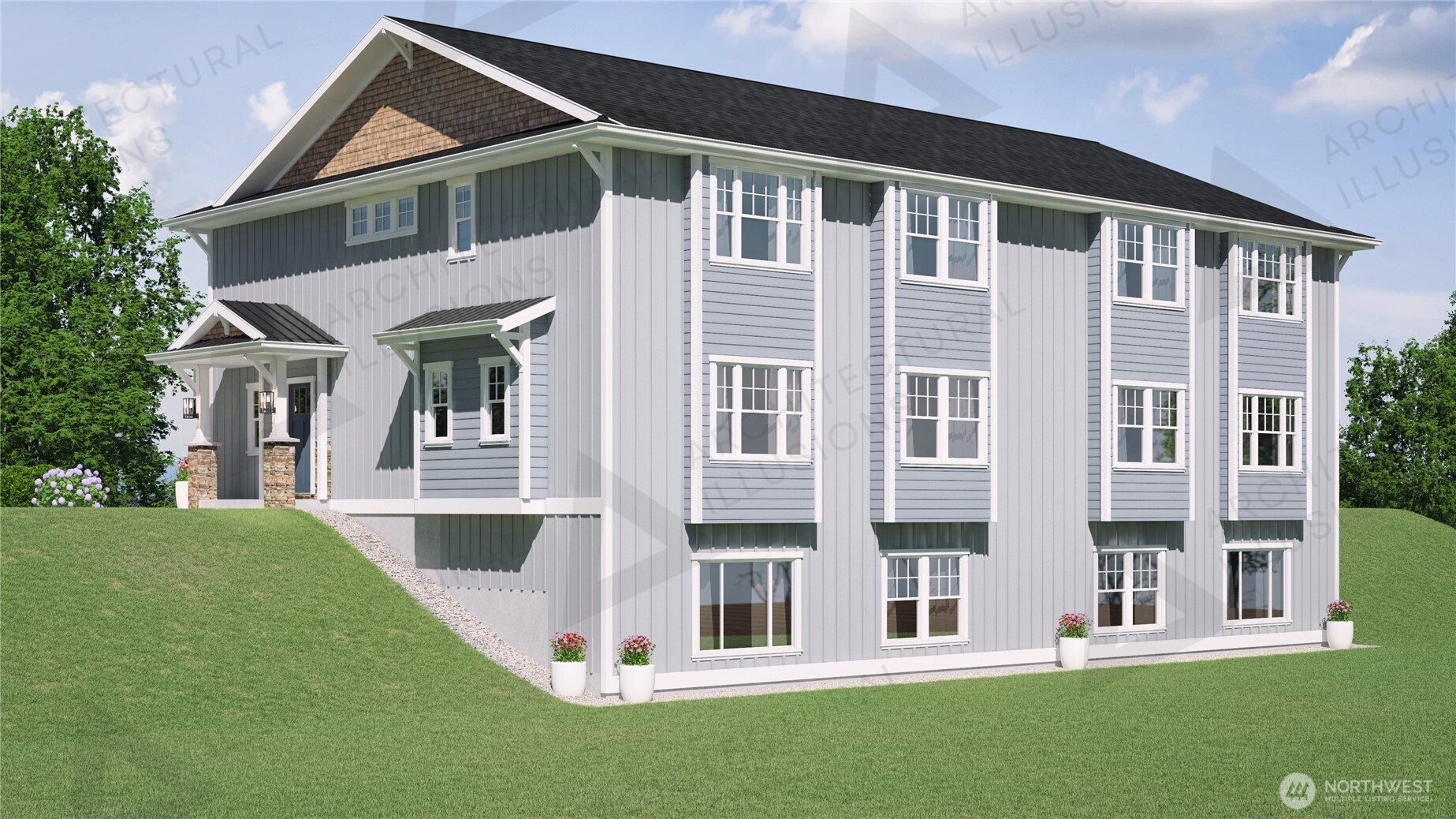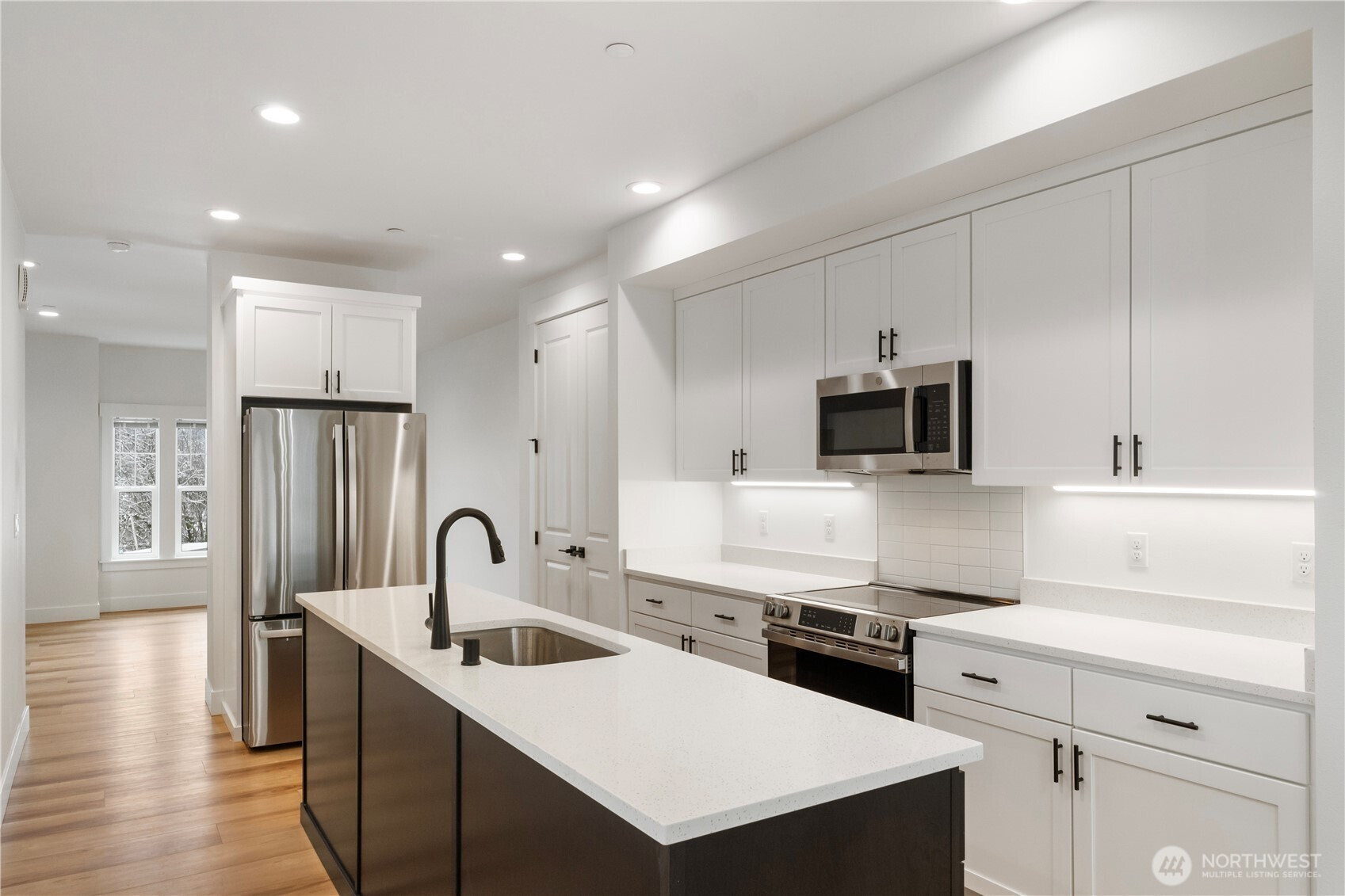 Sweeping panoramic views of Mt. Rainier and sparkling Eatonville city lights greet you from every level of this brand new, never-lived-in 3-story condo in a brand-new 4-plex. This is elevated living at its finest in the gateway to Mt. Rainier National Park. The bright, light-filled main floor is perfect for entertaining, featuring tons of natural light, a huge kitchen with separate pantry, spacious dining room, and generous formal living space — all opening to dramatic mountain and city views. Exceptional upgrades include granite countertops in the kitchen and all bathrooms, custom two-tone cabinetry with a dramatic black island and crisp white upper/lower cabinets, wide white-painted trim finished on-site, and beautiful white panel doors. Luxury vinyl plank flooring covers the main floor, baths, and laundry, while plush carpet warms the rest. See photos of the condo across the street built by the same builder — it showcases many of these same high-quality finishes. The flexible floor plan offers two primary bedrooms upstairs and a third bedroom, full bath, plus bonus room downstairs. Every level captures the stunning views. Construction is 100% complete. Condo recording is near finalized, with FHA, VA, and conventional financing approvals in process. Enjoy a quiet hilltop setting above the city, close to downtown Eatonville and minutes from Mt. Rainier recreation. Don’t miss this rare opportunity for affordable home ownership with luxury finishes and million-dollar views!