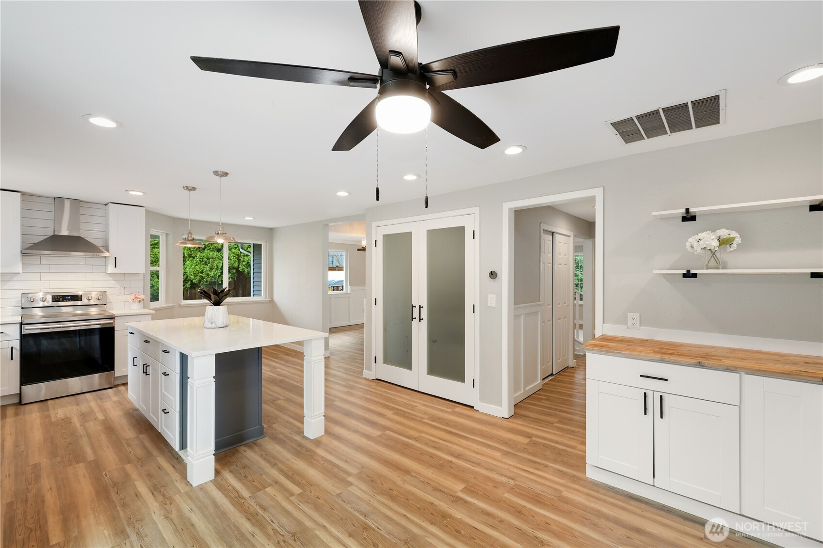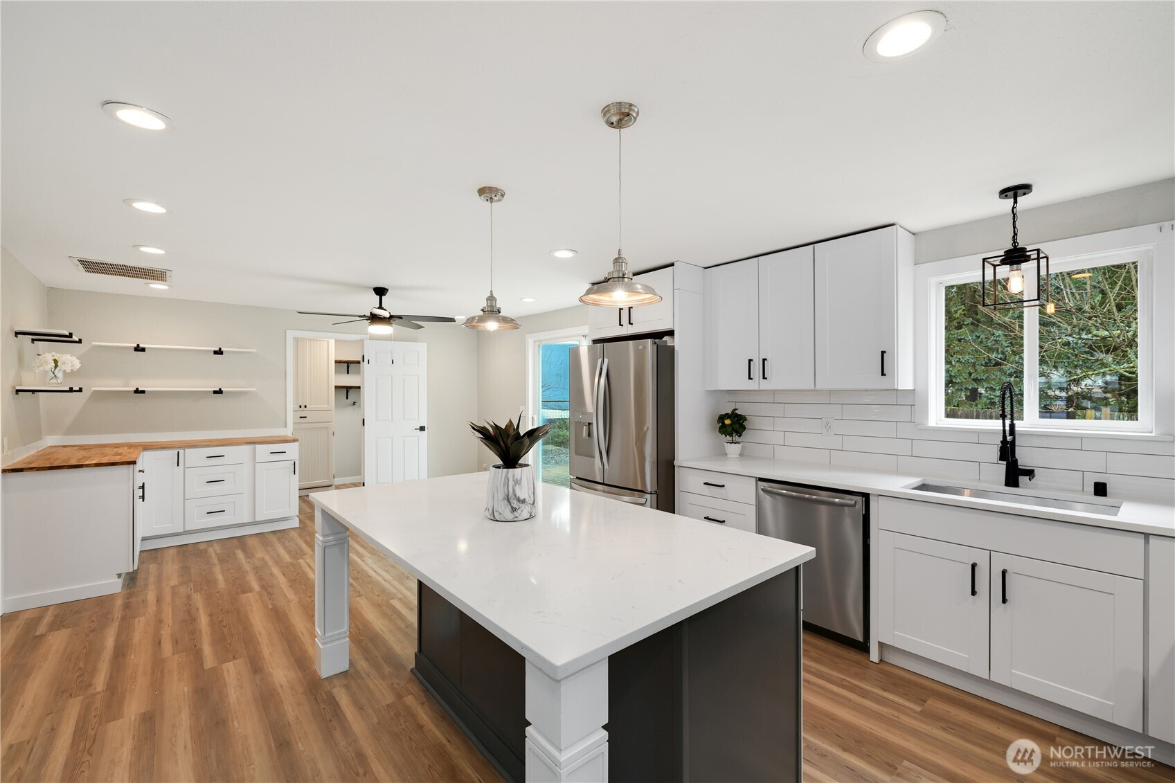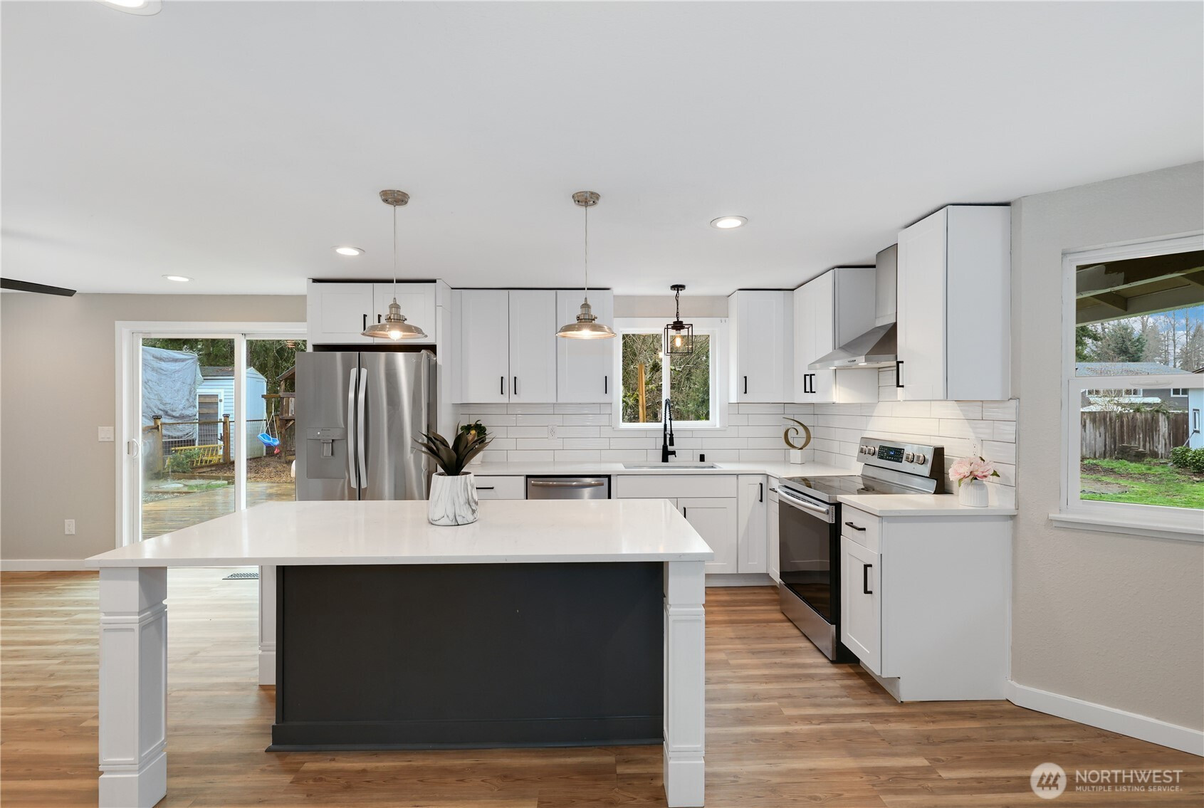 Beautifully remodeled and well designed 3 bedroom 2.5 bath in a wonderful cul-de-sac ideally located within the Puyallup school district. Thoughtfully updated throughout with new high end flooring, fresh new carpet, accent lighting adding warmth and style enhancing the home’s inviting atmosphere. The home features the remodeled kitchen having elegant quartz countertops, large added Island, a unique custom Butcher Block prep area with more cabinets, pantry, all complementing the modern finishes. The bathrooms have been upgraded with, newer vanities, sinks, faucets, flooring, and toilets. Primary shower was recently tiled. Newer roof and water heater, providing peace of mind for years to come. The home’s appeal shines with a reinvented front porch and nicely landscaped front yard that creates a welcoming feel. Out back, a large deck offers the perfect space for entertaining, while the large lot provides ample room for outdoor enjoyment. The play set center for children remains. In addition, highlights include several outbuildings, a long driveway for boats, RV parking or more toys, adding flexibility. This move-in-ready home blends comfort, style, and practical layout. Walking distance to Pope elementary school, convenient to shops, restaurants and freeway. Fidelity 13 Month Home Warranty Included.