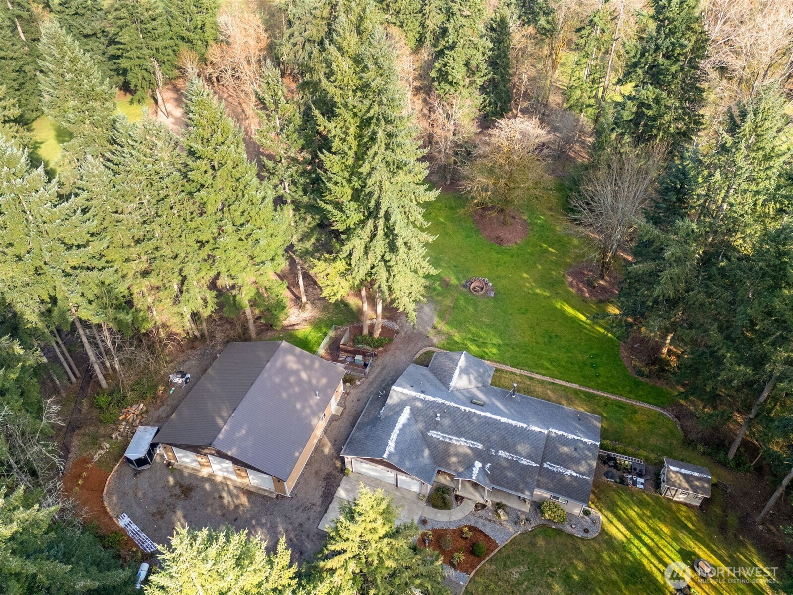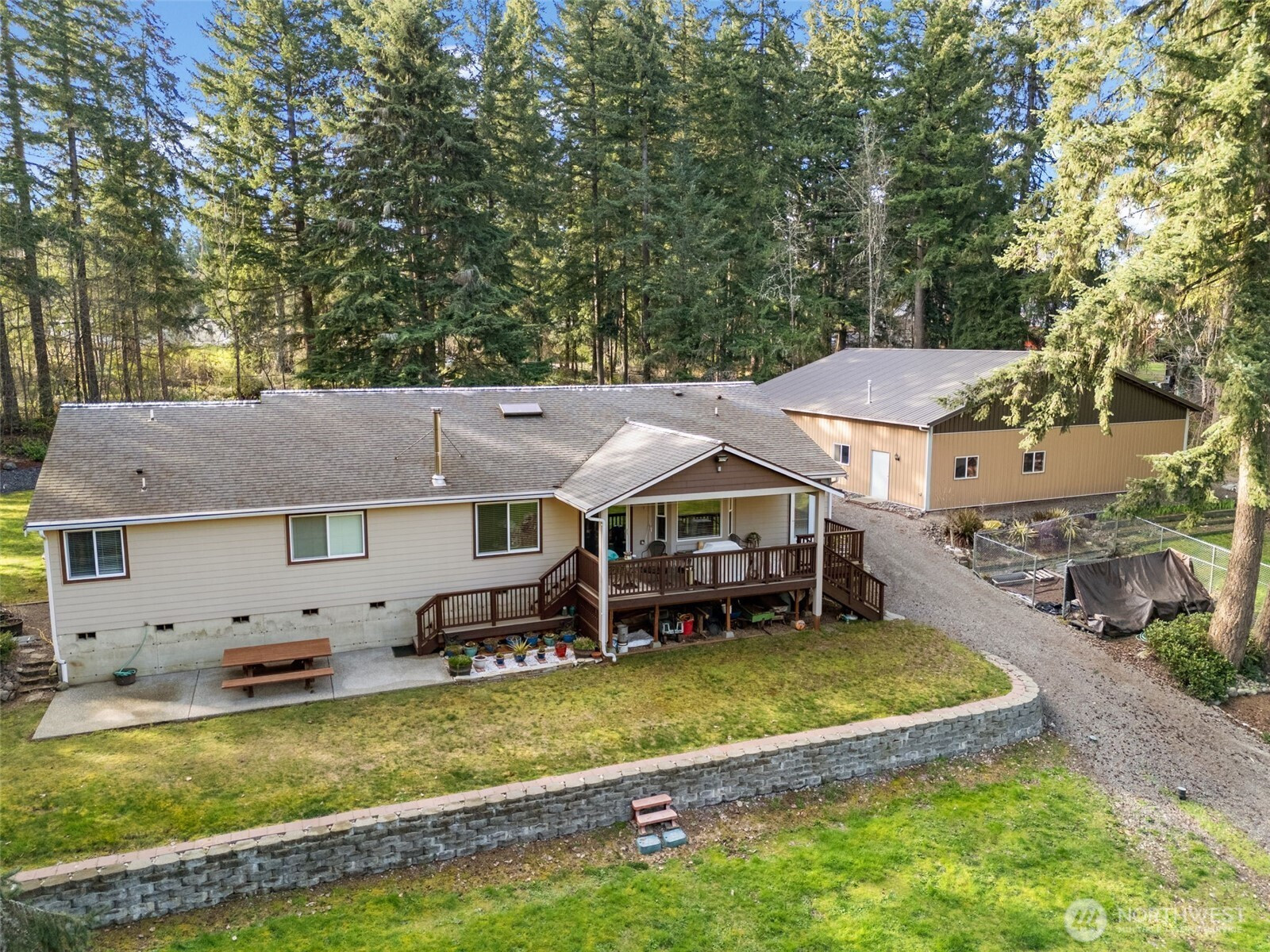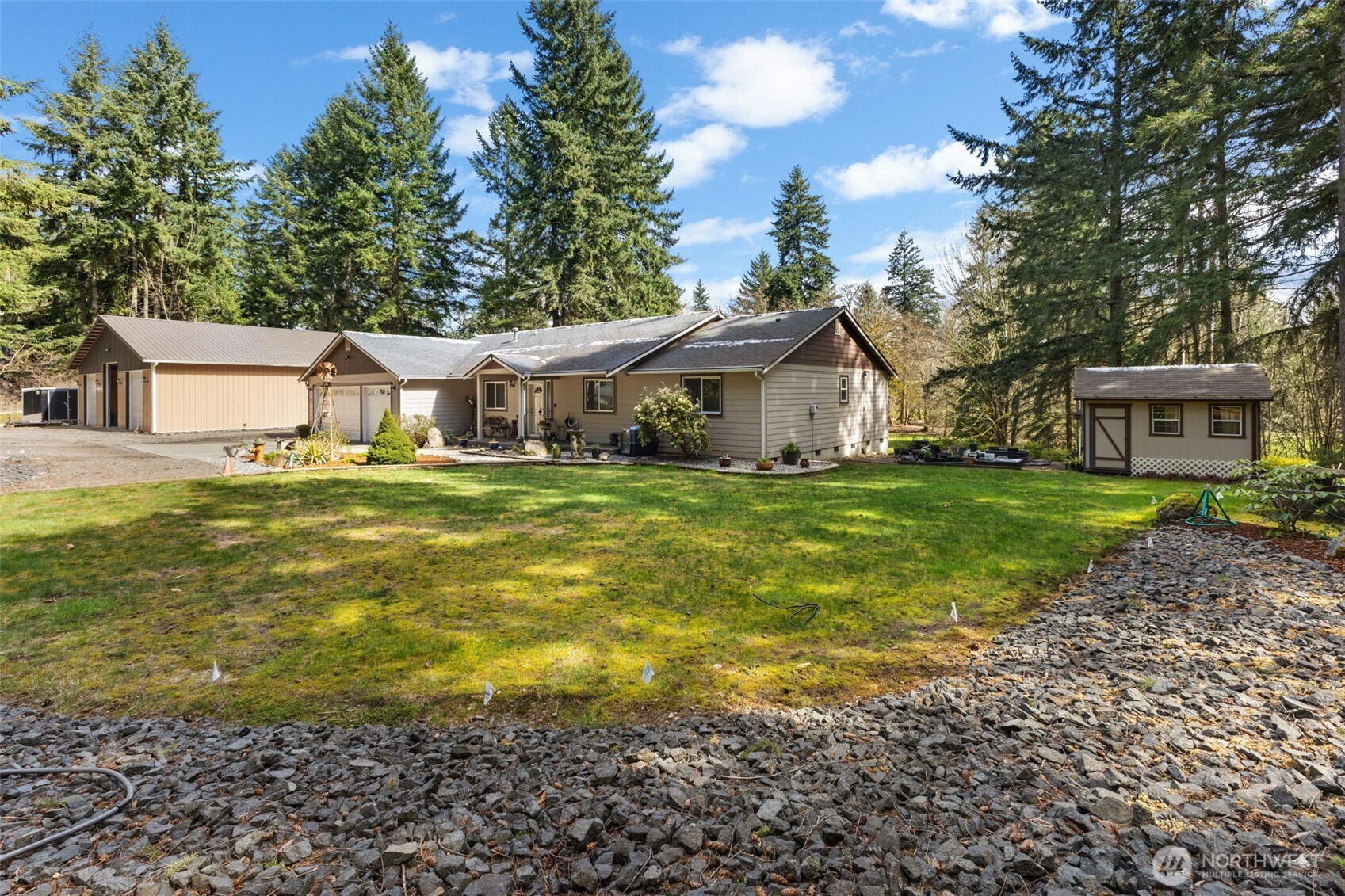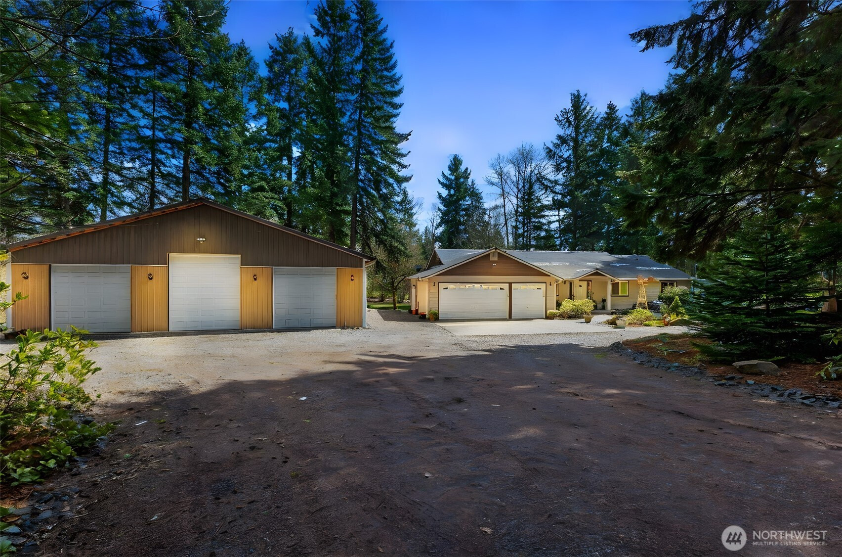 Beautiful Bonney Lake rambler on 5 fully fenced acres welcomes you with a charming covered front porch and warm hardwood entry. Spacious great room showcases vaulted ceilings, abundant natural light, and a cozy wood-burning stove—perfect for everyday living and entertaining. Open-concept kitchen features updated kitchen with granite countertops, stainless steel appliances, center island, recessed lighting, and a generous pantry, flowing seamlessly into the bright dining area. Versatile layout offers a den/office just off the entry—ideal for working from home—plus a large bonus room off the dining area that can serve as a media room, playroom, or additional living space. The spacious primary suite is a true retreat with a 5-piece bath, including soaking tub, double vanity, and walk-in closet. Additional bedrooms are well-sized and thoughtfully positioned for comfort and privacy. Enjoy year-round outdoor living with covered decks overlooking the expansive property—perfect for relaxing or entertaining in any season. Property also features a large Shop/Garage that is fully finished even W/forced air furnace 220 and can hold 7 cars plus shop area for hobbies, storage, or workspace, along with a 3-car attached garage and plenty of room for RV and boat parking. Conveniently located near parks, walking trails, shopping, and amenities with easy commuting access. Generous lot offers potential for an equestrian setup or future possibilities—room to grow and make it your own. A must see!