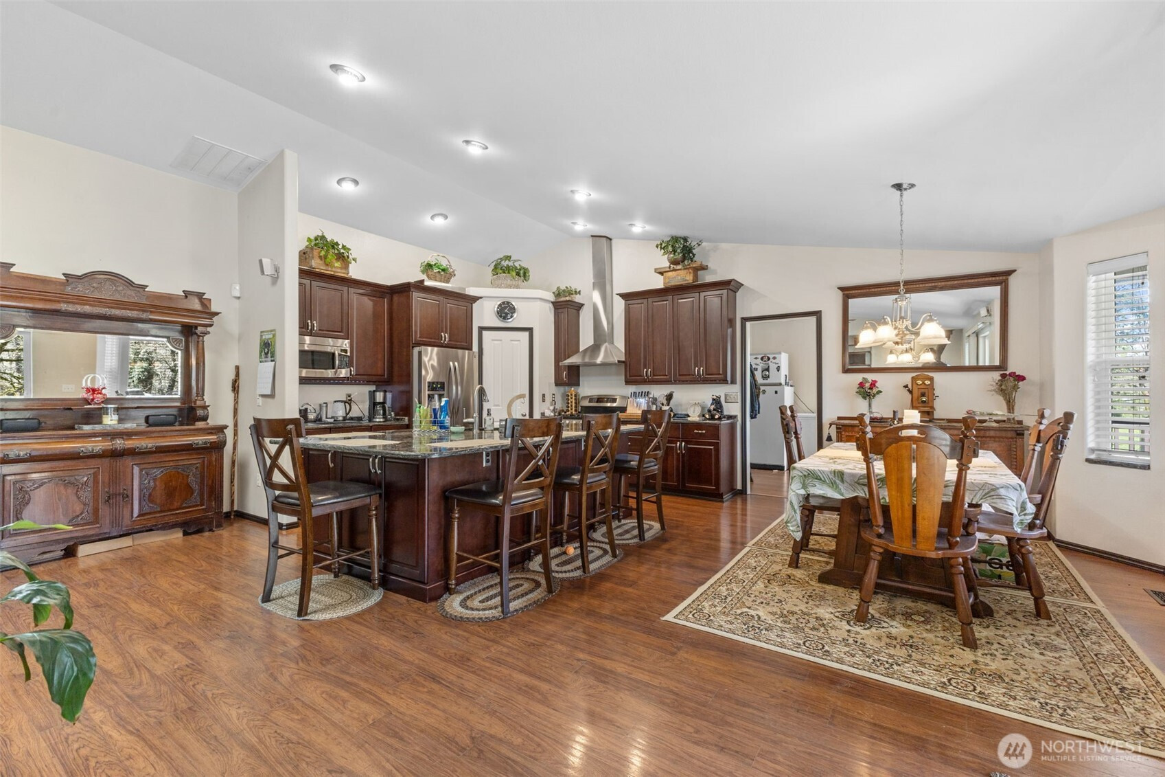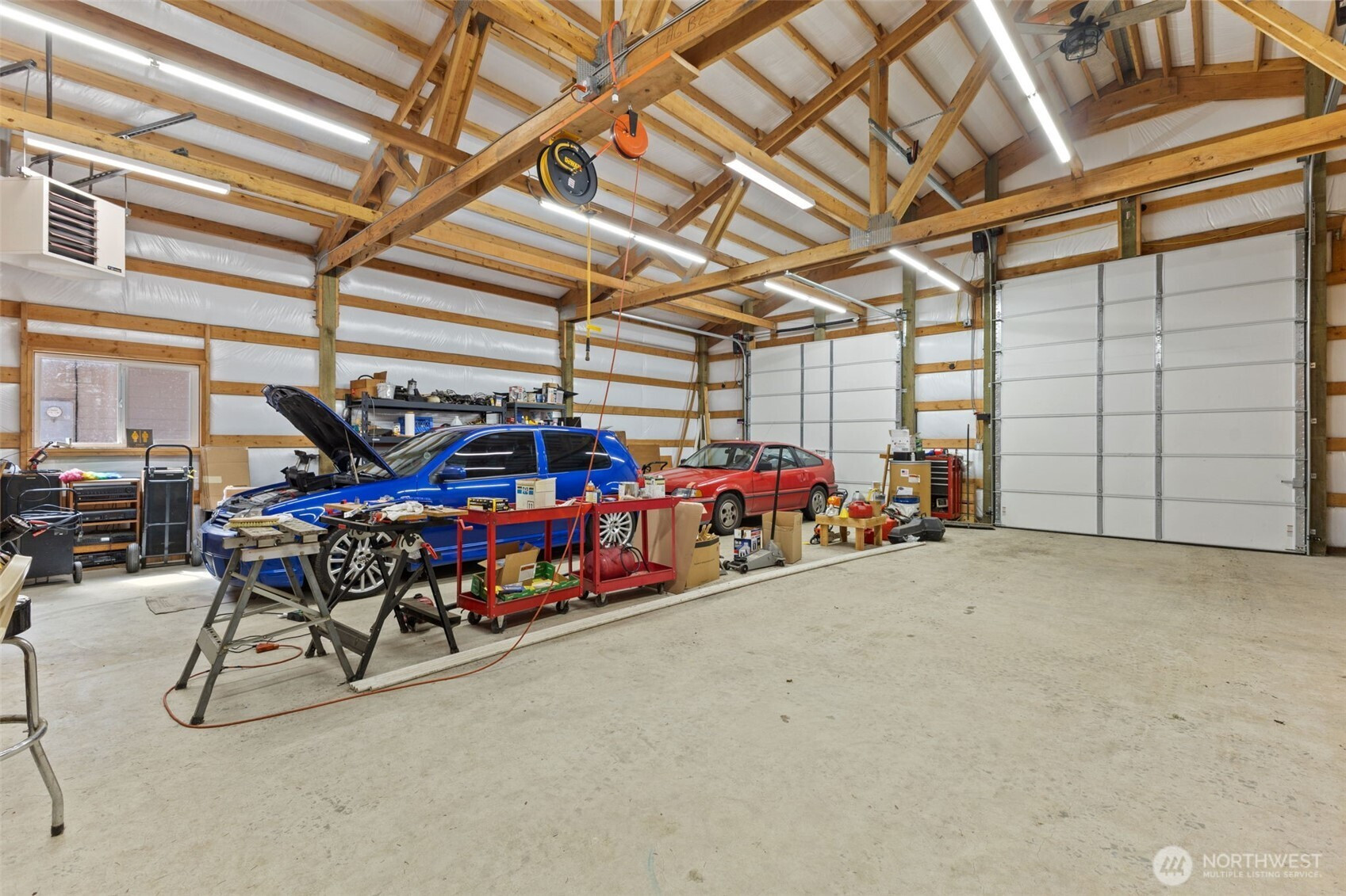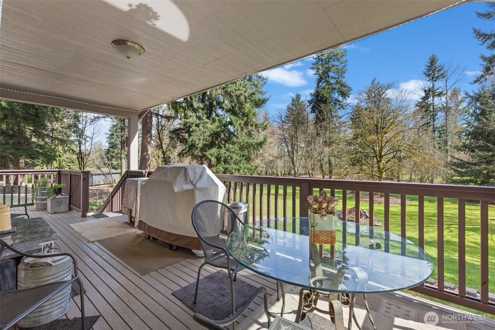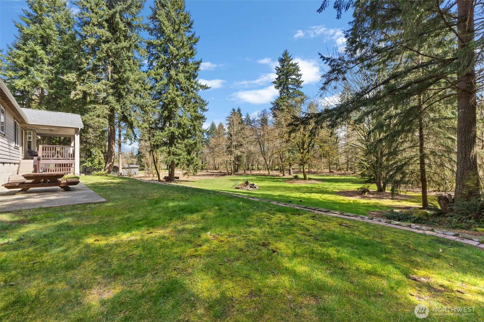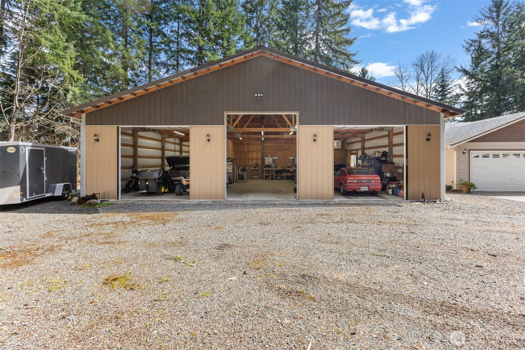 Beautiful Bonney Lake rambler on 5 fully fenced acres welcomes you with a charming covered front porch and warm hardwood entry. Spacious great room showcases vaulted ceilings, abundant natural light, and a cozy wood-burning stove—perfect for everyday living and entertaining. Open-concept kitchen features updated kitchen with granite countertops, stainless steel appliances, center island, recessed lighting, and a generous pantry, flowing seamlessly into the bright dining area. Versatile layout offers a den/office just off the entry—ideal for working from home—plus a large bonus room off the dining area that can serve as a media room, playroom, or additional living space. The spacious primary suite is a true retreat with a 5-piece bath, including soaking tub, double vanity, and walk-in closet. Additional bedrooms are well-sized and thoughtfully positioned for comfort and privacy. Enjoy year-round outdoor living with covered decks overlooking the expansive property—perfect for relaxing or entertaining in any season. Property also features a large Shop/Garage that is fully finished even W/forced air furnace 220 and can hold 7 cars plus shop area for hobbies, storage, or workspace, along with a 3-car attached garage and plenty of room for RV and boat parking. Conveniently located near parks, walking trails, shopping, and amenities with easy commuting access. Generous lot offers potential for an equestrian setup or future possibilities—room to grow and make it your own. A must see!