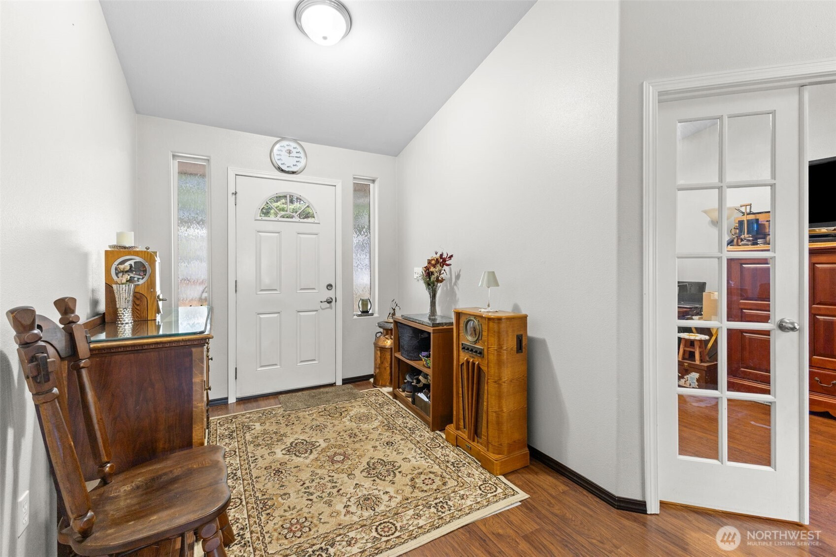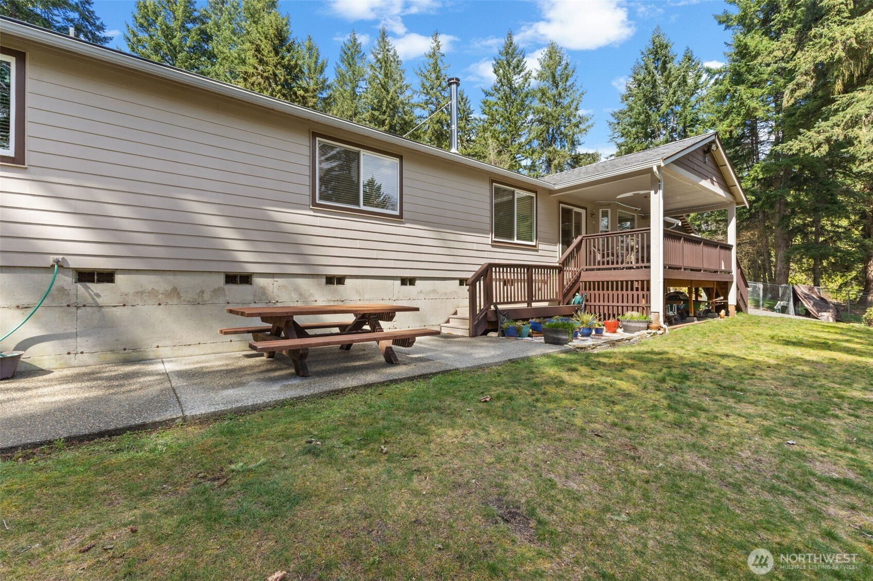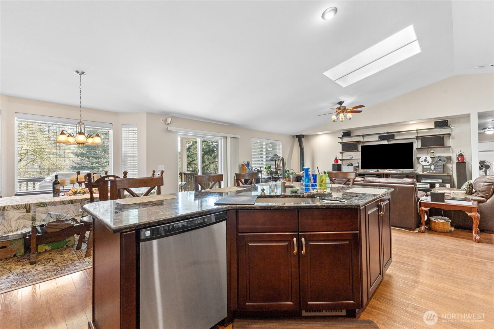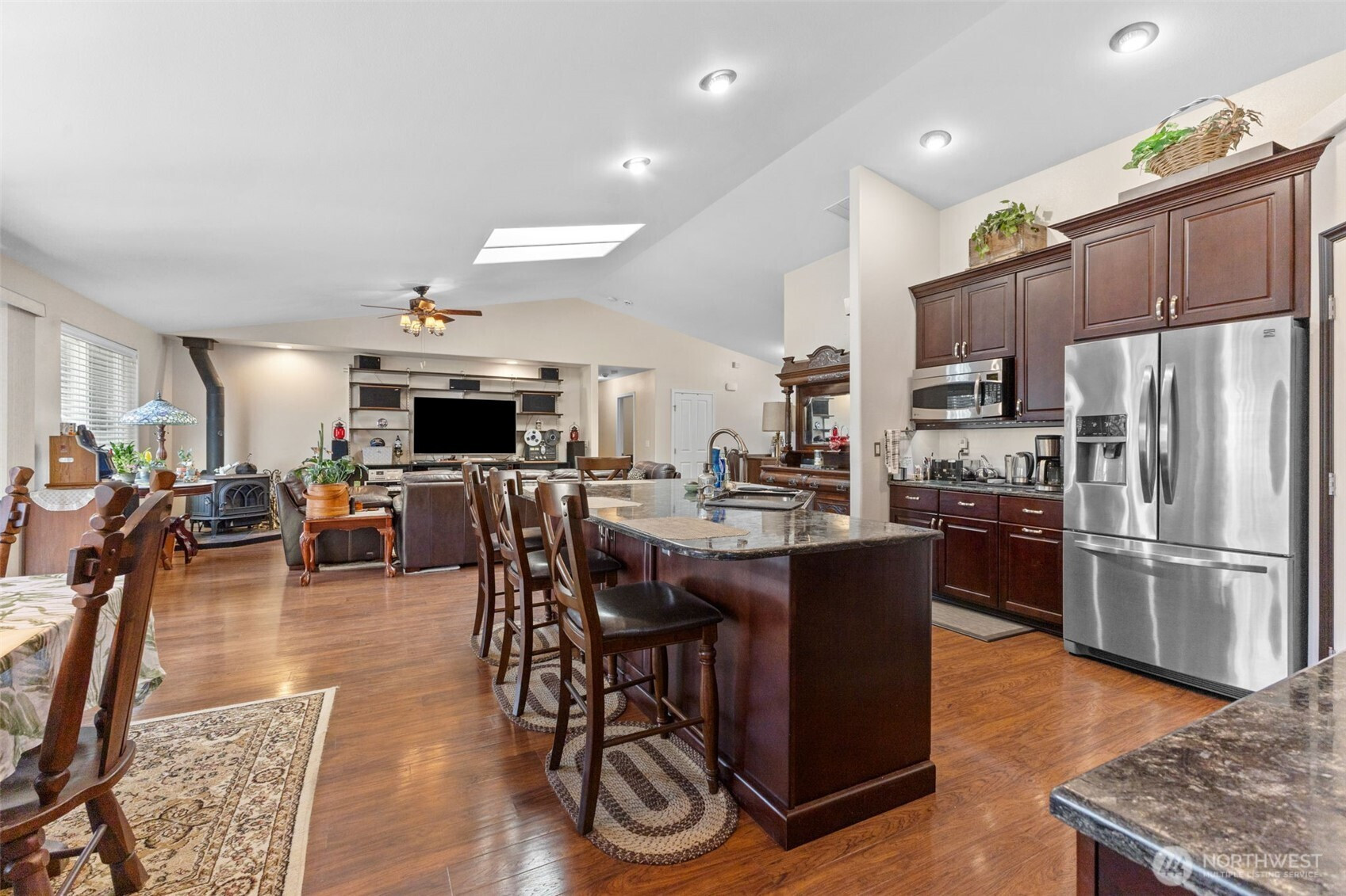 Beautiful Bonney Lake rambler on 5 fully fenced acres welcomes you with a charming covered front porch and warm hardwood entry. Spacious great room showcases vaulted ceilings, abundant natural light, and a cozy wood-burning stove—perfect for everyday living and entertaining. Open-concept kitchen features updated kitchen with granite countertops, stainless steel appliances, center island, recessed lighting, and a generous pantry, flowing seamlessly into the bright dining area. Versatile layout offers a den/office just off the entry—ideal for working from home—plus a large bonus room off the dining area that can serve as a media room, playroom, or additional living space. The spacious primary suite is a true retreat with a 5-piece bath, including soaking tub, double vanity, and walk-in closet. Additional bedrooms are well-sized and thoughtfully positioned for comfort and privacy. Enjoy year-round outdoor living with covered decks overlooking the expansive property—perfect for relaxing or entertaining in any season. Property also features a large Shop/Garage that is fully finished even W/forced air furnace 220 and can hold 7 cars plus shop area for hobbies, storage, or workspace, along with a 3-car attached garage and plenty of room for RV and boat parking. Conveniently located near parks, walking trails, shopping, and amenities with easy commuting access. Generous lot offers potential for an equestrian setup or future possibilities—room to grow and make it your own. A must see!