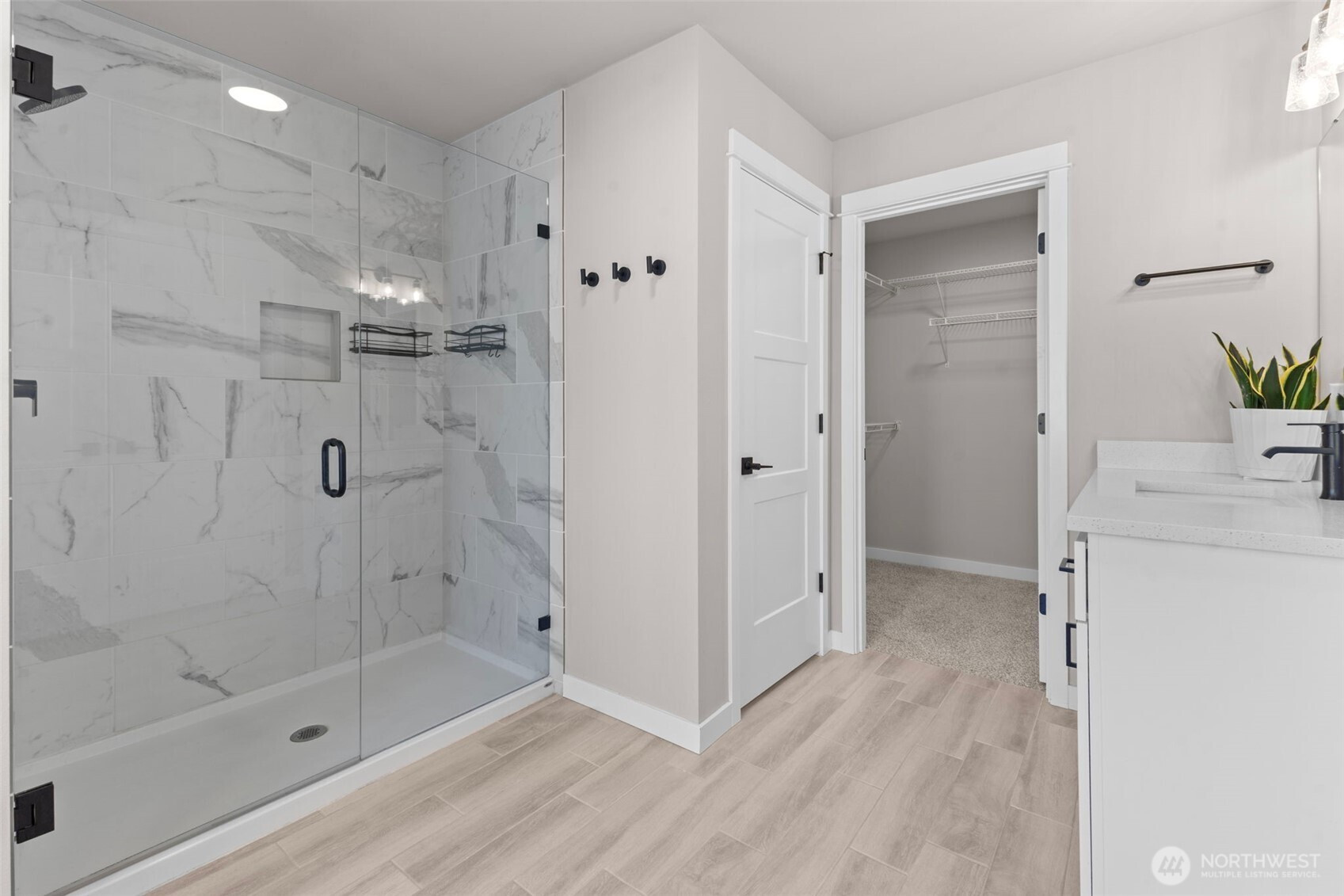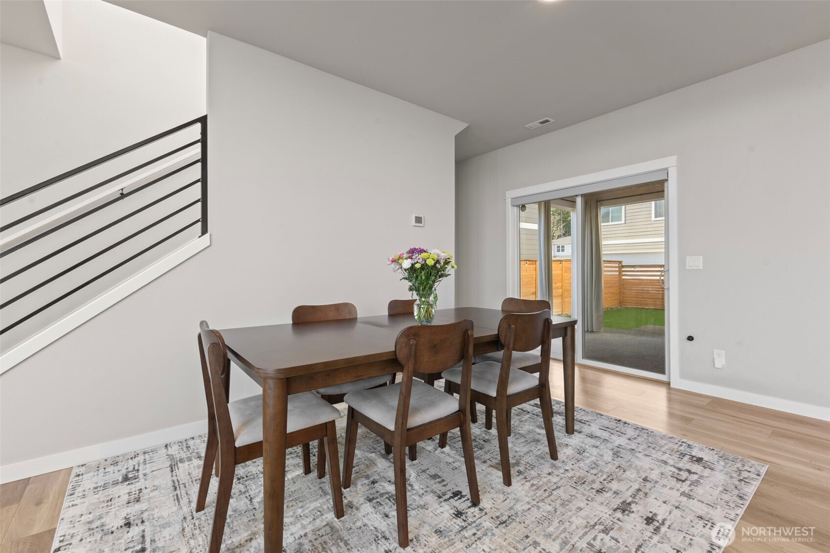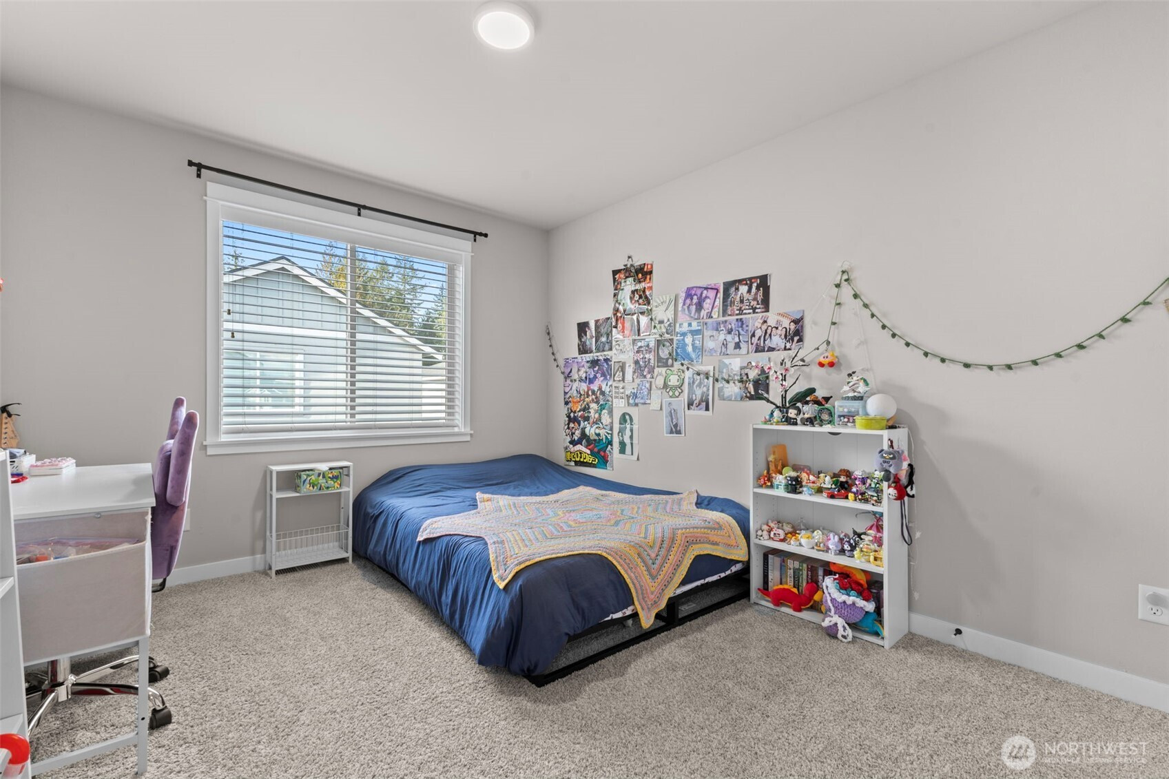 Welcome to this stunning 3-bedroom, 2.5-bath home in Bonney Lake, built in 2022, offering 2,148 sq ft of thoughtfully designed living space with AC for year-round comfort. The open-concept layout boasts vaulted ceilings, bright windows, and a kitchen featuring quartz countertops, stainless steel appliances, a large walk-in pantry, and a breakfast bar—perfect for everyday living and entertaining. Upstairs, the primary suite includes a 5-piece en suite bath with separated double vanity, soaking tub, walk-in shower with tile finishes, and a large closet. The additional bedrooms are generously sized, with a cozy reading nook and convenient upstairs utility room. Step outside to a low-maintenance turf yard with a covered patio, gas hookup for your BBQ, and TV mount for effortless outdoor entertainment. The epoxy-finished garage offers additional storage space. Set up a showing today!