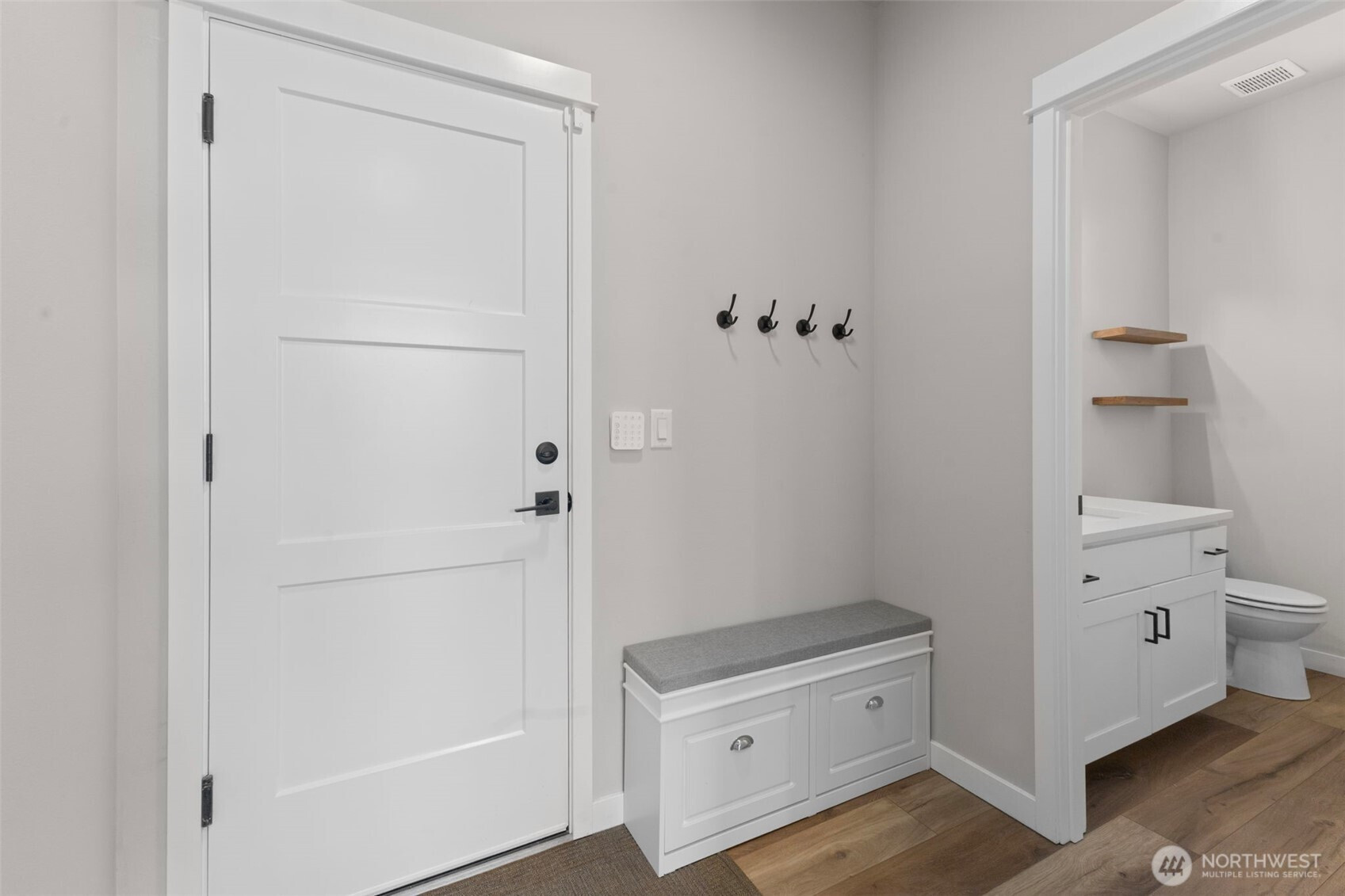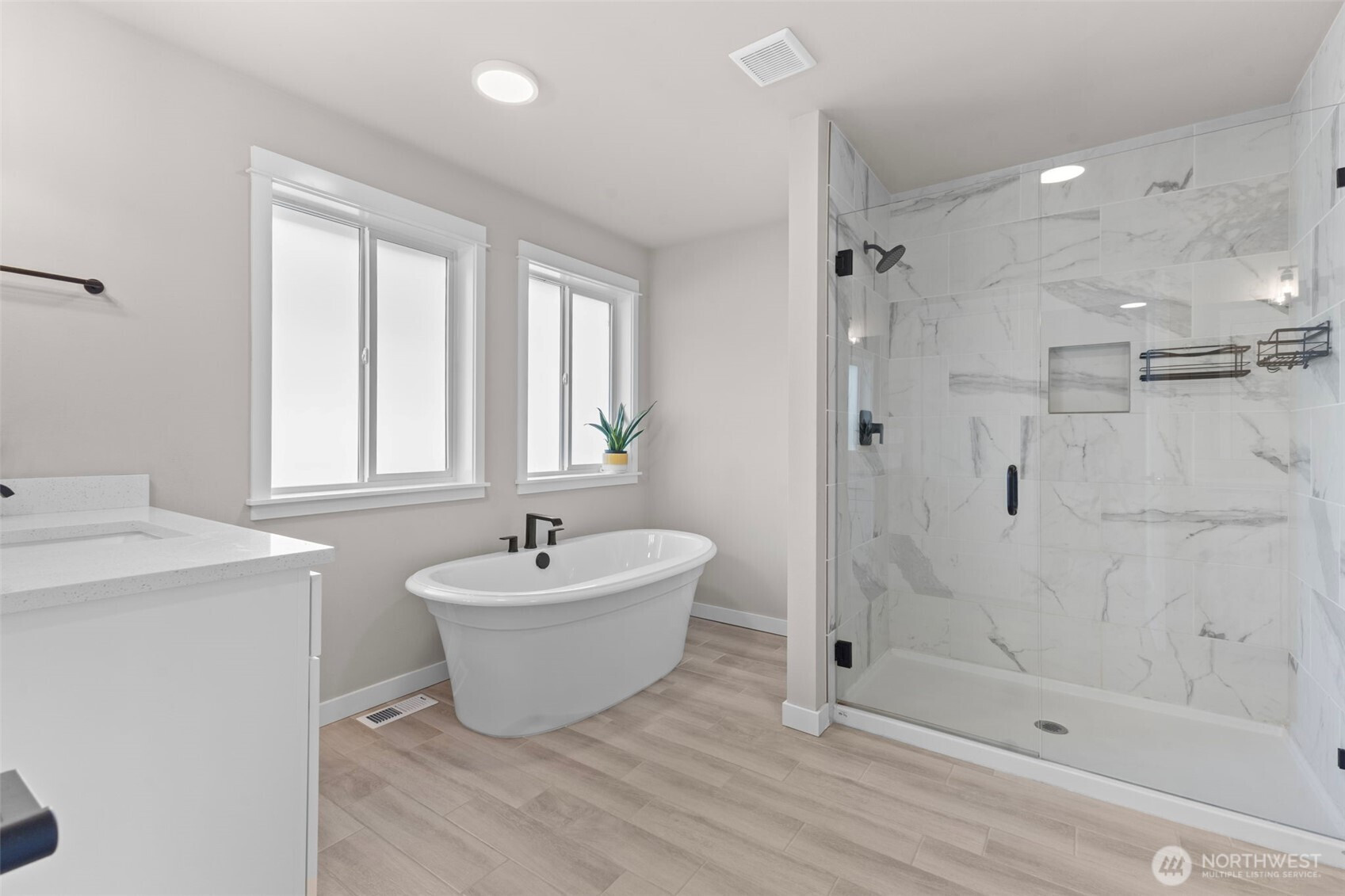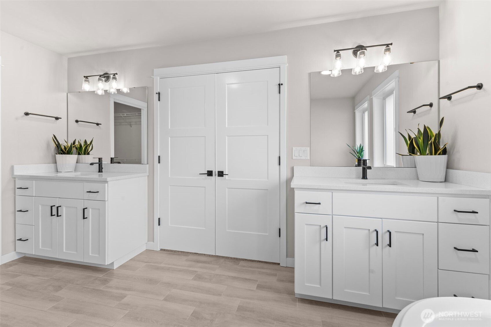 Welcome to this stunning 3-bedroom, 2.5-bath home in Bonney Lake, built in 2022, offering 2,148 sq ft of thoughtfully designed living space with AC for year-round comfort. The open-concept layout boasts vaulted ceilings, bright windows, and a kitchen featuring quartz countertops, stainless steel appliances, a large walk-in pantry, and a breakfast bar—perfect for everyday living and entertaining. Upstairs, the primary suite includes a 5-piece en suite bath with separated double vanity, soaking tub, walk-in shower with tile finishes, and a large closet. The additional bedrooms are generously sized, with a cozy reading nook and convenient upstairs utility room. Step outside to a low-maintenance turf yard with a covered patio, gas hookup for your BBQ, and TV mount for effortless outdoor entertainment. The epoxy-finished garage offers additional storage space. Set up a showing today!
