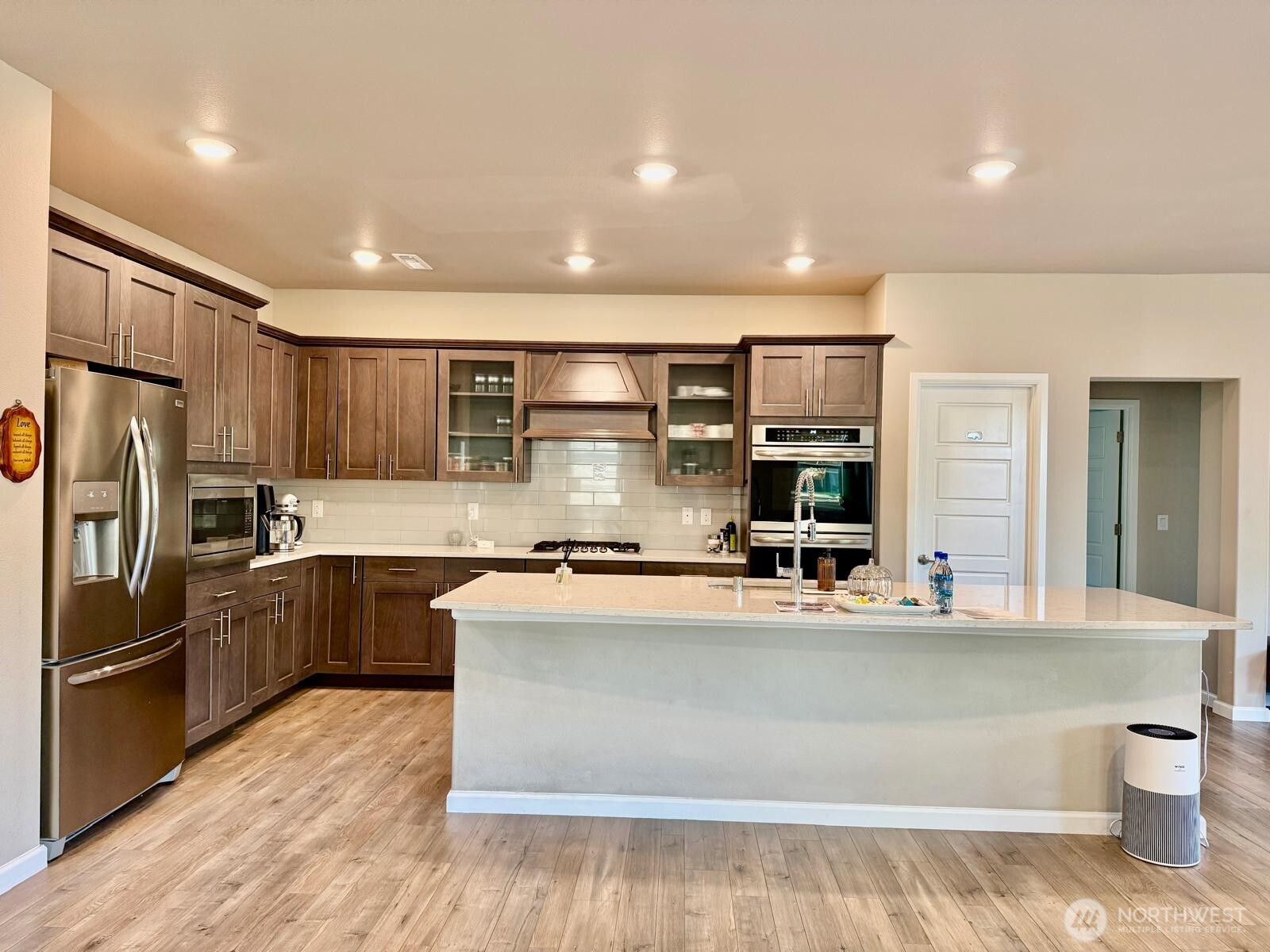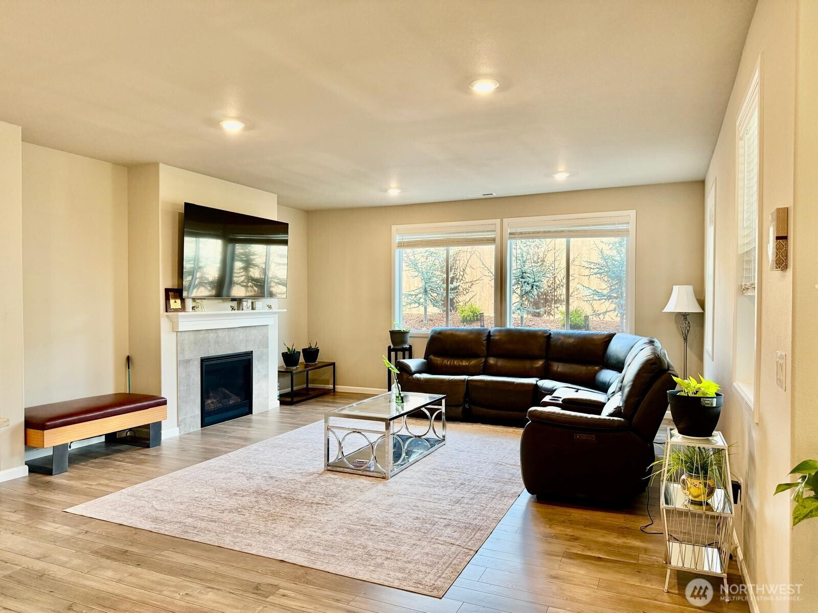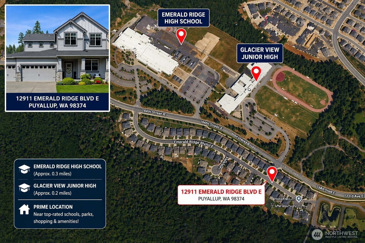 Discover this stunning, like-new Lennar resale that perfectly blends modern style, comfort, & functionality. Featuring 9-foot ceilings & a welcoming entry with an elegant spindle railing, this home offers a bright, open-concept layout ideal for today’s lifestyle. The main level includes a versatile office/den with French doors and durable LVP flooring, along with a guest bedroom and full bathroom—perfect for visitors or multi-generational living. The chef-inspired kitchen is designed for both everyday living and entertaining, featuring a gas range, double oven, quartz countertops, full-height subway tile backsplash, soft-close cabinetry, and a spacious walk-in pantry. Conveniently located within walking distance to Glacier View Junior High School and Emerald Ridge High School. Upstairs, enjoy a spacious loft, a convenient laundry room, and three additional bedrooms. The luxurious primary suite includes a comfortable sitting area and a spa-like ensuite with a 5-piece bath, tile shower, soaking tub, makeup vanity, oversized walk-in closet. Recent upgrades include a new A/C system and brand-new washer and dryer (2025), a tankless water heater, installed security cameras, and a dedicated Tesla Wall Connector—perfect for convenient at-home EV charging. Blinds and select gym equipment are also included. Step outside to a large covered patio, perfect for relaxing or entertaining, along with a side backyard. The home also features a 3-car garage with additional storage space.