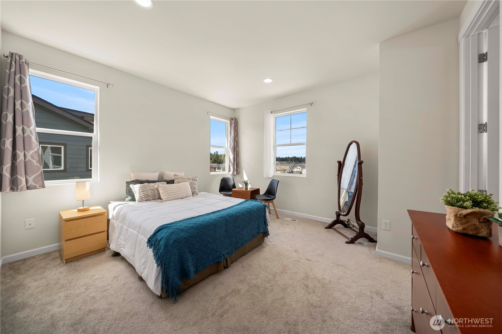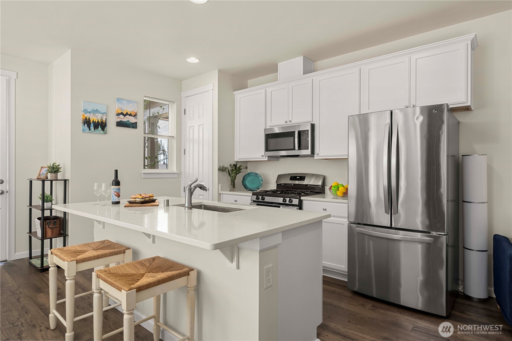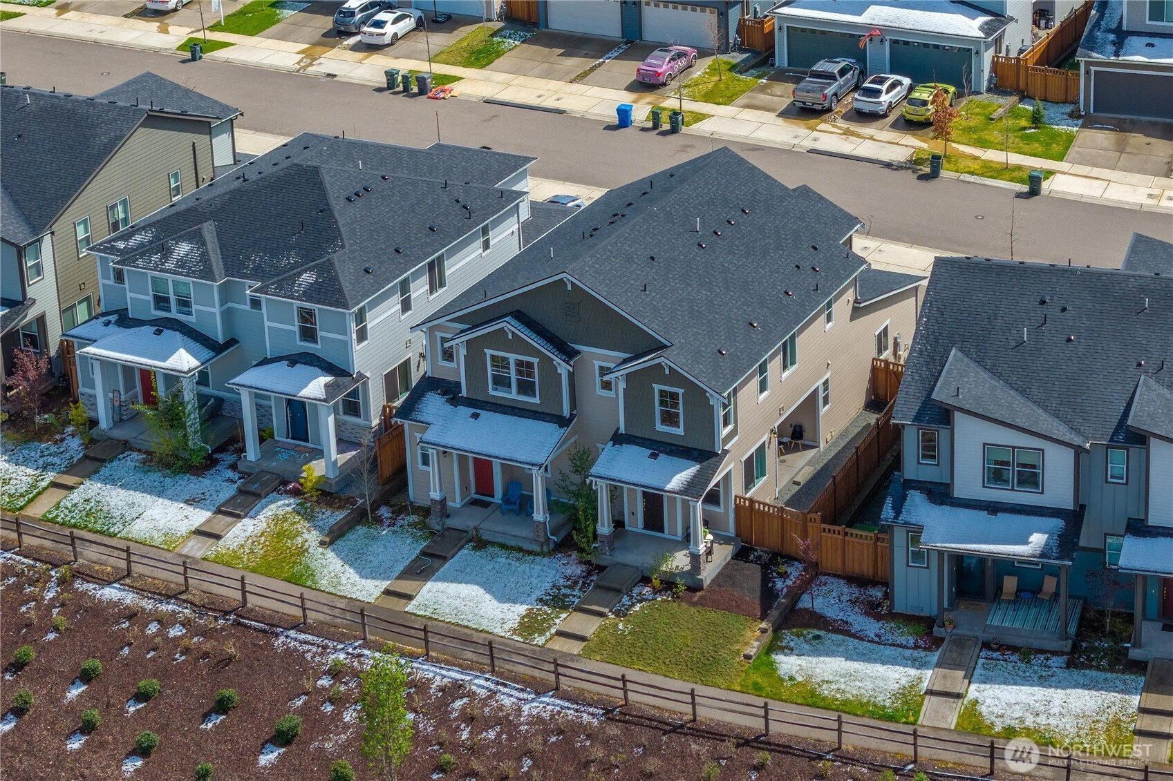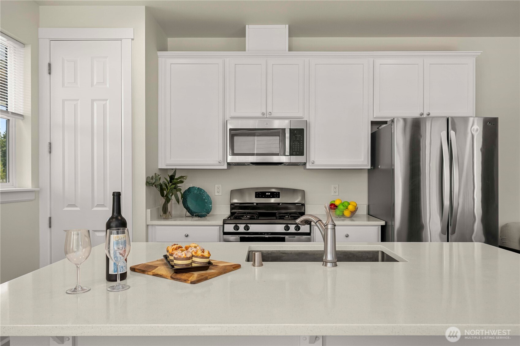 Stunning Richmond American Homes resale! The main floor of the beautiful Chicago plan offers soaring high ceilings, crisp white millwork, and oversized interior doors, creating an airy and upscale ambiance. Entertain with ease in the open-concept living and dining areas, or whip up gourmet meals in a well-appointed kitchen boasting quartz countertops, a large island, and a spacious pantry. The signature center-meet doors transition seamlessly to a private covered patio perfect for morning coffee or year-round BBQs, while the covered front porch offers a serene territorial view. Upstairs, retreat to a luxurious primary suite with a walk-in closet, alongside two additional bright bedrooms, a full bathroom, and a convenient laundry area. Complete with a 2-car garage. Situated in the top-rated Sumner-Bonney Lake School District, this home puts you minutes away from ALL that Tehaleh has to offer, from 40+ miles of trails and parks to local dining, playgrounds, shopping, and so much more!