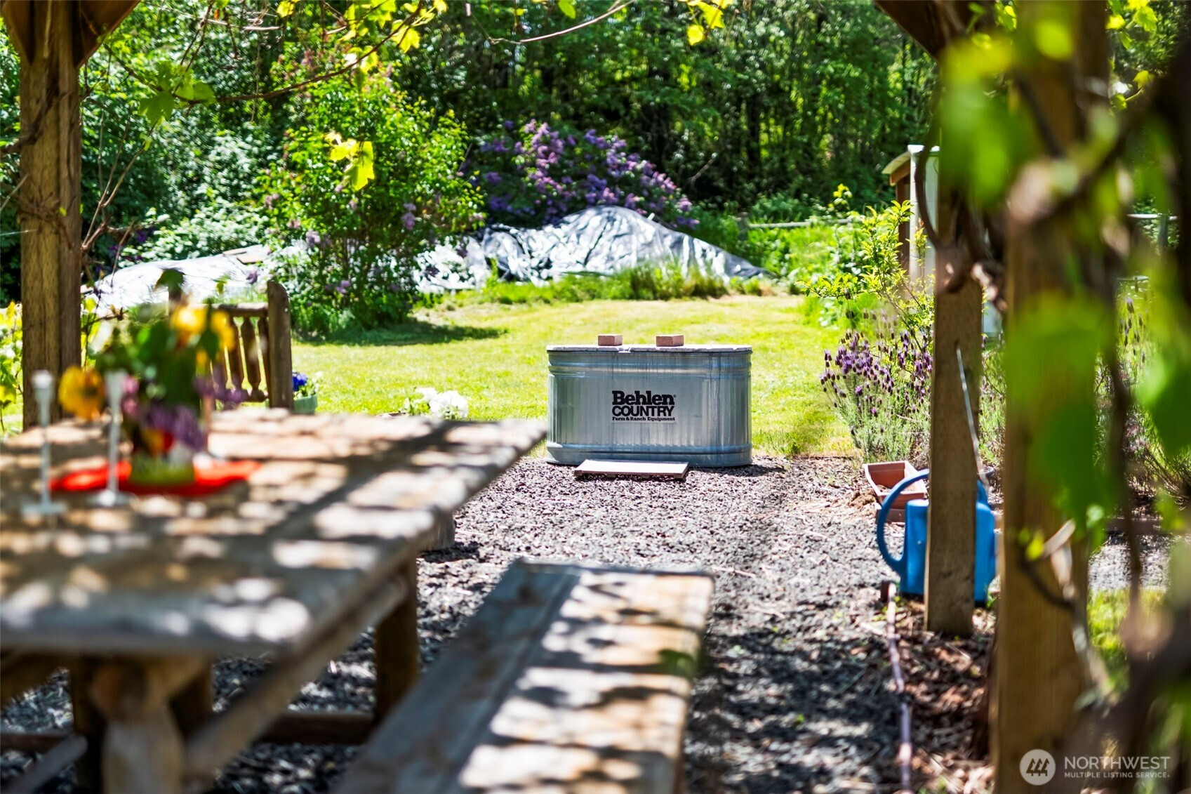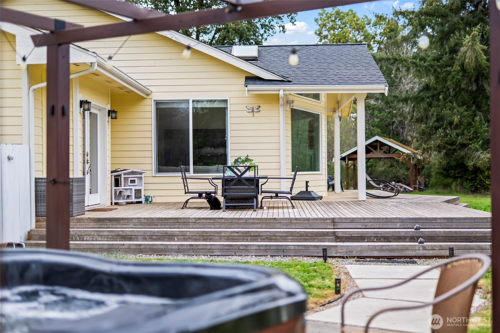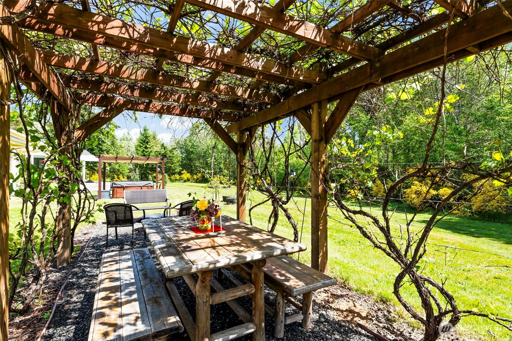 Experience the serenity of this move-in-ready 5-acre retreat! This charming one-level home welcomes you with an open floor plan, large kitchen perfect for gathering, 3 bedrooms, 2 baths, and a primary suite with dual walk-in closets. Step outside to an expansive fenced yard complete with a nature trail, fruit trees, a generous garden, and a natural watershed that brings beauty without upkeep. Unwind in the hot tub on your new deck, and rest easy knowing a whole-house generator has you covered. Plenty of room for everything with two outbuildings and a 3-car garage. A must-see property that checks every box!