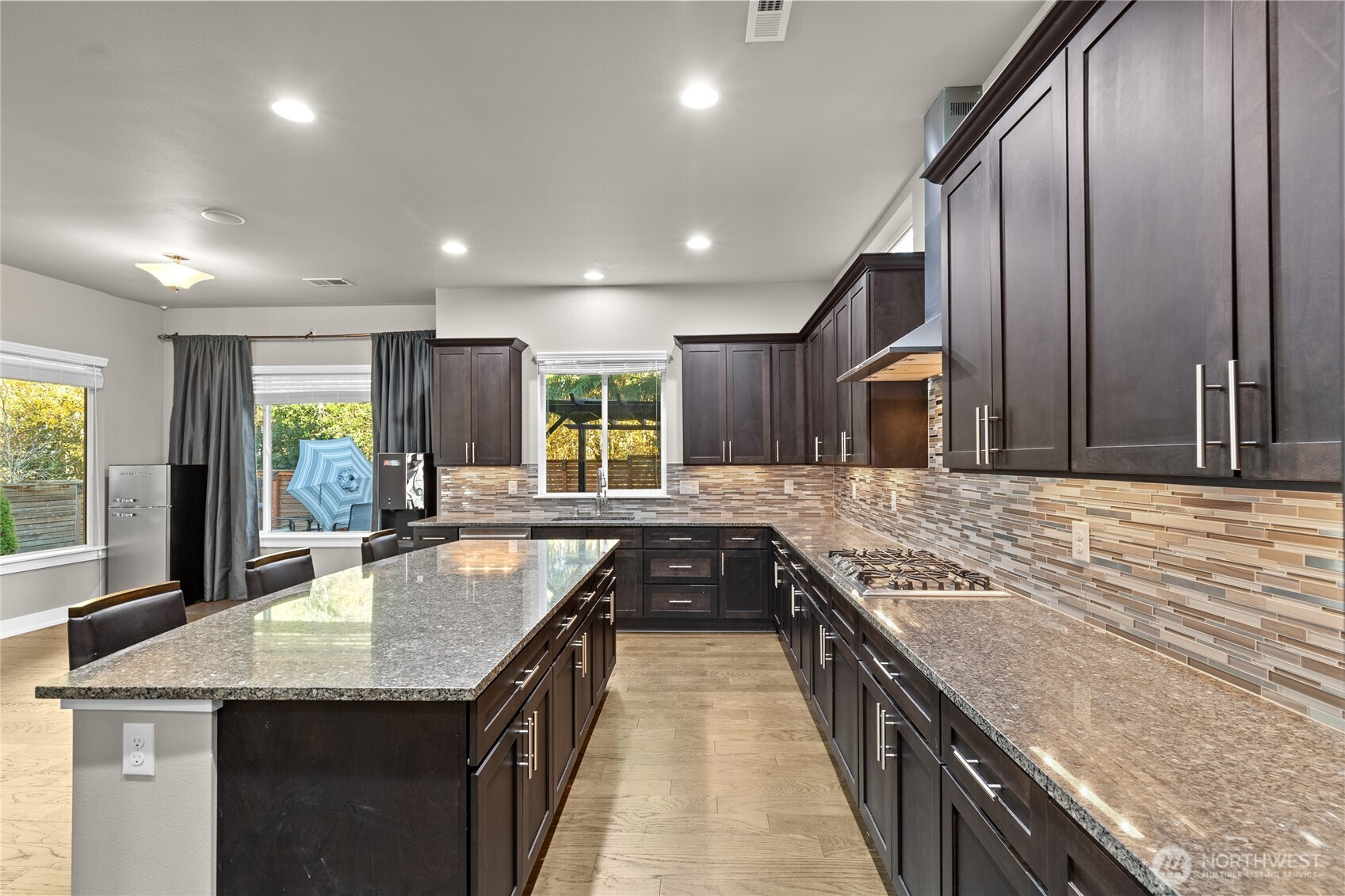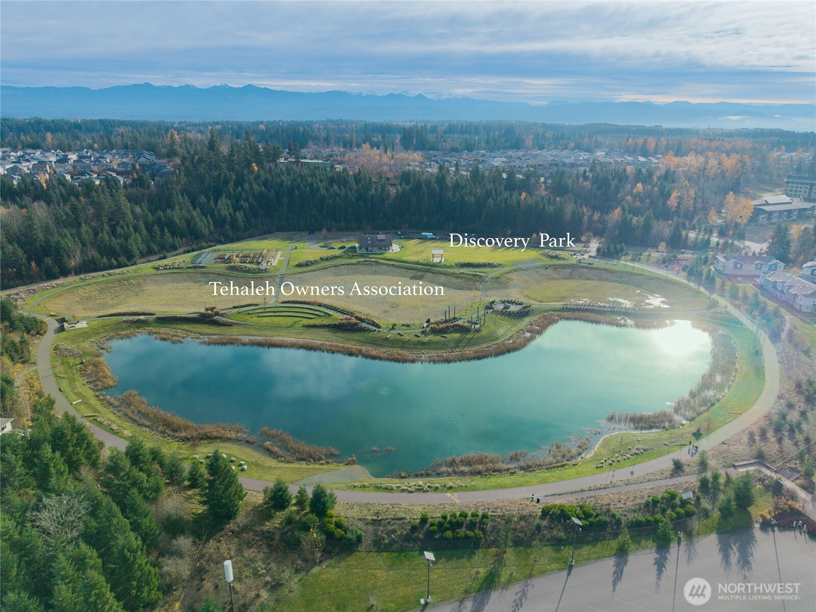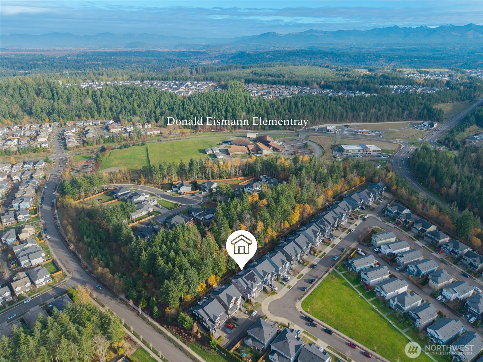 Enjoy year-round Mt. Rainier views from this Tehaleh home with a 3-car garage, A/C, and solar panels. Ideally across from a park and backing to a greenbelt, the community offers 40+ miles of trails, 10+ parks, expanding dining, retail, schools, and a mountain-bike park. Inside, hardwood floors lead to a chef’s kitchen with stainless steel appliances, oversized island, and built-in speakers. A main-level den/bedroom with a balcony adds flexible space. Upstairs, the primary suite has a spa-like 5-piece bath and dual walk-in closets, plus an oversized family room. The great room opens to covered outdoor living with fireplace, expanded patio, hot tub, and fenced yard with trail access. A rooftop deck with gas firepit captures Mt. Rainier views.
