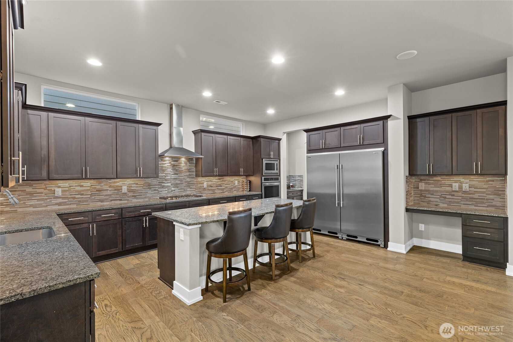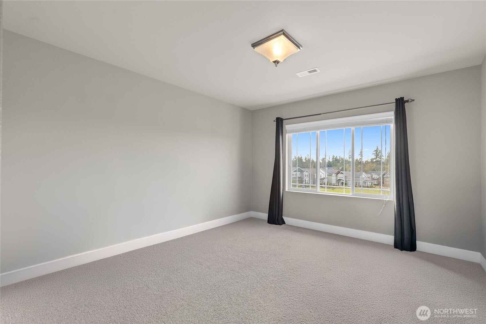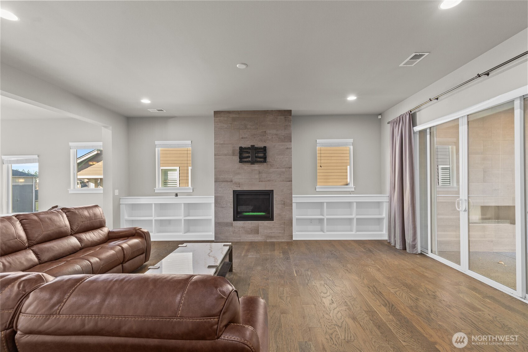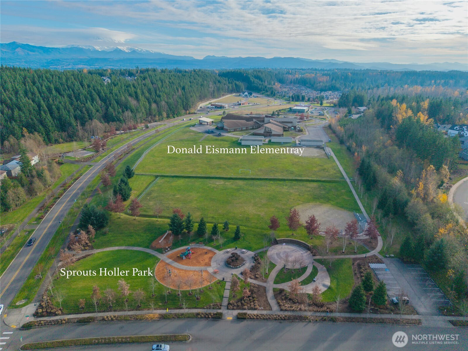 Enjoy year-round Mt. Rainier views from this Tehaleh home with a 3-car garage, A/C, and solar panels. Ideally across from a park and backing to a greenbelt, the community offers 40+ miles of trails, 10+ parks, expanding dining, retail, schools, and a mountain-bike park. Inside, hardwood floors lead to a chef’s kitchen with stainless steel appliances, oversized island, and built-in speakers. A main-level den/bedroom with a balcony adds flexible space. Upstairs, the primary suite has a spa-like 5-piece bath and dual walk-in closets, plus an oversized family room. The great room opens to covered outdoor living with fireplace, expanded patio, hot tub, and fenced yard with trail access. A rooftop deck with gas firepit captures Mt. Rainier views.