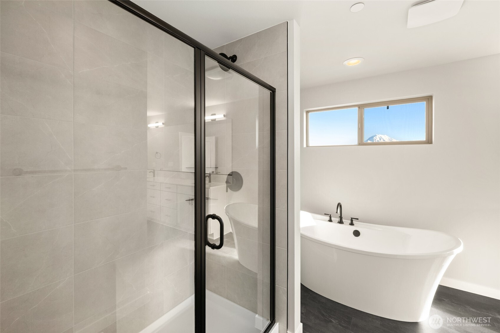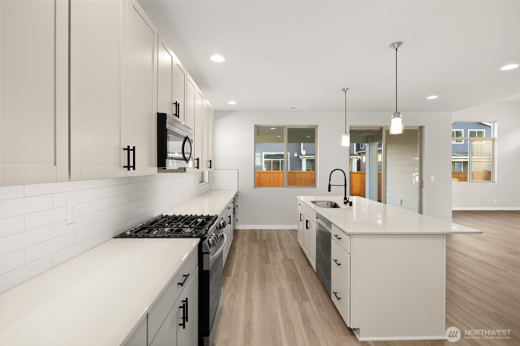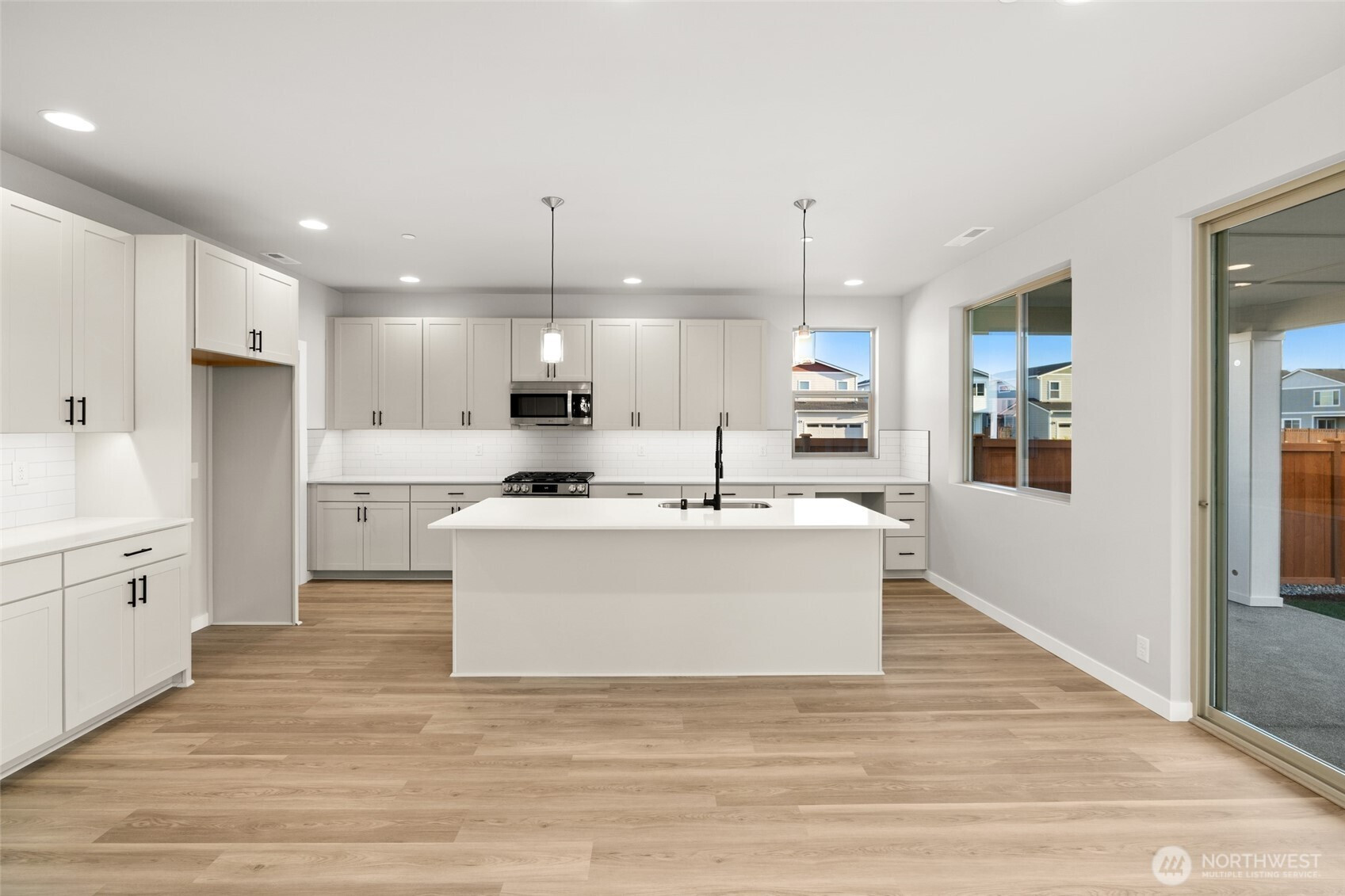 Experience the Conner Difference - where thoughtful design, quality craftsmanship, and everyday functionality shine. Covered front porch welcomes you into a light-filled foyer leading to a spacious great room with soaring 12-foot ceilings & expansive windows. Chef-inspired kitchen features walk-in pantry w/outlet, 5-burner gas range, generous counter space, soft close cabinetry, undermount farmhouse sink & under-cabinet lighting. Additional dedicated tech space for homework or remote business. Enjoy indoor-outdoor living with great room access to outdoor covered living overlooking fully fenced backyard. Main-level guest suite has attached ¾ bath for multigenerational living or guests. Upstairs, an open loft and four additional bedrooms, full bath, laundry room with extra cabinetry. Spacious primary suite offers vaulted ceilings, oversized walk-in closet, spa-inspired 5-piece bath has freestanding soaking tub, dual sinks, full tile shower with glass door. 3-minute walk to community clubhouse featuring gym, pools, hot tub, media room, meditation pond & unbeatable Mt Rainier views plus numerous nearby walking trails. Limited lots available with 3,022 sq ft Hawk plan, largest at Uplands, offering 5 bedrooms & 3.25 baths and main level suite.