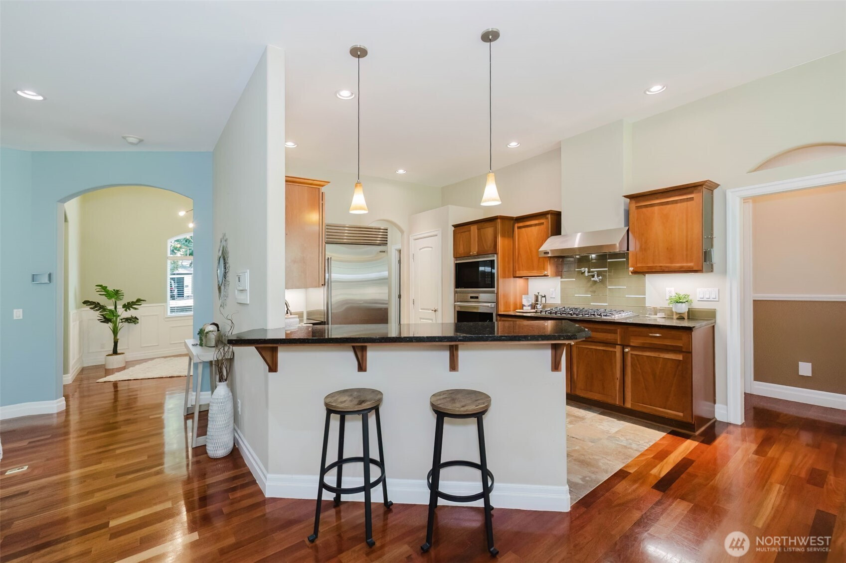 Level .7 acre yard is fully fenced and beautifully landscaped with a new 8'x10' glass greenhouse, a peaceful retreat on the patio. The All-Stainless/Granite Kitchen with 6-Burner Wolf Propane Range w/Pot Filler, Miele Dishwasher, Sub Zero Fridge. Formal Dining Room plus Off-Kitchen dining. Primary Bedroom with Cozy Fireplace, two Walk-in Closets, 5-piece Bath with Tiled Floors. Upstairs bonus room. The 3-Car Detached Garage/Shop is a whopping 960 Sq Ft heated & cooled with mini split. Above is a custom built 672 Sq Ft Studio w/2nd Kitchen and 3/4 bath for Poker Nites or perhaps a Custom Theater. Both Garages furnished with 8' high California Custom Self Closing Closets for plenty of Storage! Bonus- Includes a Whole House Generator.
