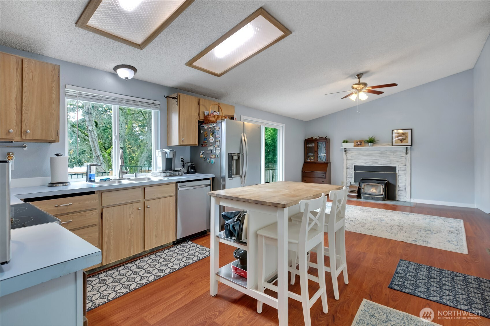 Rare one-story Puyallup rancher with a sizeable fully-fenced yard (0.29 acres) and 2 large skylights to allow for natural light year-round. There is an expansive deck on the back of the home with power outlets for entertaining or relaxing. The home has lots of updates including beautiful custom tile in bathrooms, exterior and interior paint, shed, and sliding glass door; vinyl windows, newer roof, gutters replaced in last 10 years. Other improvements include the serviced furnace and a new water heater (replaced Summer '25). The kitchen island will remain with the home at the time of sale. The attic storage spans half of the sq ft of the home, allowing for plenty of storage. Garage has amazing storage that will stay. Don't miss this one!