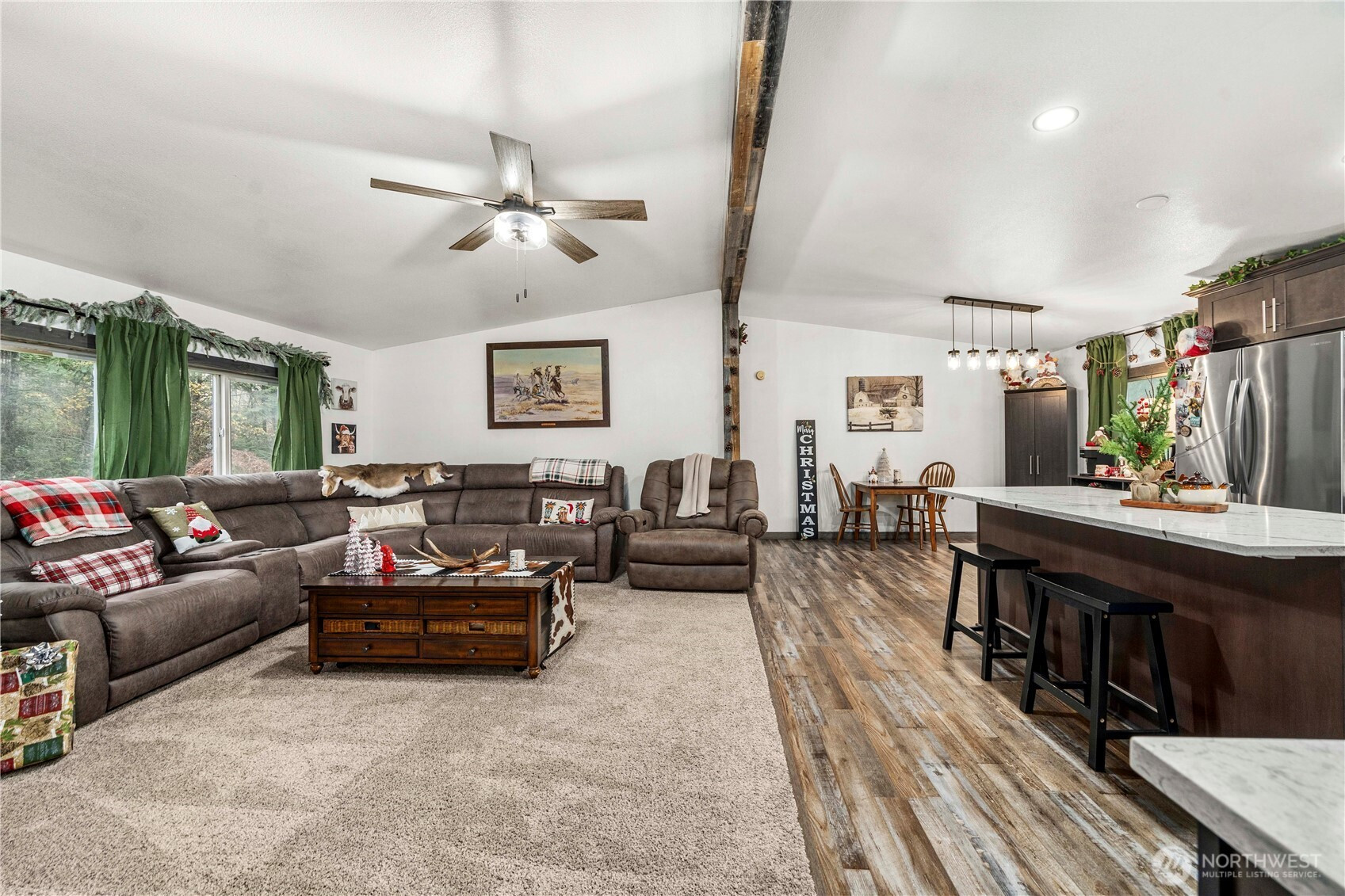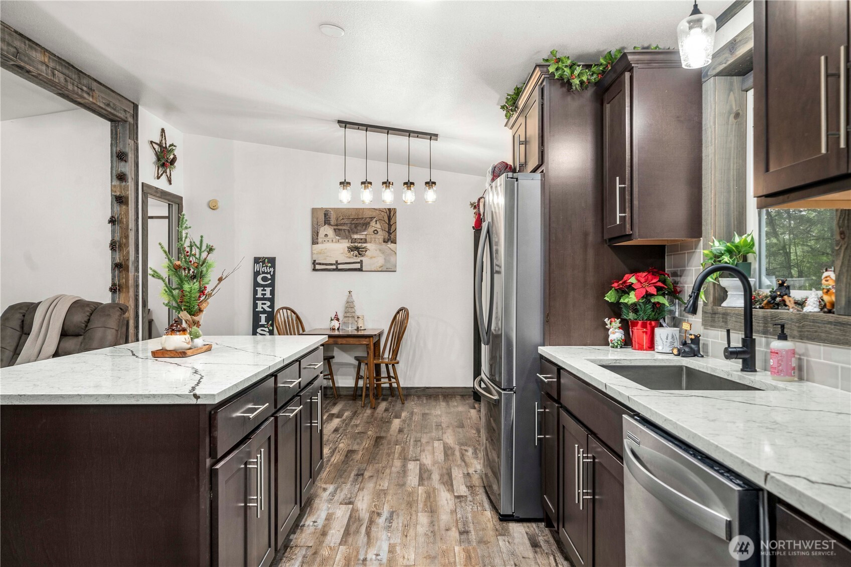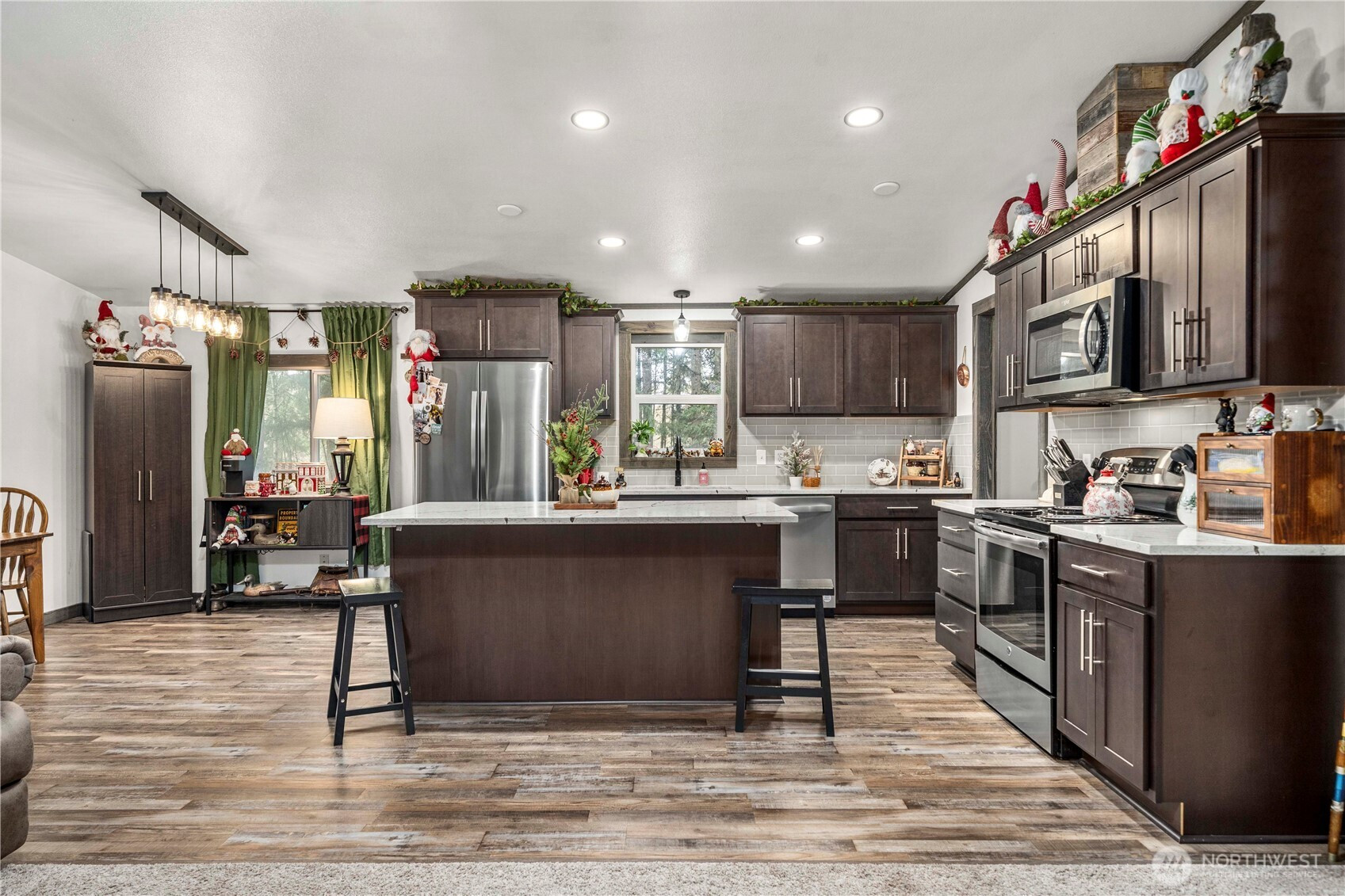 *Escape to your private retreat on serene & tranquil 1.7 acres w/ detached shop!* Come unwind by the fire-pit and enjoy peace & nature at every turn. Conveniently located at the end of the street, this single level home features: *Great Room concept* w/ beautifully remodeled kitchen, center island & breakfast bar perfect for entertaining, espresso shaker styled cabinetry, quartz cntrtps, LVP flooring & SS Appls! Relax in your primary en-suite w/dble sinks, quartz cntrtps, tub/shower combo + WI closet. On the opposite side of the home you'll find 2 good sized bdrms with adjacent bath. DETACHED SHOP has a HUGE Rec Room, ideal for hobbies or a home business. *New metal roof*, RV hook up, plentiful parking & NO HOA! Privacy & convenience await!
